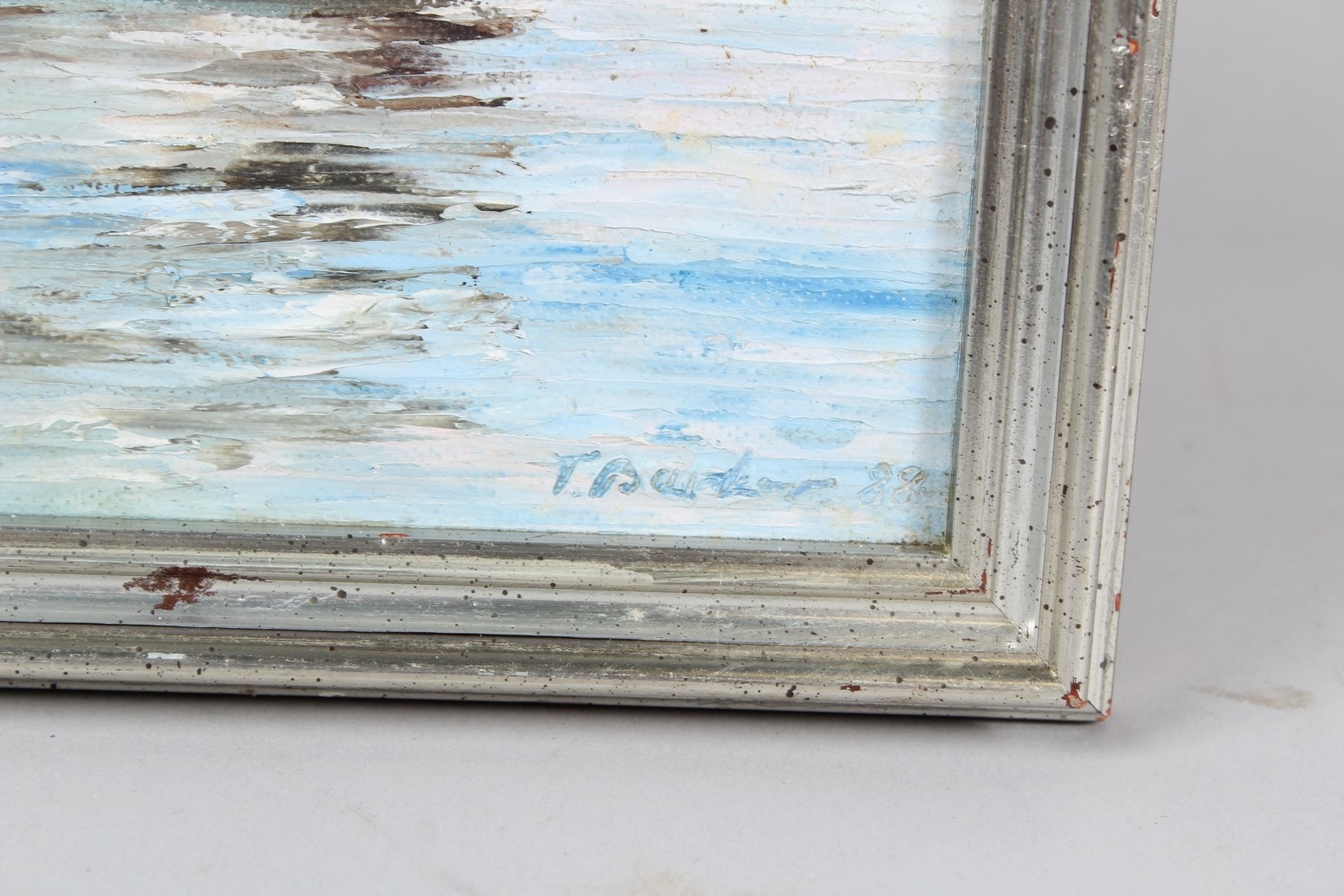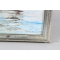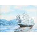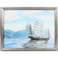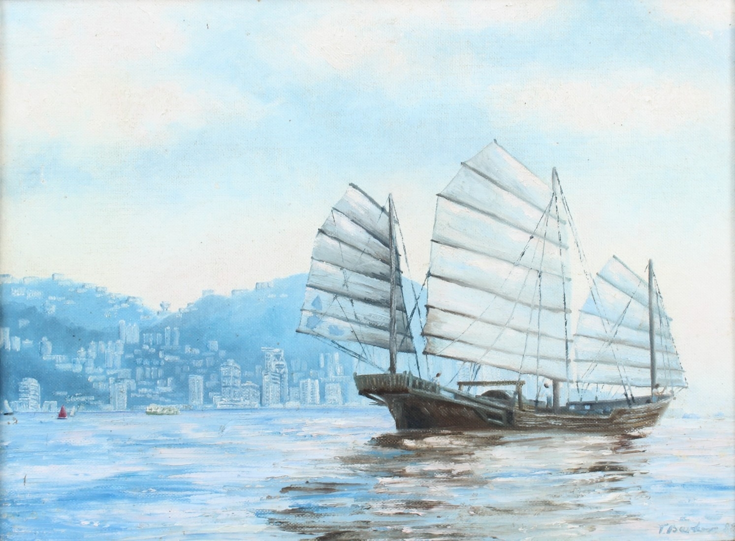 T BARKER 'Junk in early morning on Victoria Harbour Hong Kong oil on canvas board signed inscribed verso 30.5 x 40.5cm