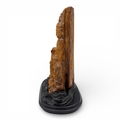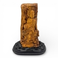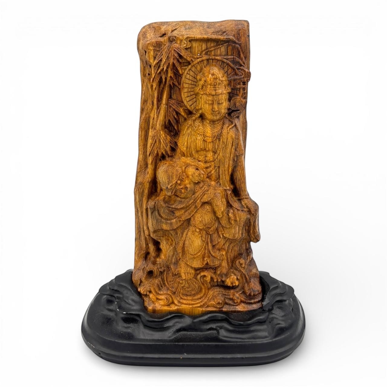 A wonderful Natural agarwood hand-carved relief depicting a seated Buddhist figure accompanied by a child beneath bamboo and halo.