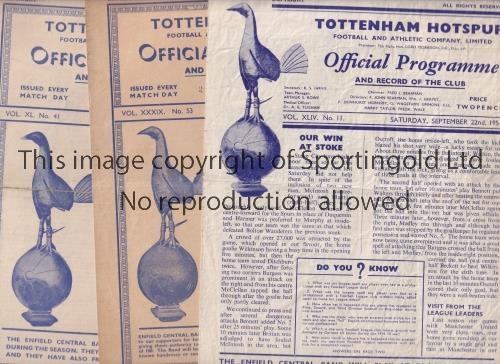 TOTTENHAM HOTSPUR Seven programmes: 6 homes v Man. Utd. 51/2 poor, Barnsley 46/7 X 2, one slightly worn and the other is worn and tears, 47/8 poor, 48/9, 49/50 and away v Dunfermline 70/1 Texaco Cup, slightly creased. Poor to fair