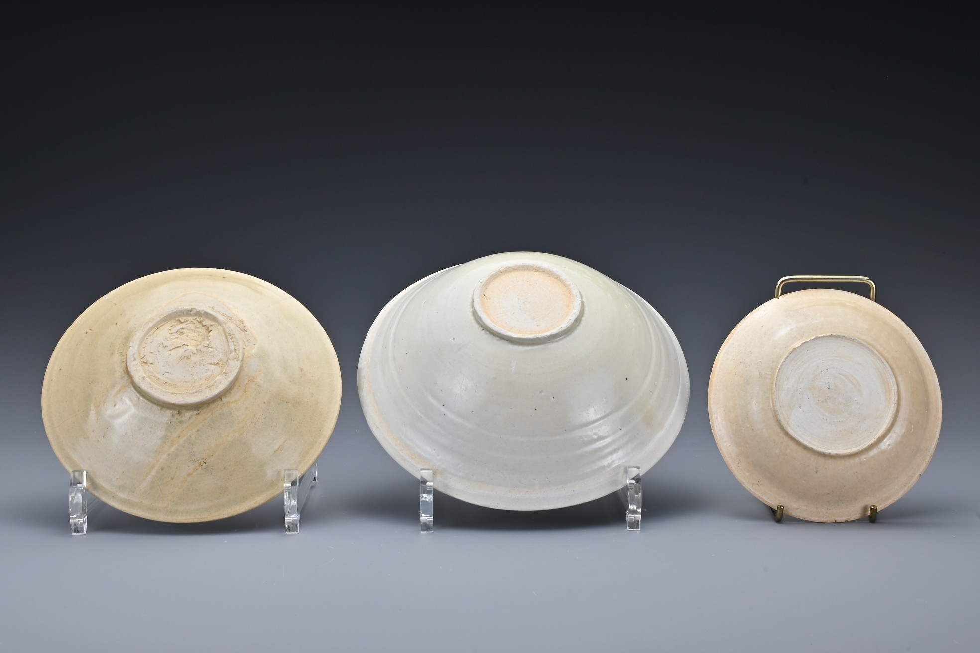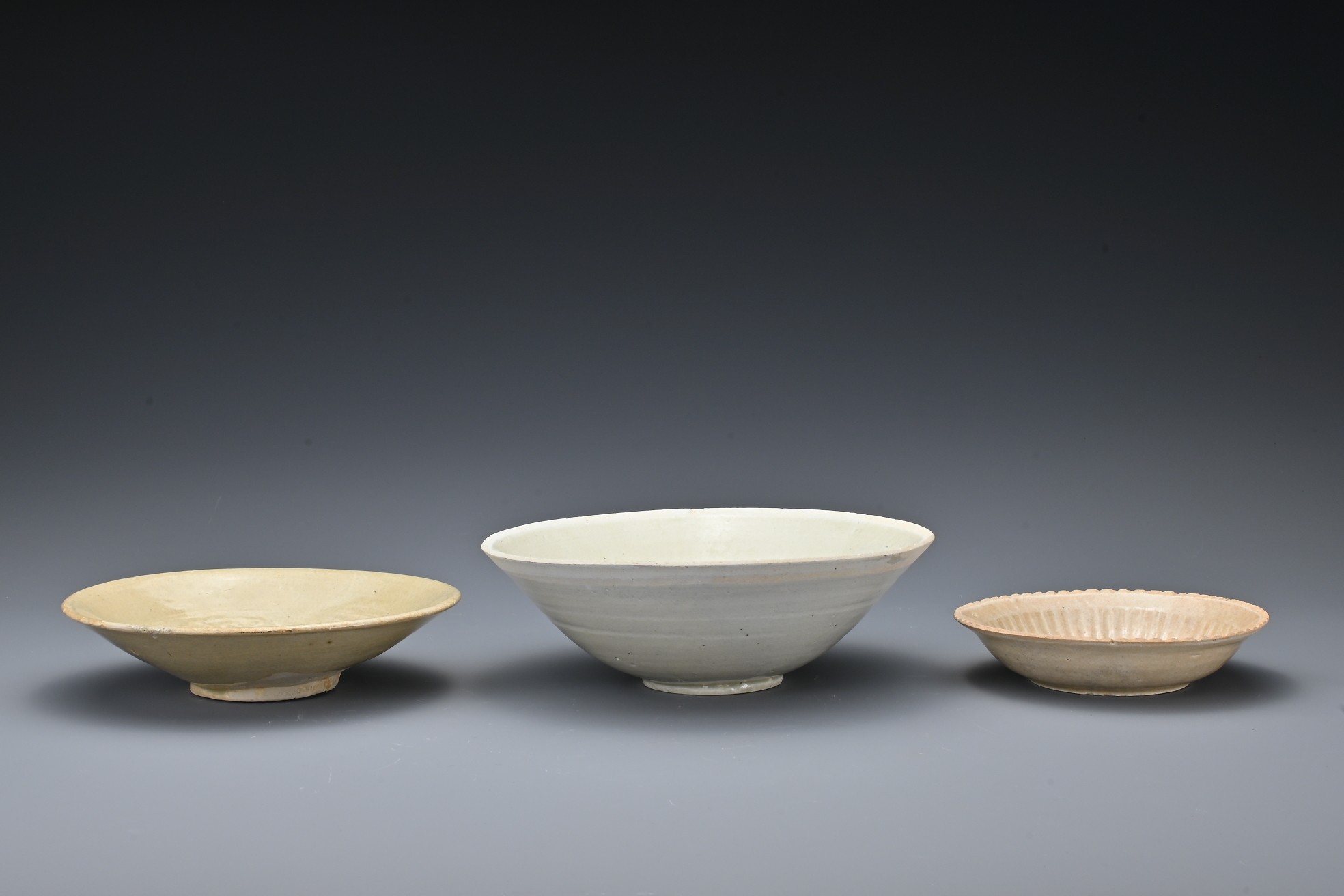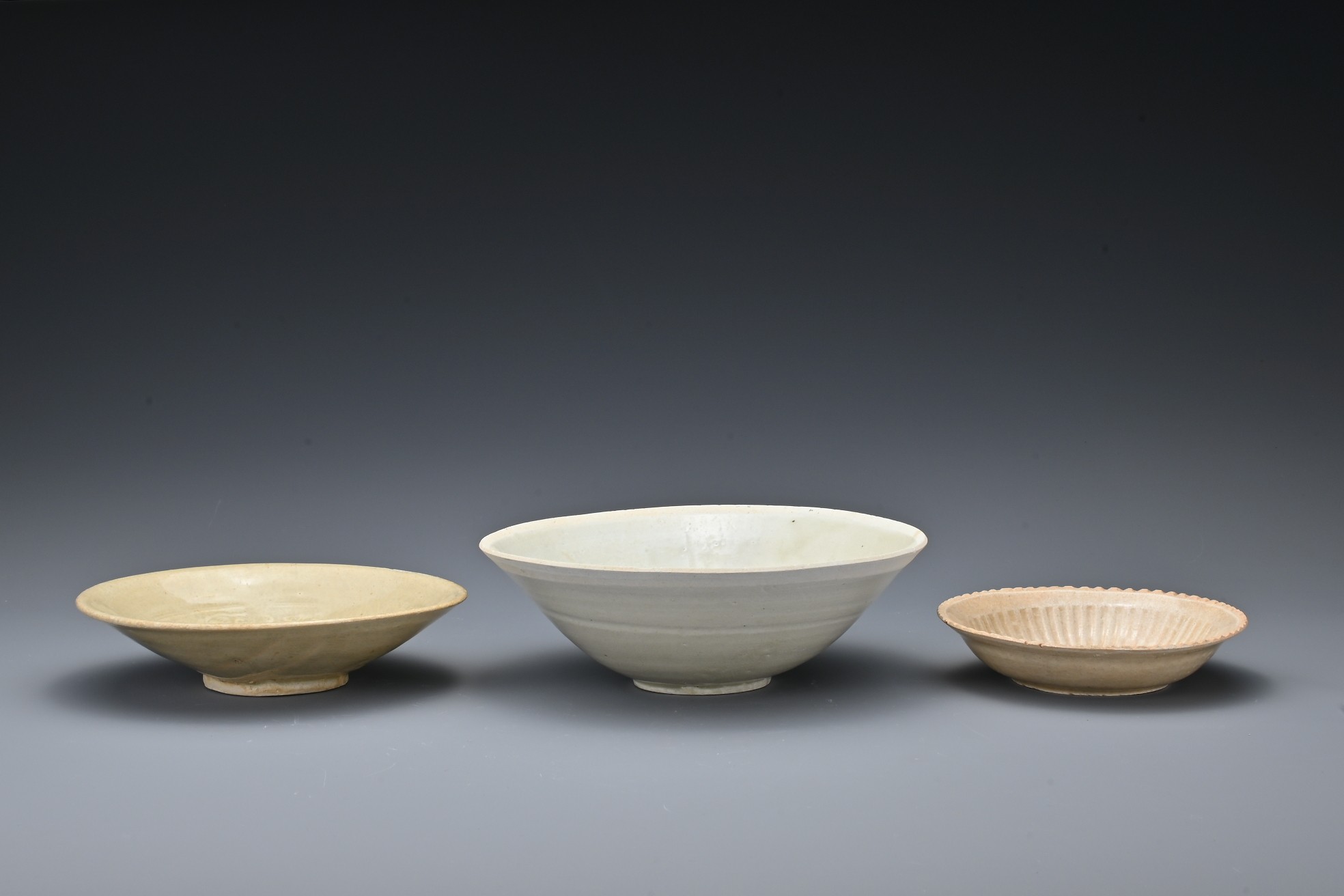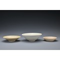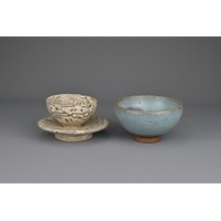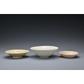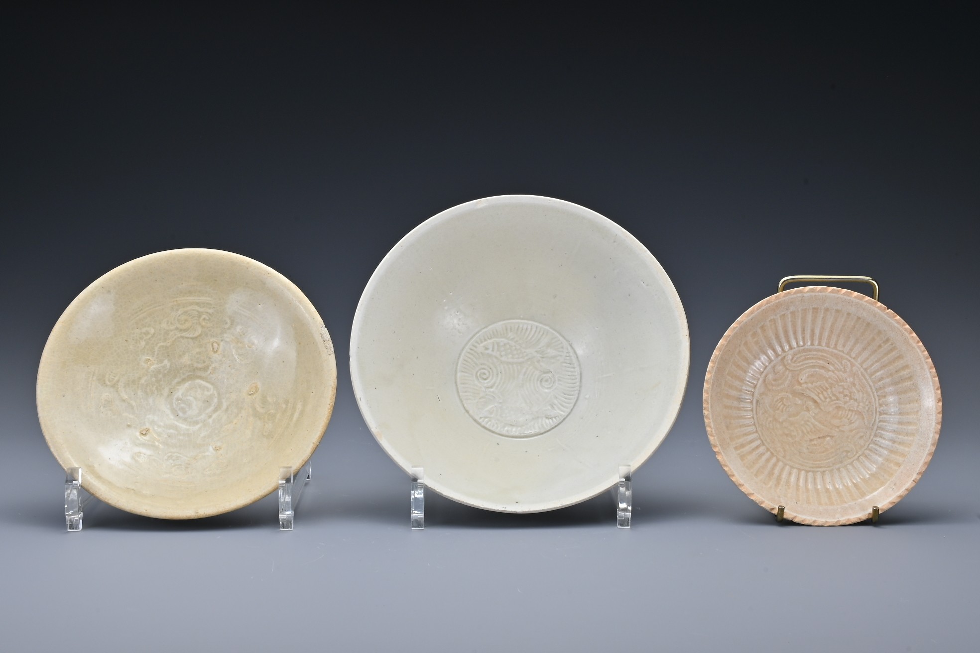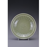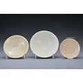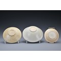 Three Chinese Southern Song Dynasty (1127-1279) ceramic items. To include a 'twin fish' bowl, a moulded 'twin phoenix' dish and a moulded shallow dish thickly-potted, covered in a light olive-green glaze and five spur marks to the interior of the bowl. Diam. 12-17cm (3)