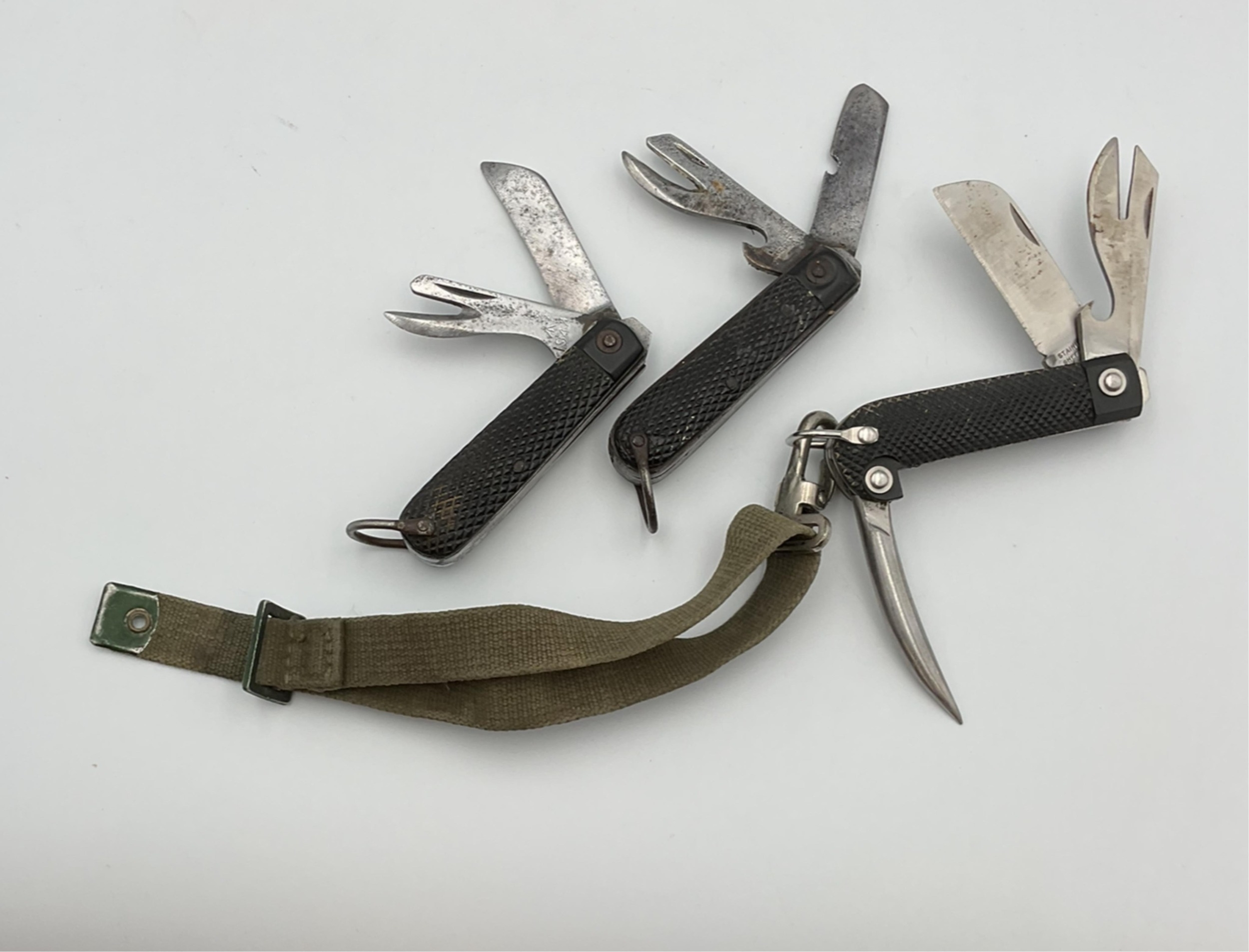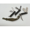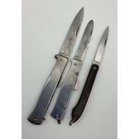 WWII military issue British army knife, with broad arrow mark to blade and dated 1944, together with a unmarked example and a Jack Knife with Marlin Spike and Tin Opener. (3)
