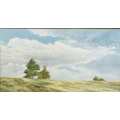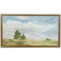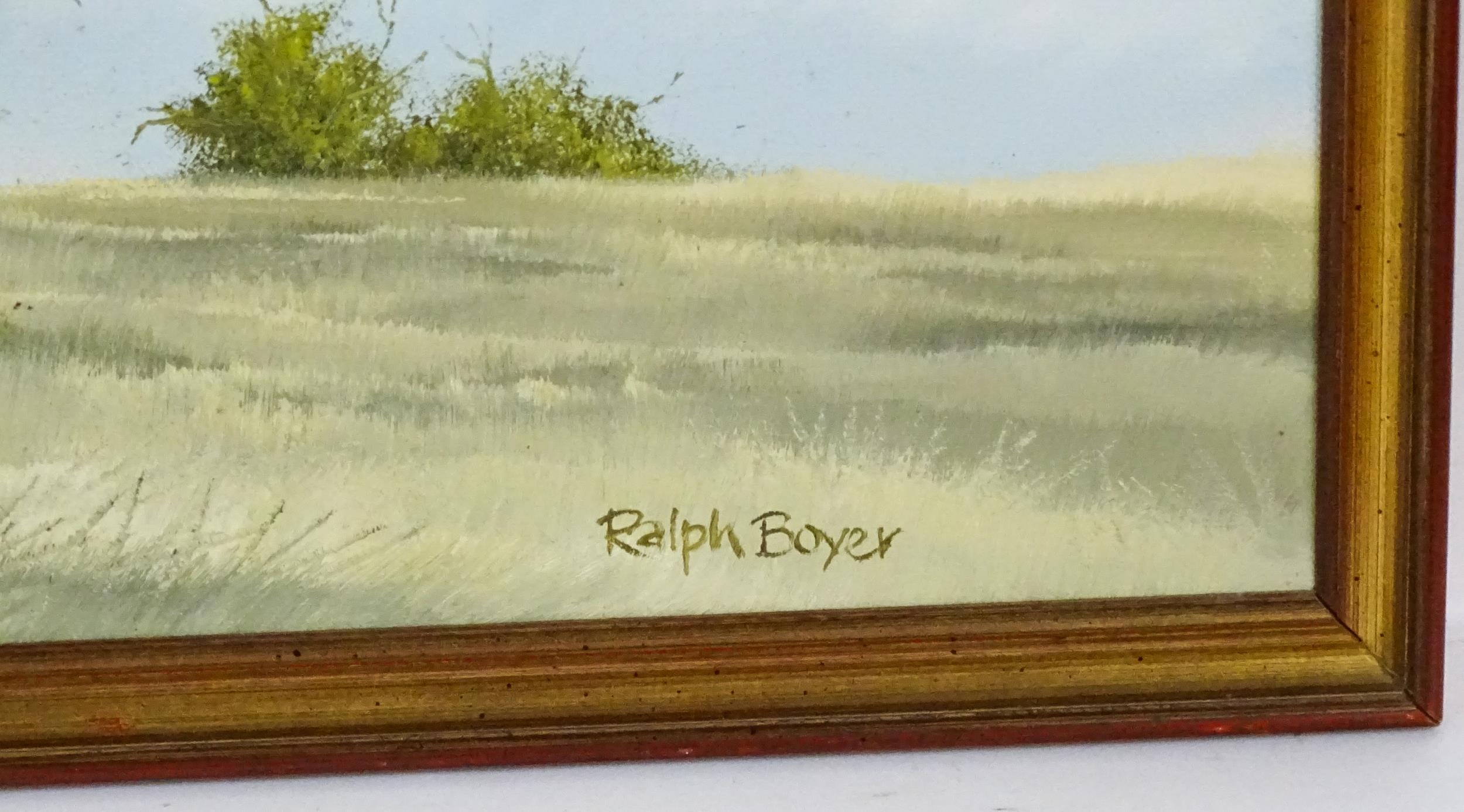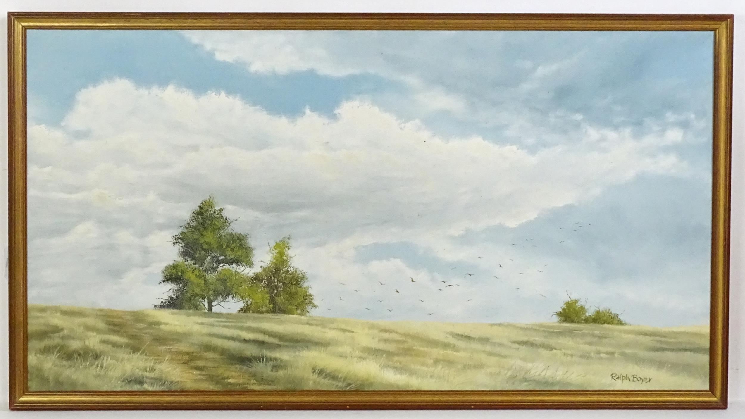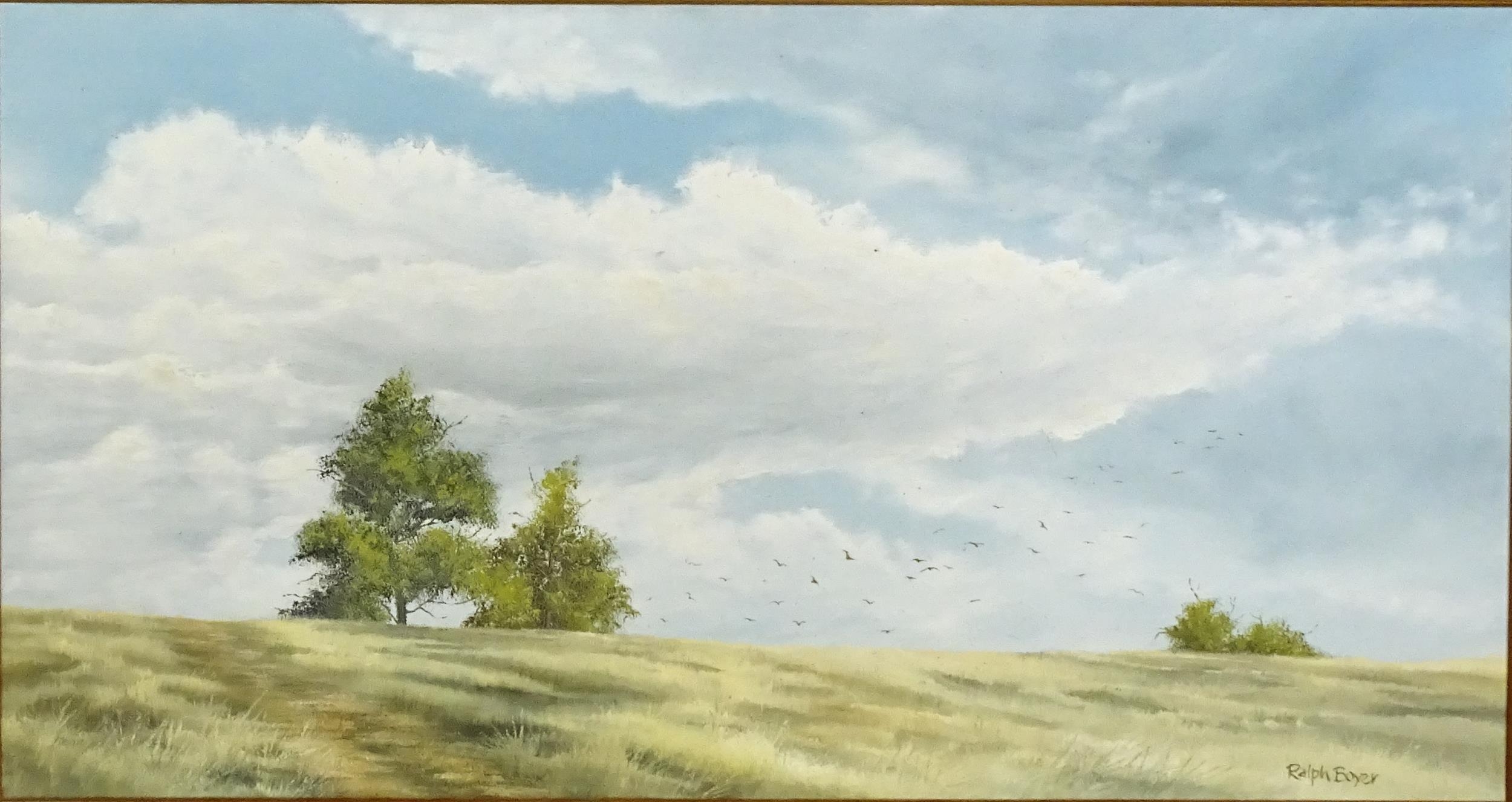 Ralph Boyer, 20th century, Oil on canvas, A landscape scene with birds in flight. Signed lower right. Approx. 15 1/2" x 29 3/4"