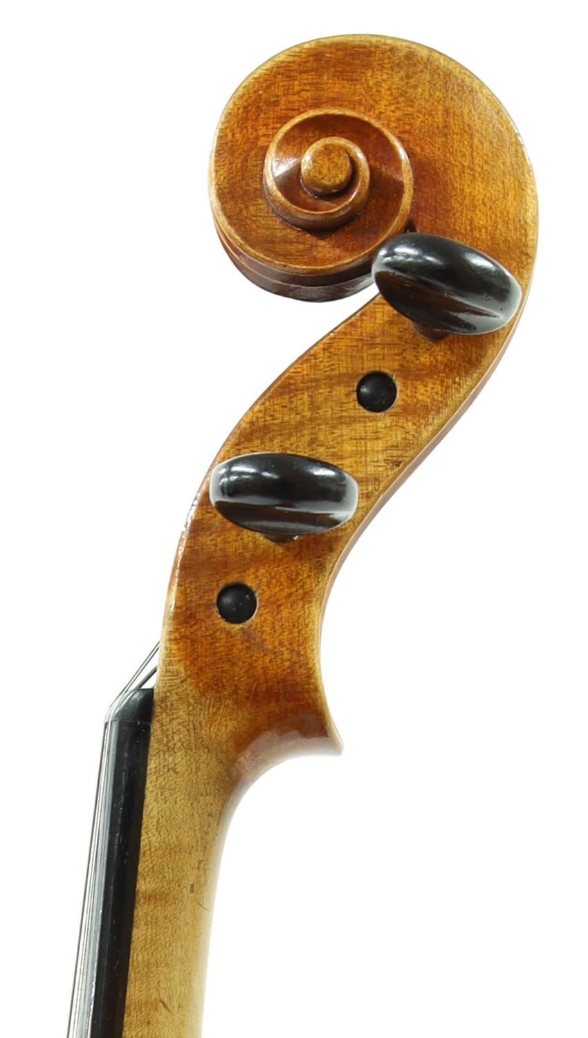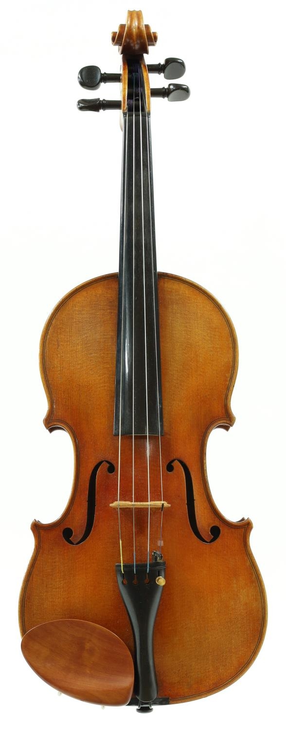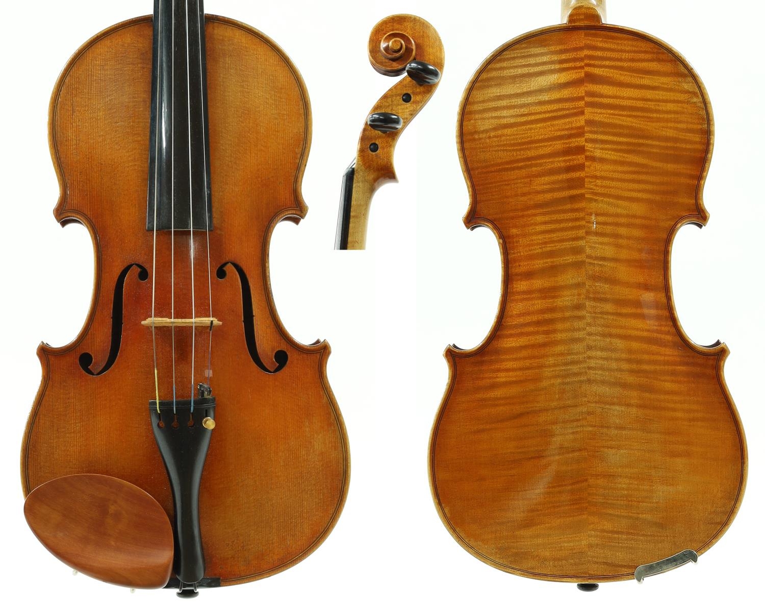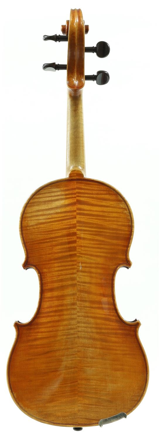 Good violin labelled Made for Hart & Son, 28, Wardour Street, London.W., the two piece back of faint medium curl with similar wood to the sides, the head of plainish wood, the table of a fine width grain and the varnish of a golden-brown colour, 14 3/16", 36cm