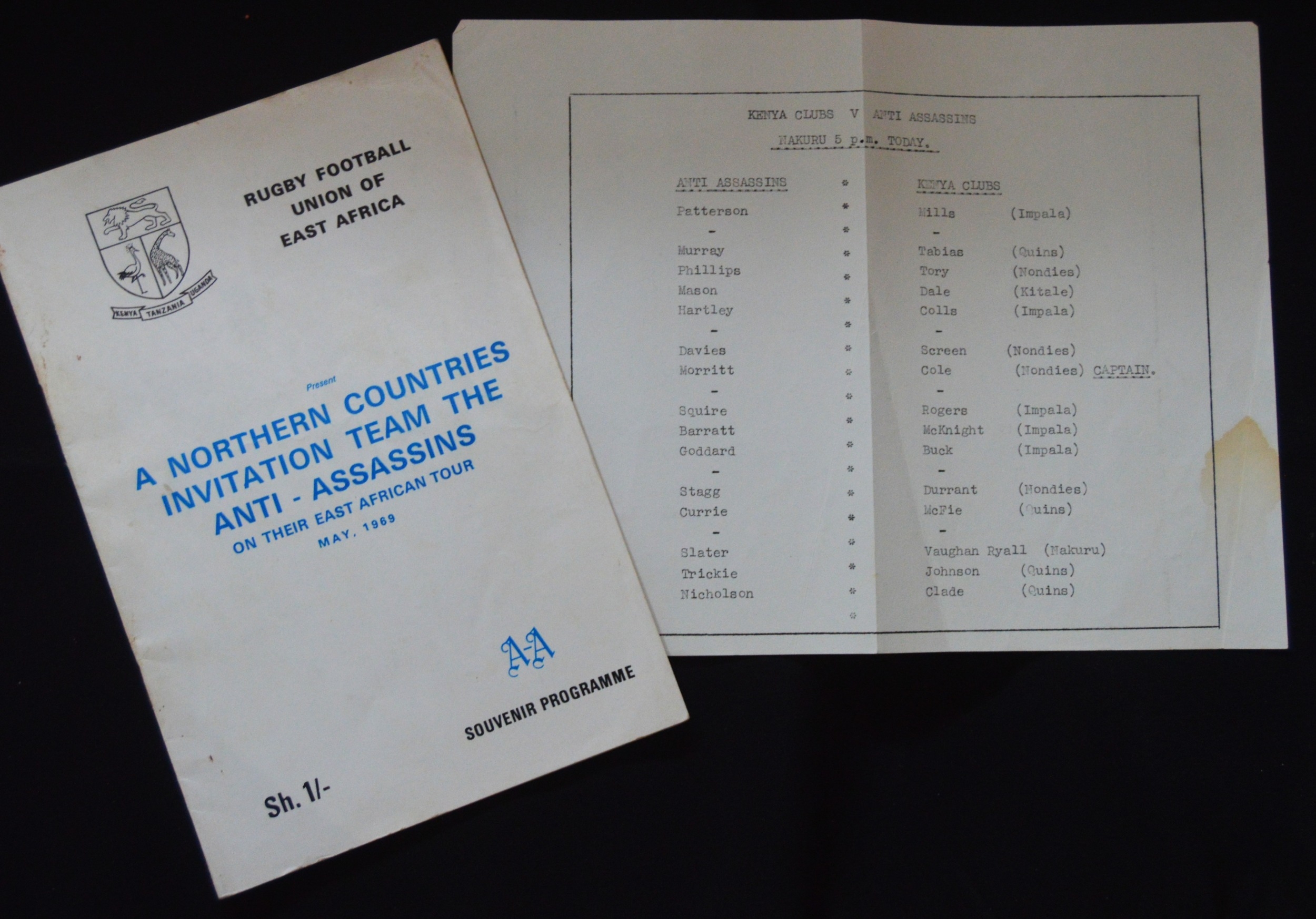 1969 Tourists Rugby Programmes in E Africa (2): Anti-Assassins UK in E Africa, substantial 28pp, and foldover team sheet v Kenya Clubs. VG