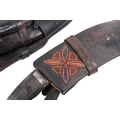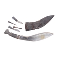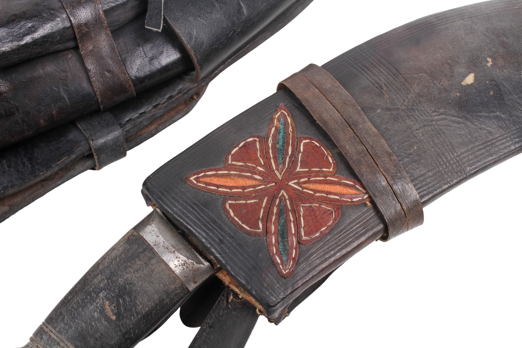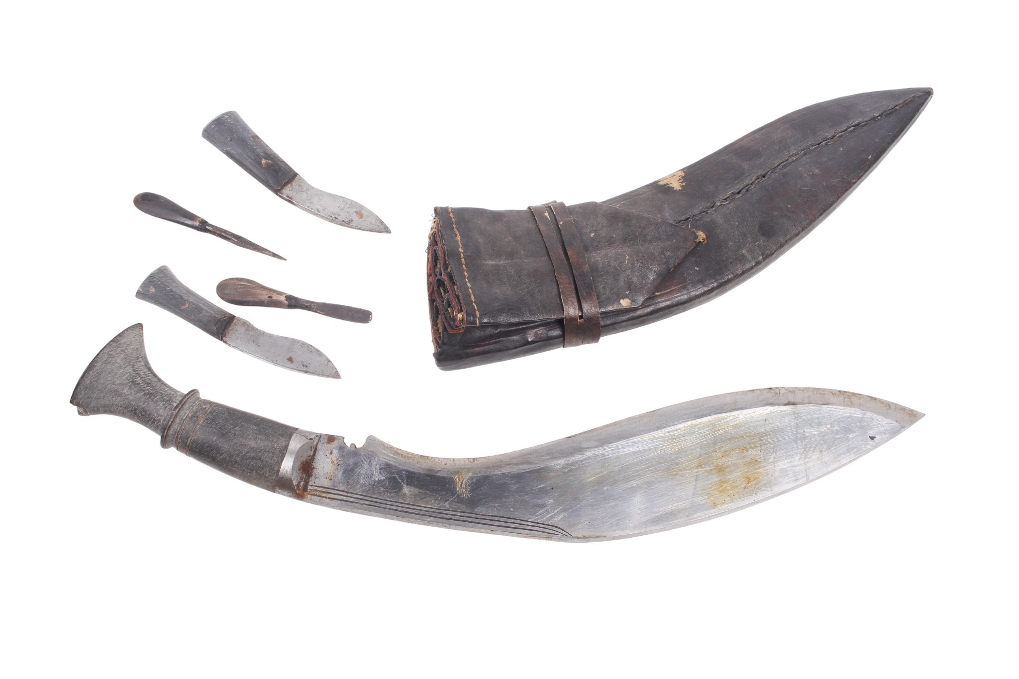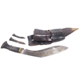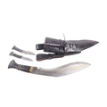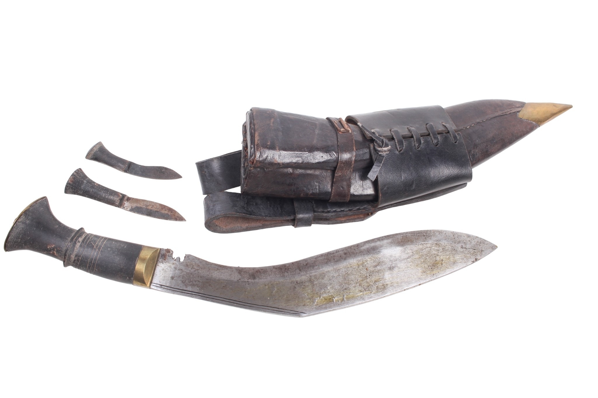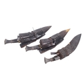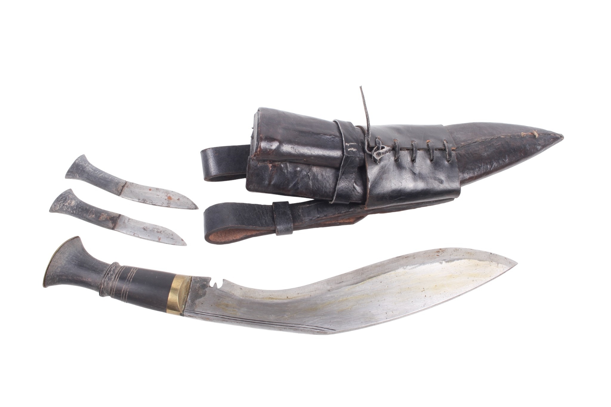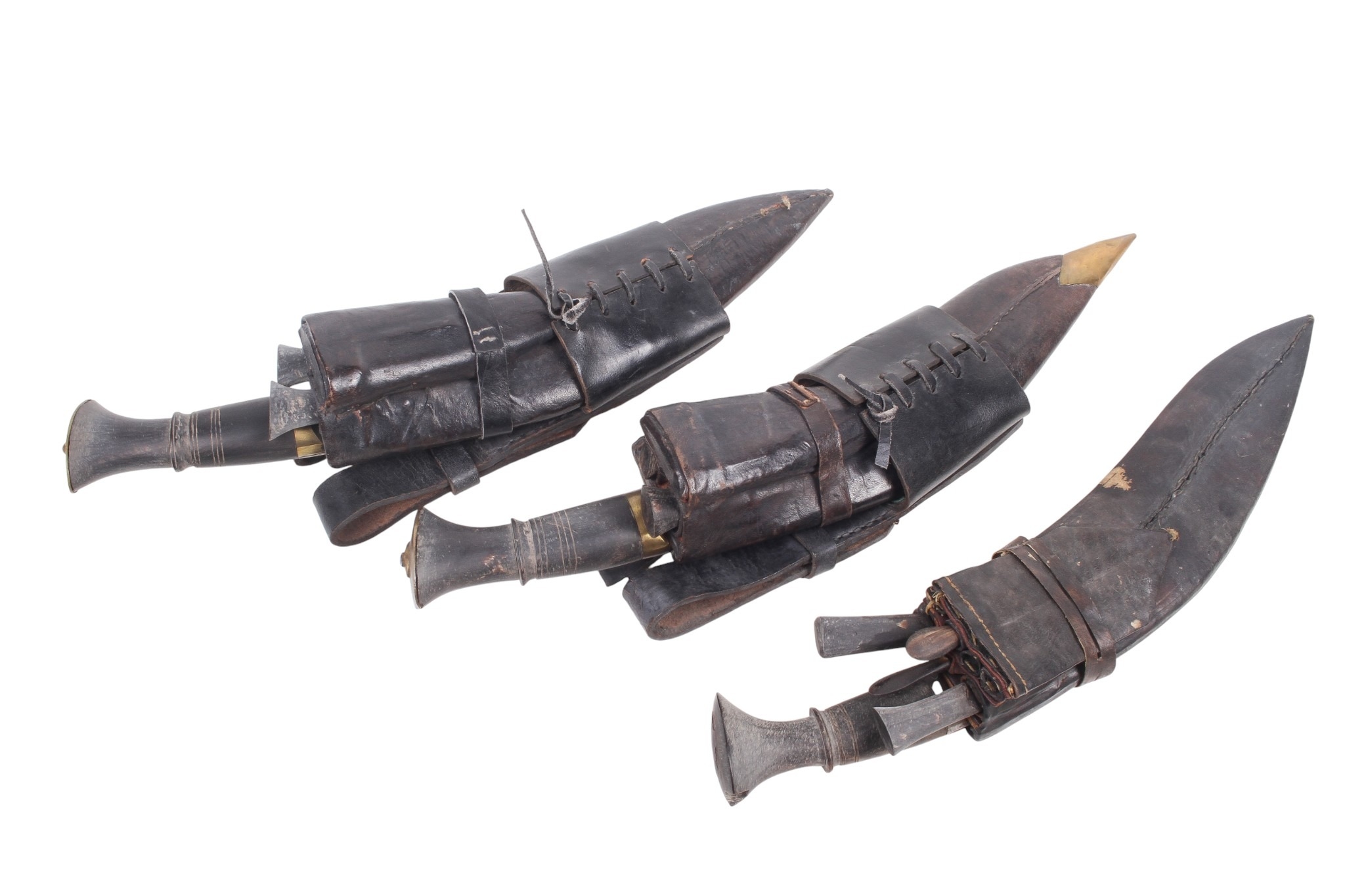 Three vintage Nepalese/Gurkha style kukri knife daggers. Of typical form with wooden hilts, brass rivets and collars and curved blades, all contained within leather cases fitted with additional knives, overall length approximately 43cm.