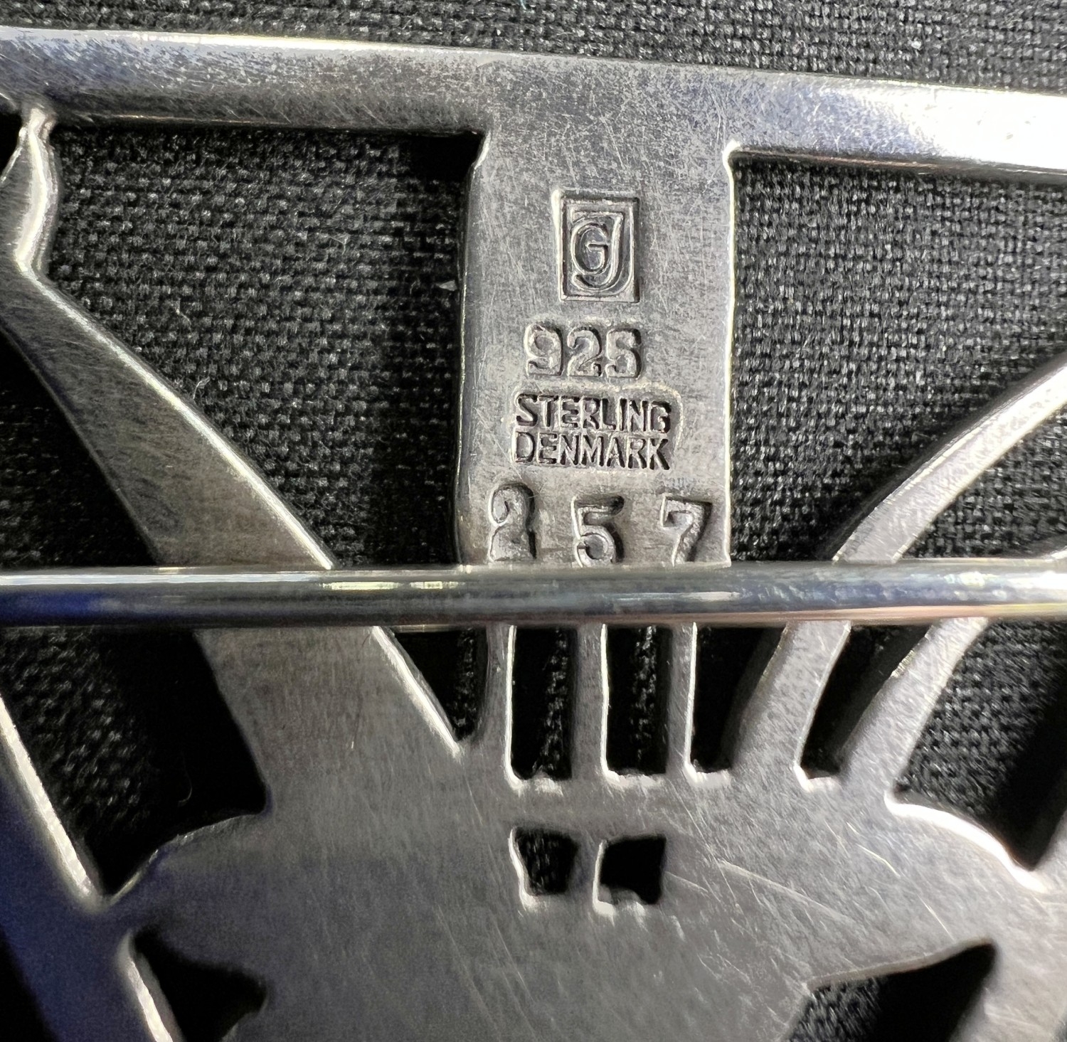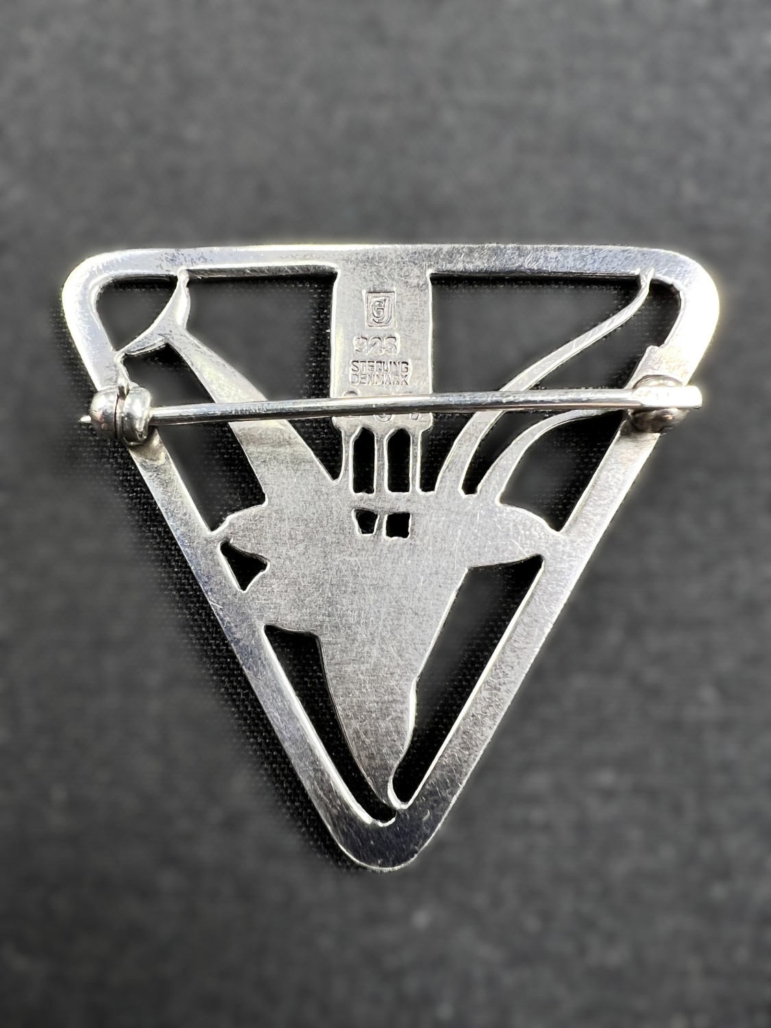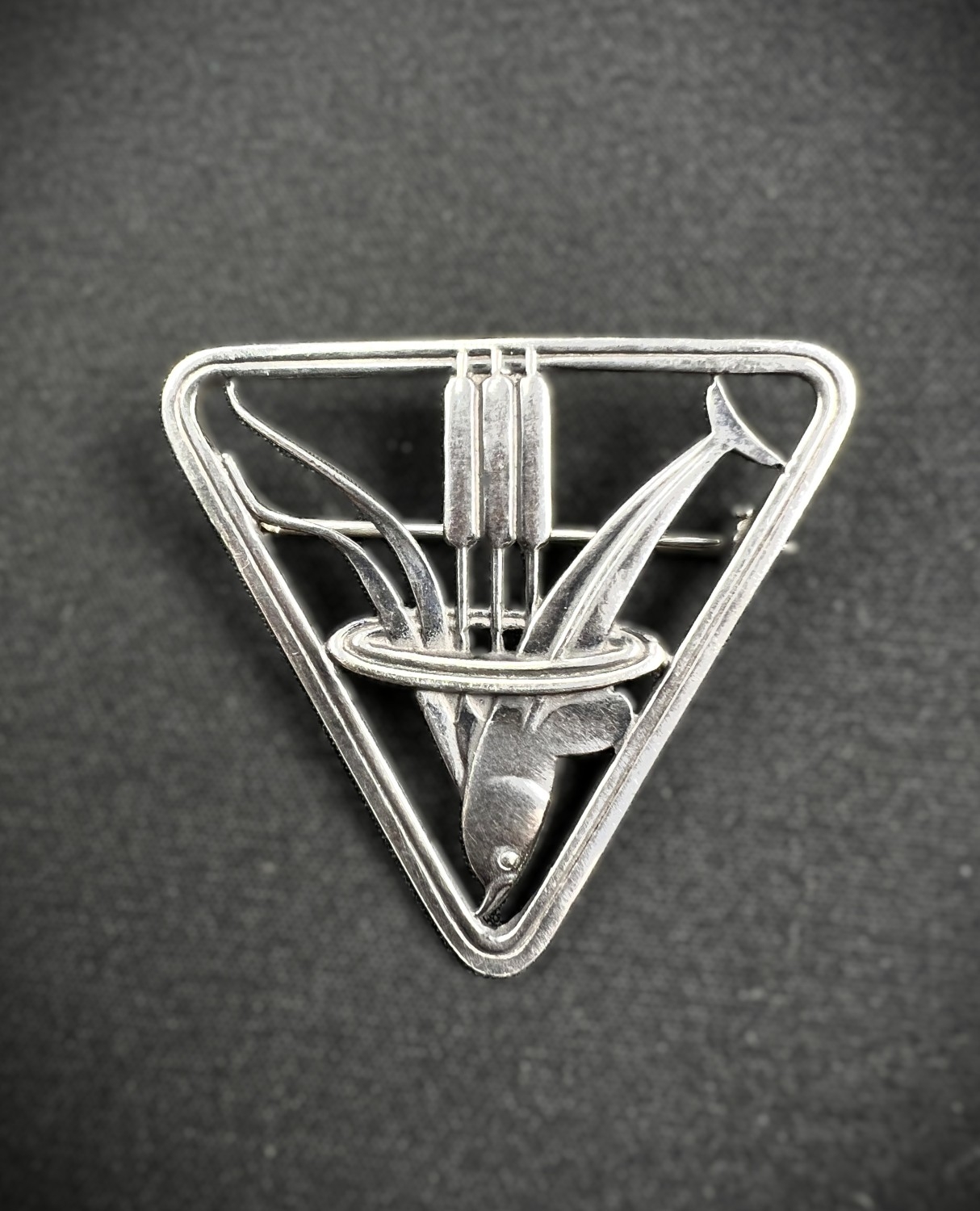 GEORG JENSEN: a triangular silver brooch with dolphin diving through bullrushes, stamped to reverse GJ 925 STERLING DENMARK, 257, 3.7cm, 8gm