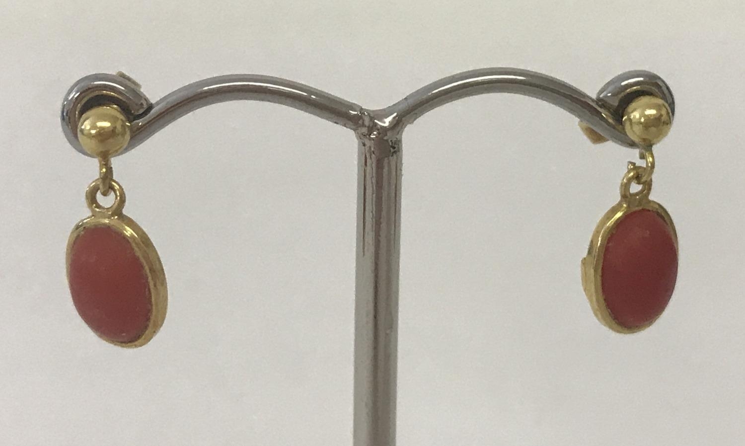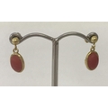 A pair of coral set,small oval, drop style earrings. Tests as 22ct gold.