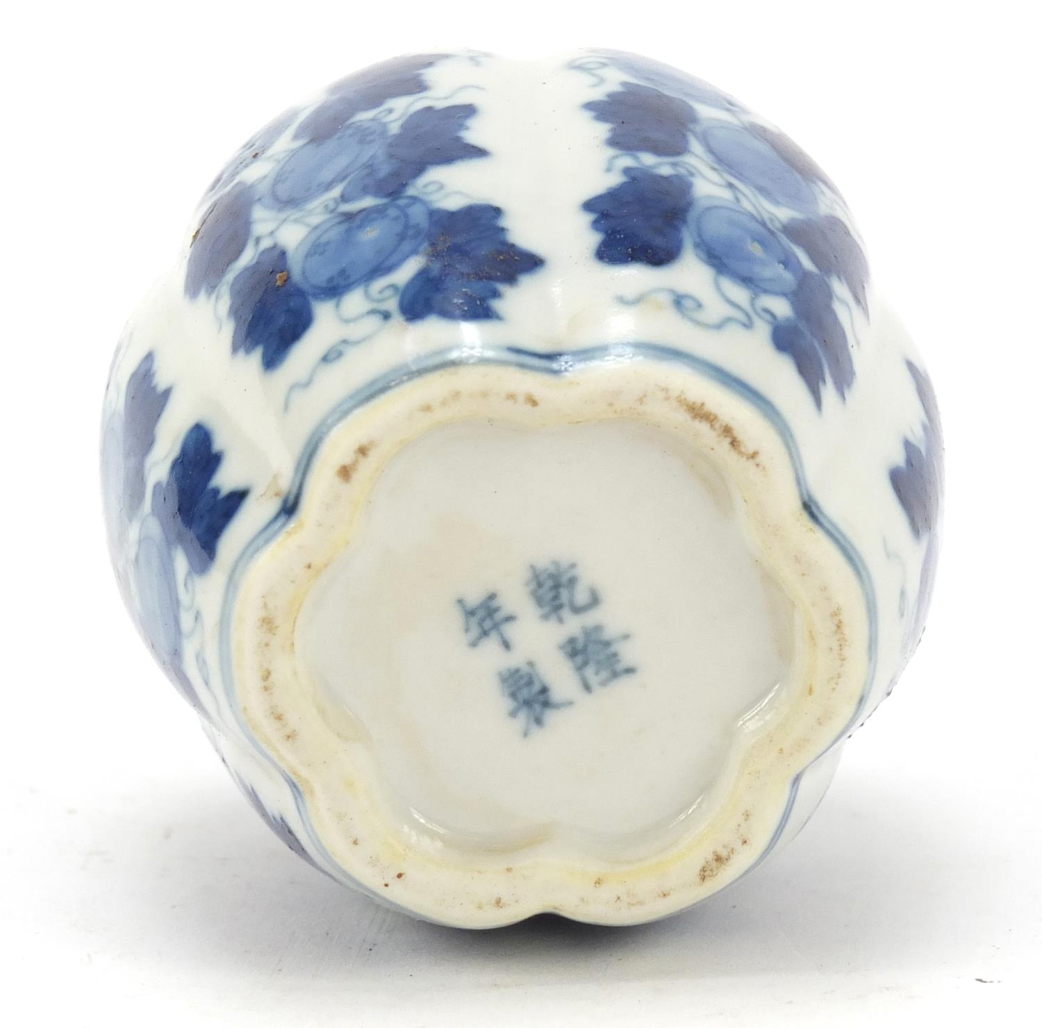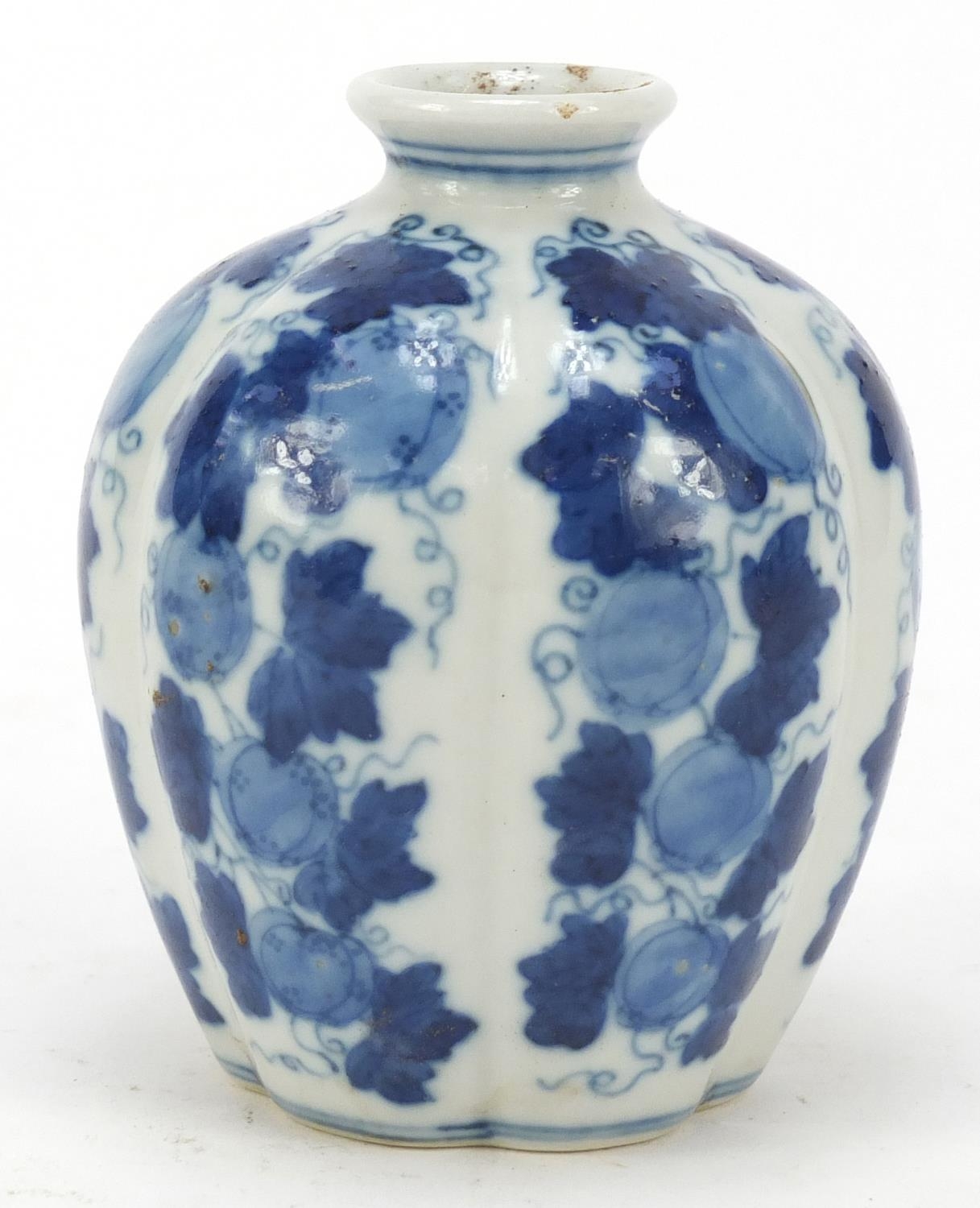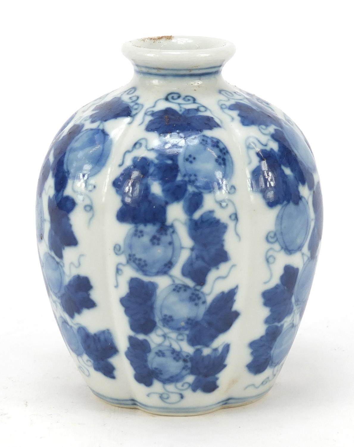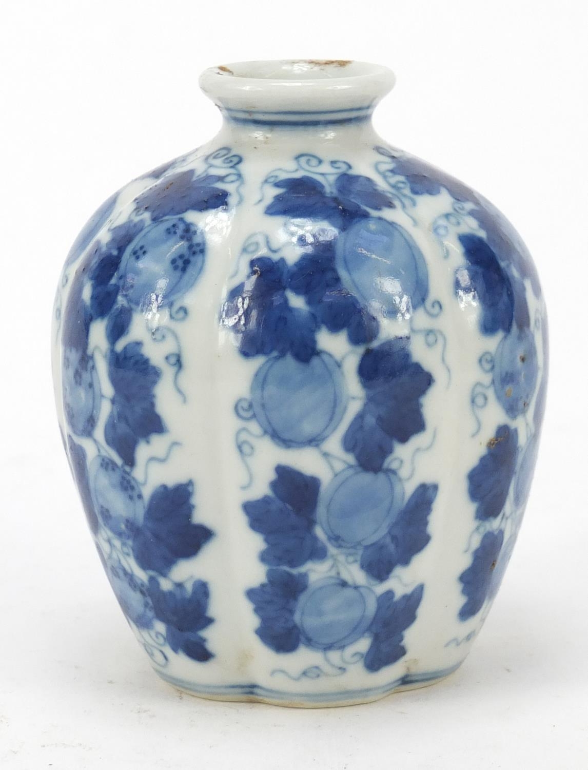 Chinese blue and white porcelain vase hand painted with fruit and leaves, four figure character marks to the base, 9cm high