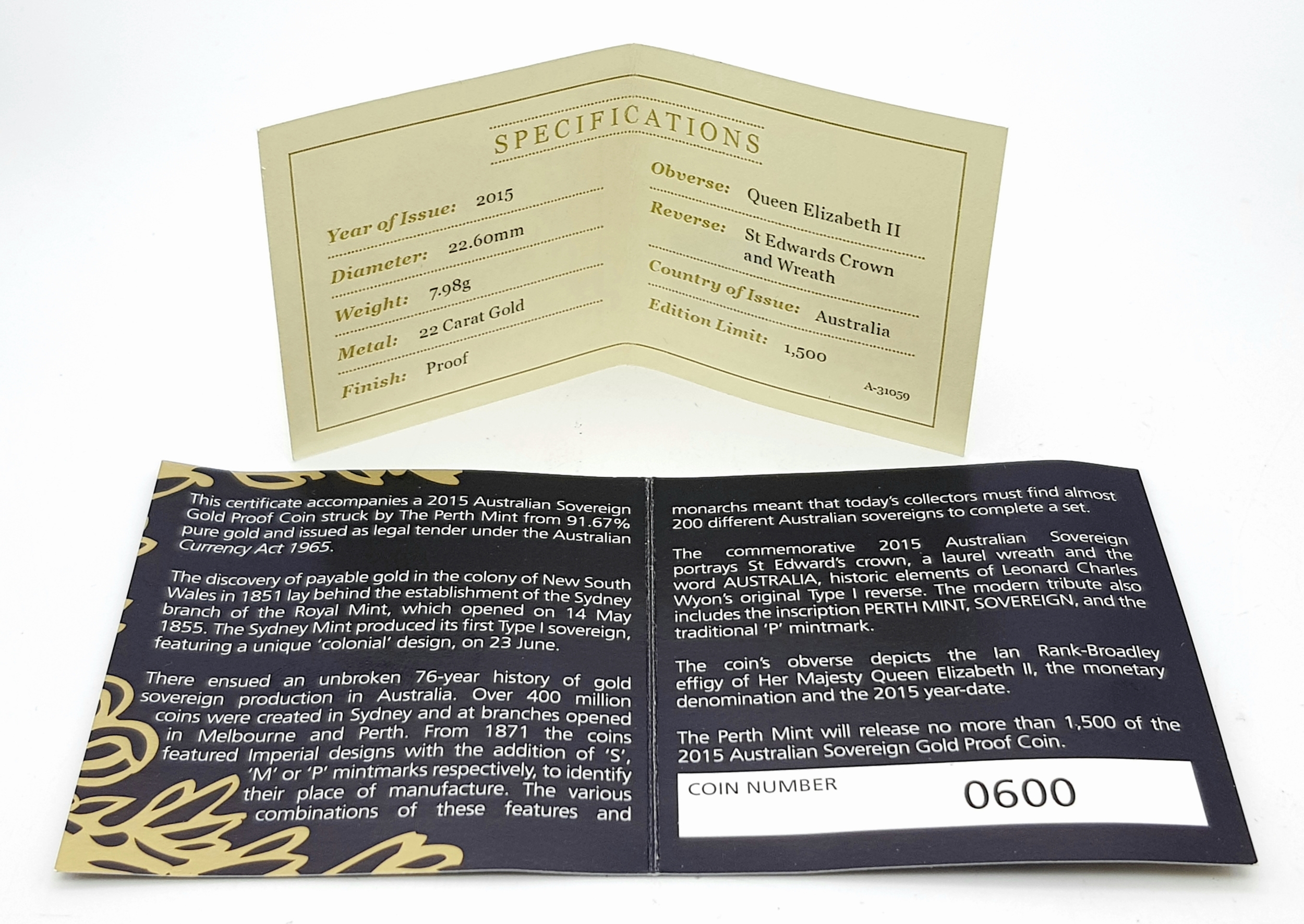 A Perth Mint 2015 Australian, Queen Elizabeth II Proof Gold Sovereign COIN. 22k gold. 7.98g. Only 1500 minted. Comes with a certificate of authenticity and presentation case. In excellent condition. A wonderful coin collectible or gift to hand down to loved ones.