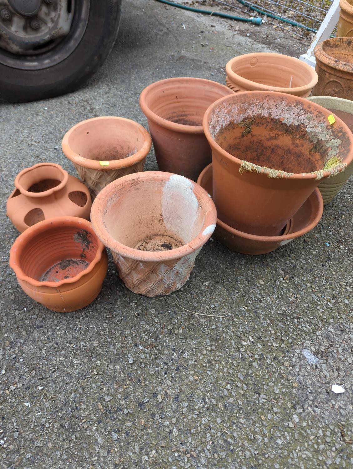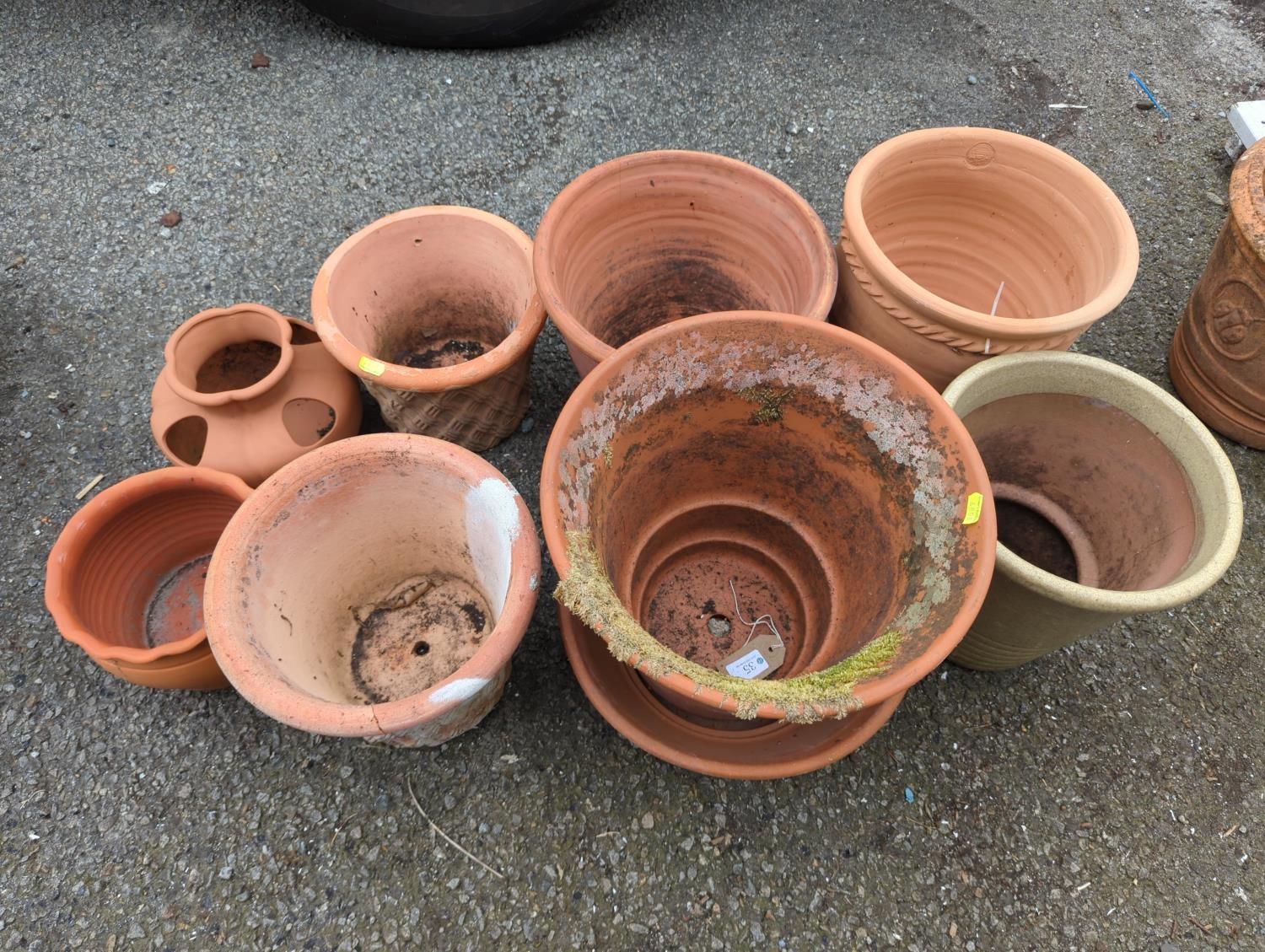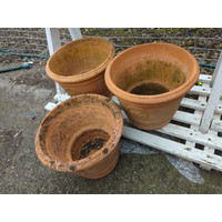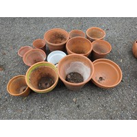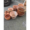 8 x terracotta + 1 x glazed planters. Largest Dia 31cm H31cm.