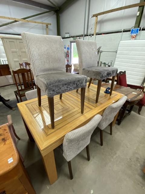 Outlook oak extending dining table 79H 164W 204-294D & 6 upholstered chairs