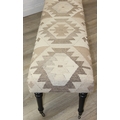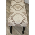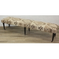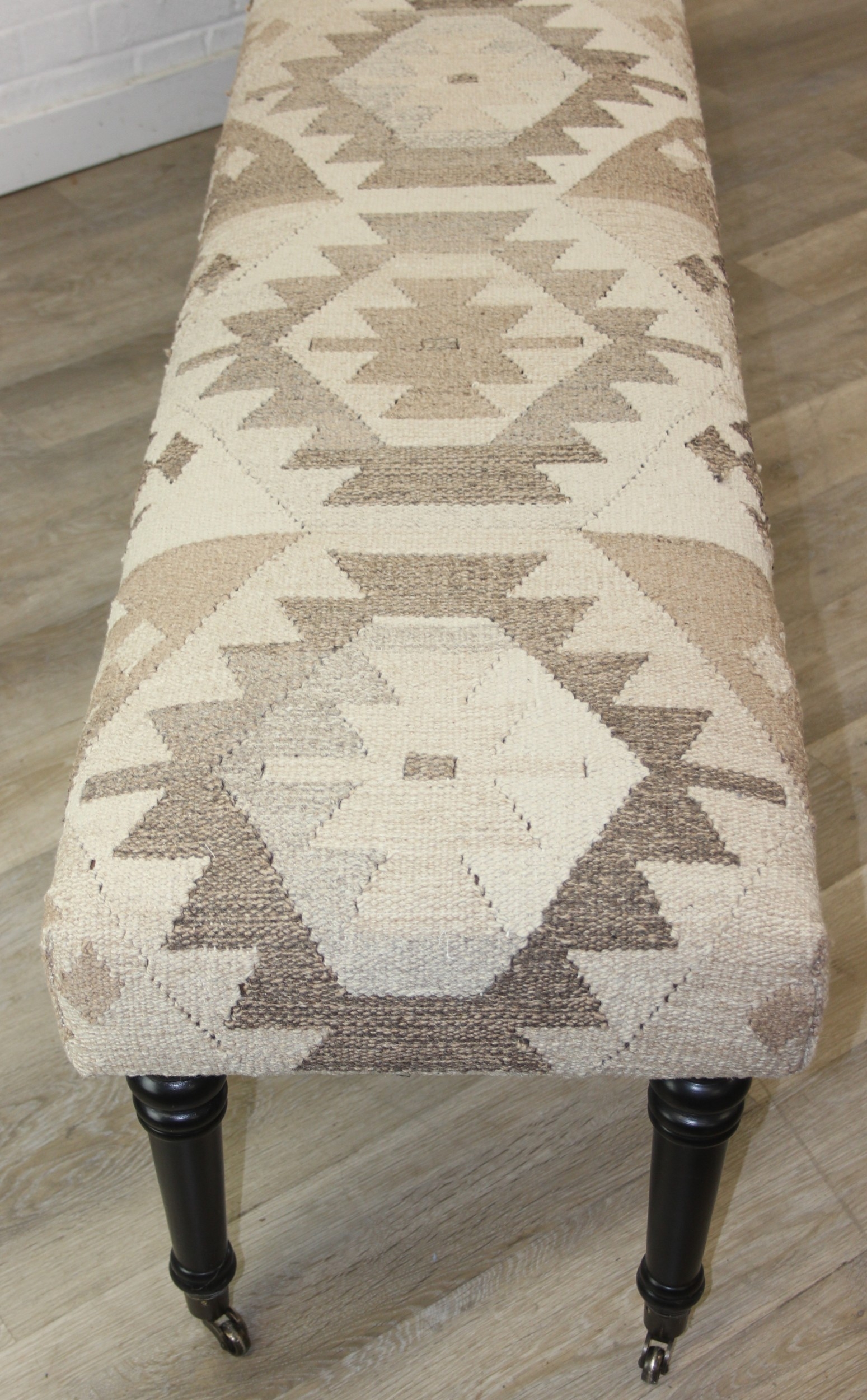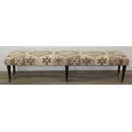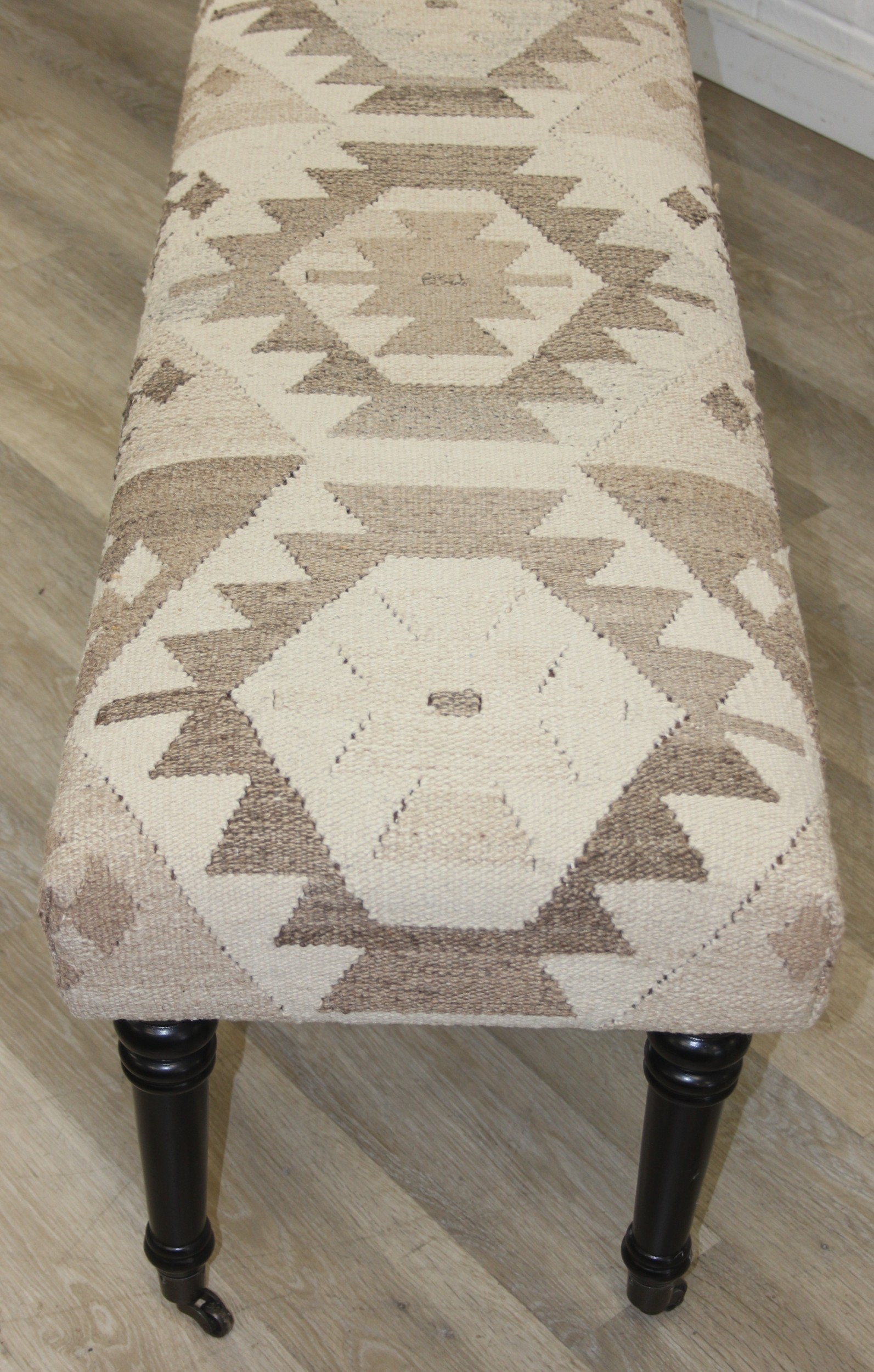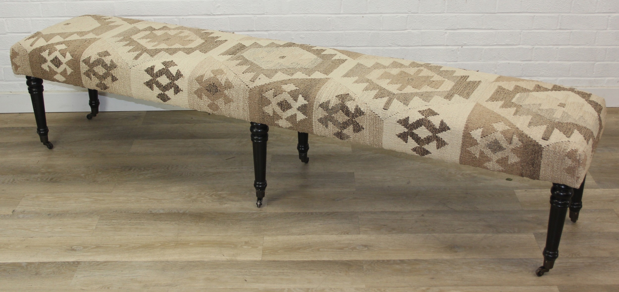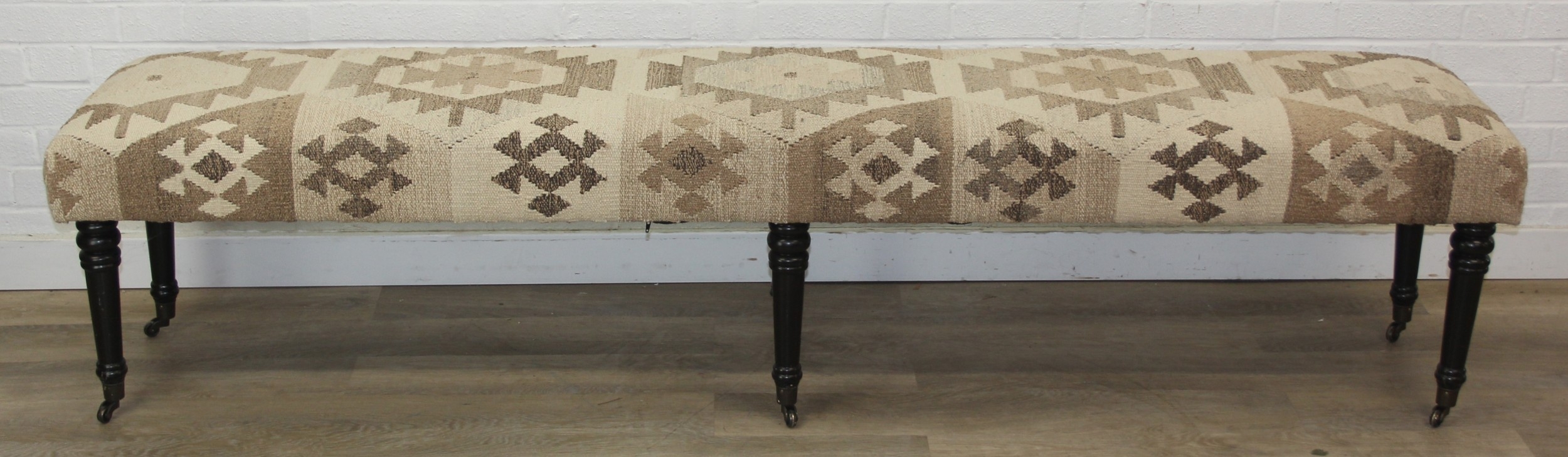 A very large antique style footstool with kilim style top and turned ebonised legs, 220cm x 45cm x 52cm, one of two in the sale