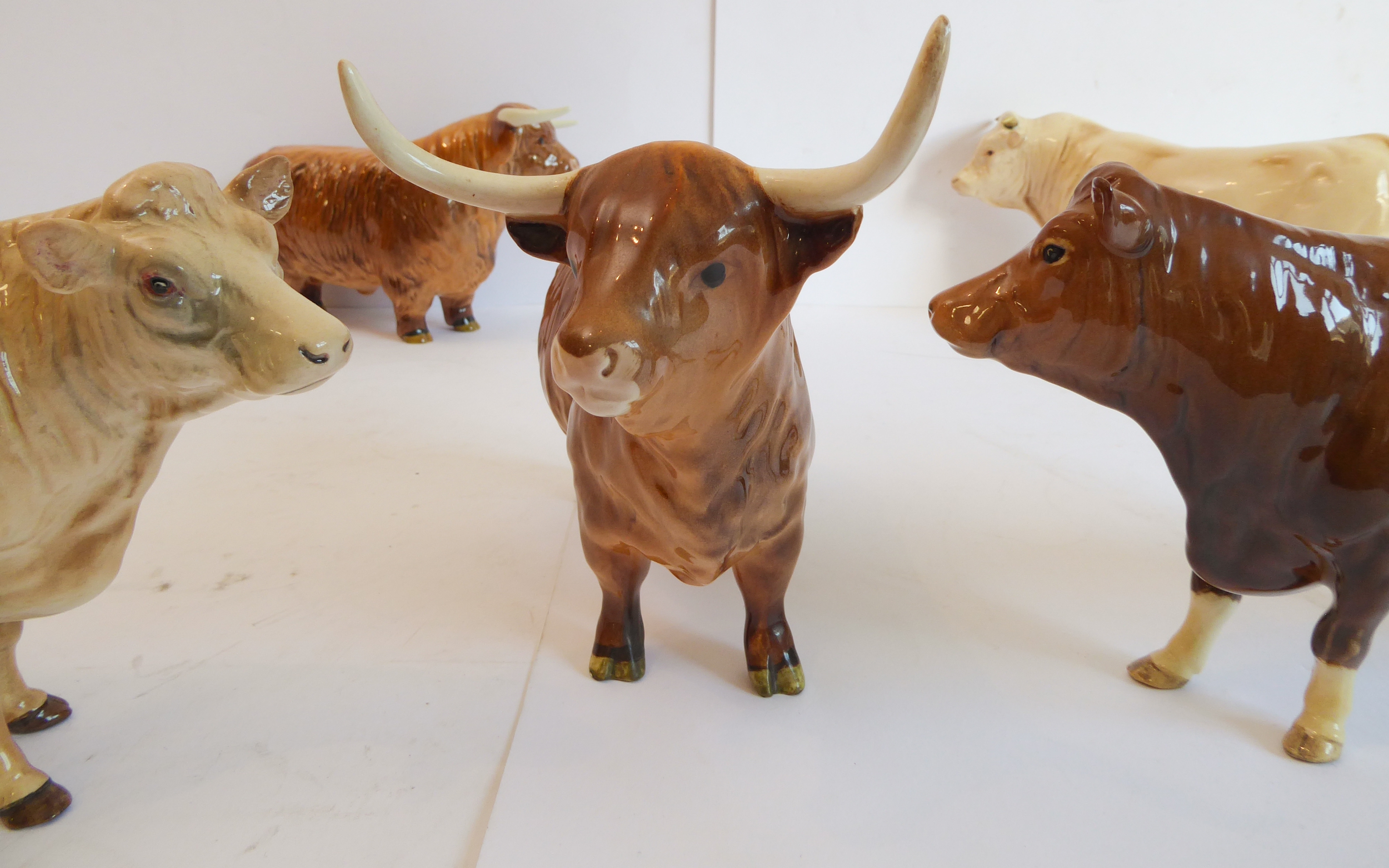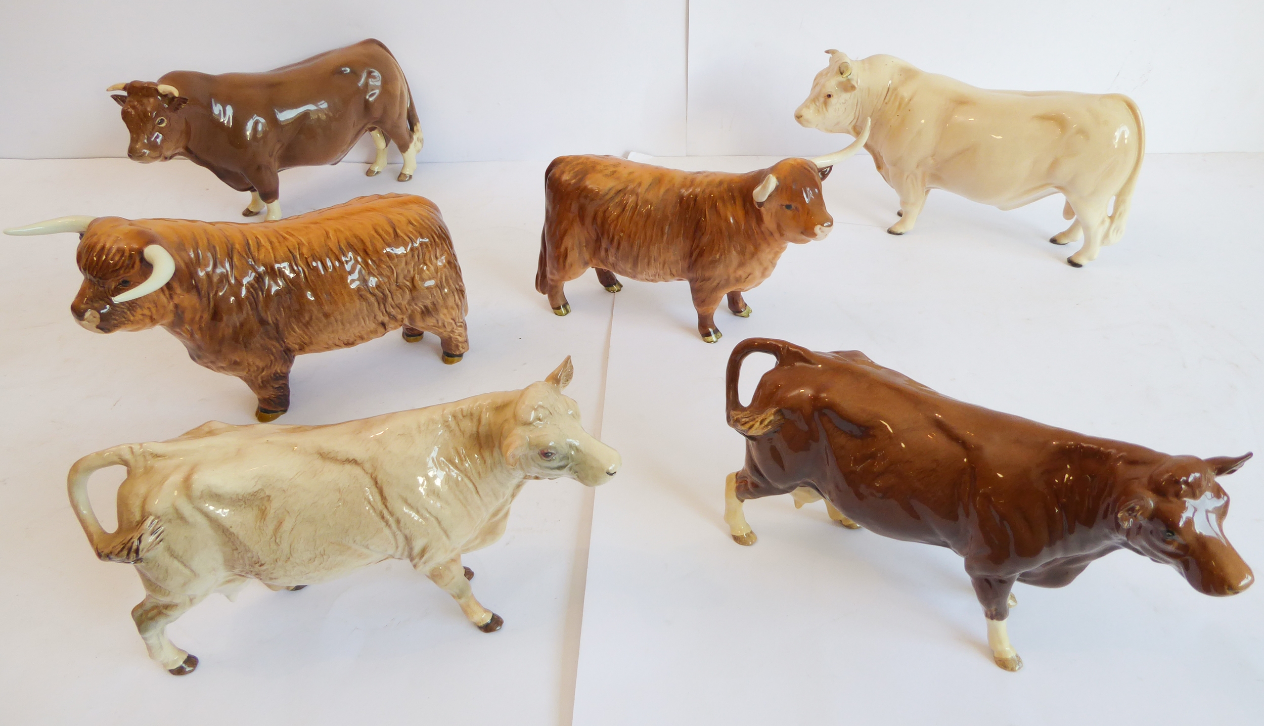 Six Beswick cattle figures to include two Scottish Longhorn. Two marked 'BCC 1998' and all with printed marks to their undersides.