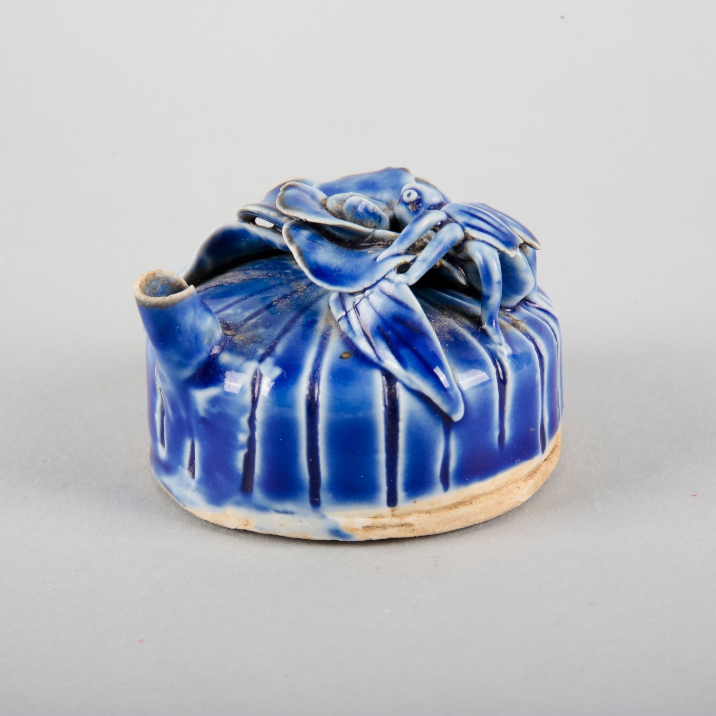 Yuan dynasty or later, delicately moulded with an insect perched upon a flower to the top, a fine spout to one side and a pierced aperture the other, 4.5cm high x 7cm diameter