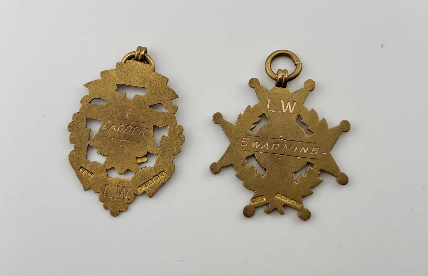 Two early 20th century 9ct gold medals, hallmarks for William Hair Haseler, Birmingham 1915, lengths 4 and 4.6cm, total weight 13.5g