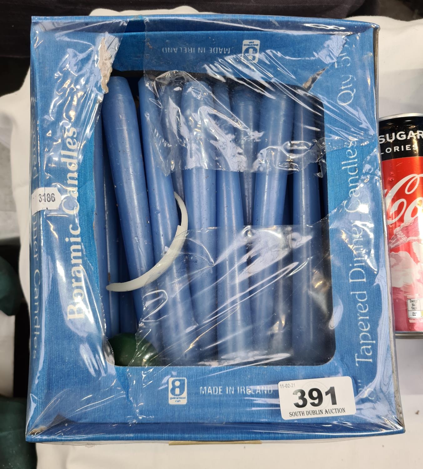 Box of tapered 8' blue candles, non drip and smokeless
