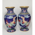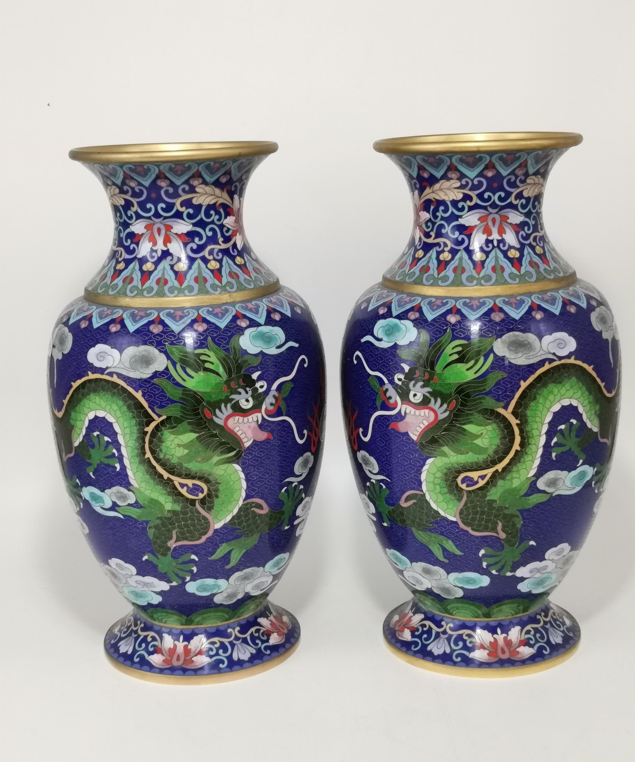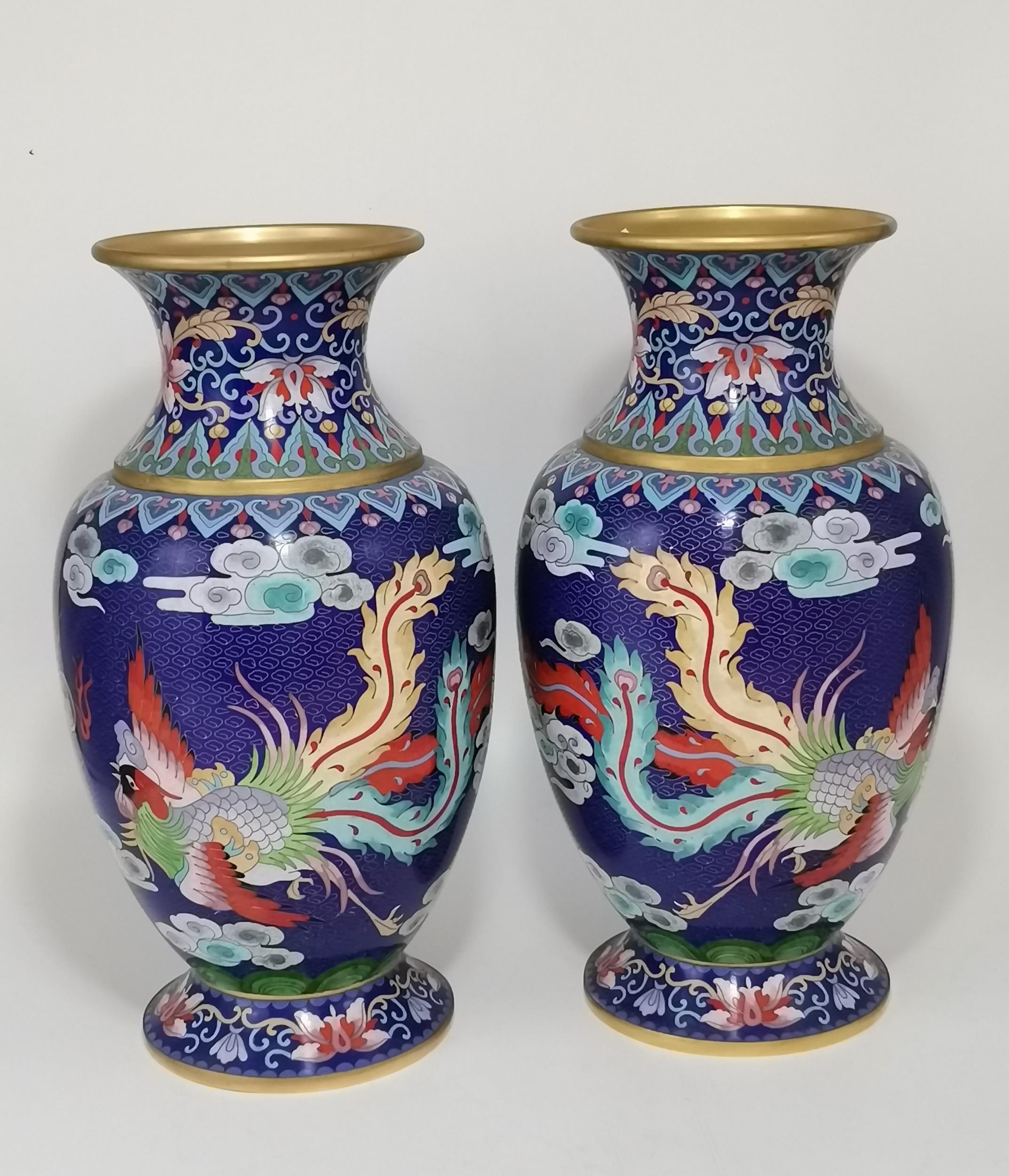 A large pair of Chinese cloisonné vases, each decorated with a green five-toed dragon chasing a flaming pearl, a multi-coloured bird to the other side, with clouds and floral decoration to a blue ground, with gilded rims. (2) 37.5cm high