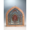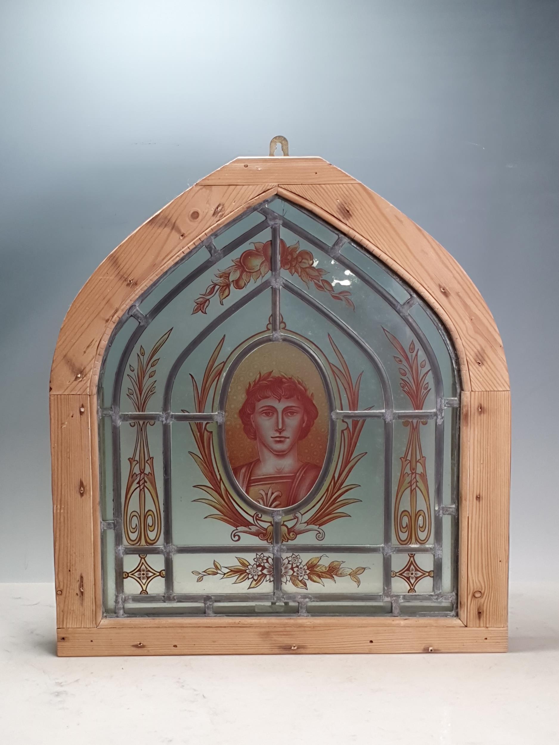 An arched pine framed leaded glass Window, depicting a Romanesque figure, two cracks to glass, 20in H x 1ft 7in W, (R4)