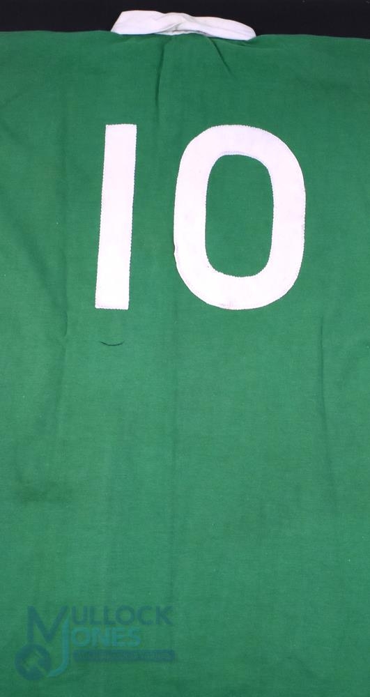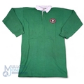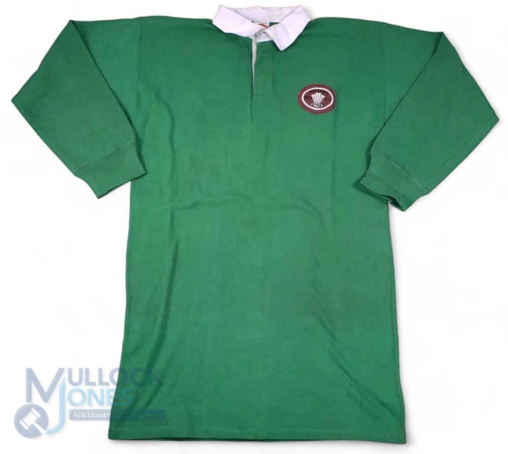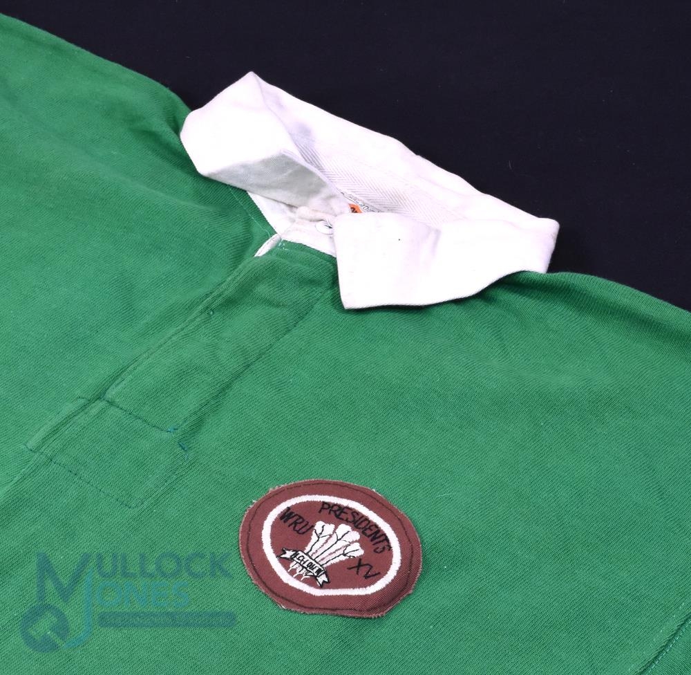 1980s WRU President's XV Green Matchworn Rugby Jersey: Green with special oval WRU President's XV badge in brown, Umbro jersey with white no.10 stitched to rear. VG condition