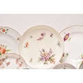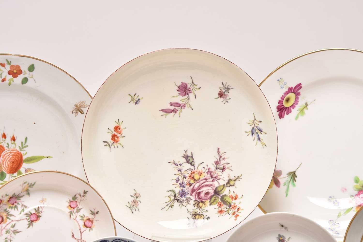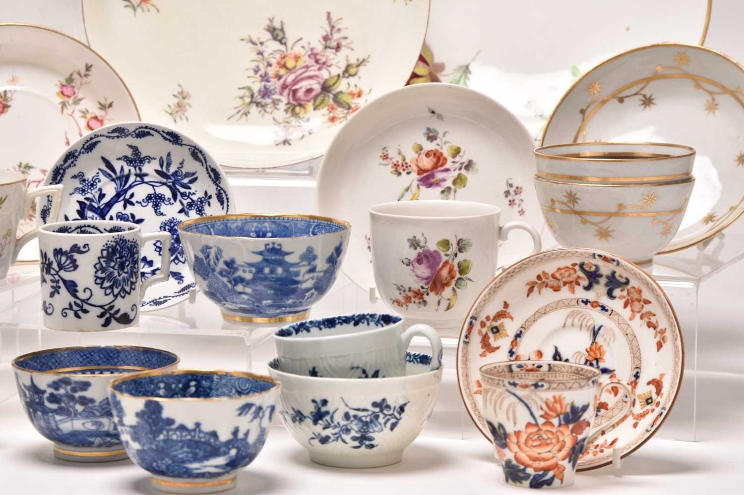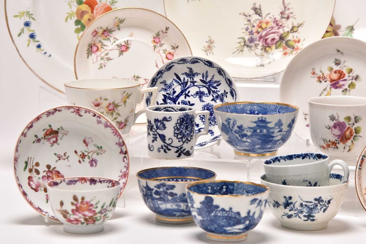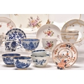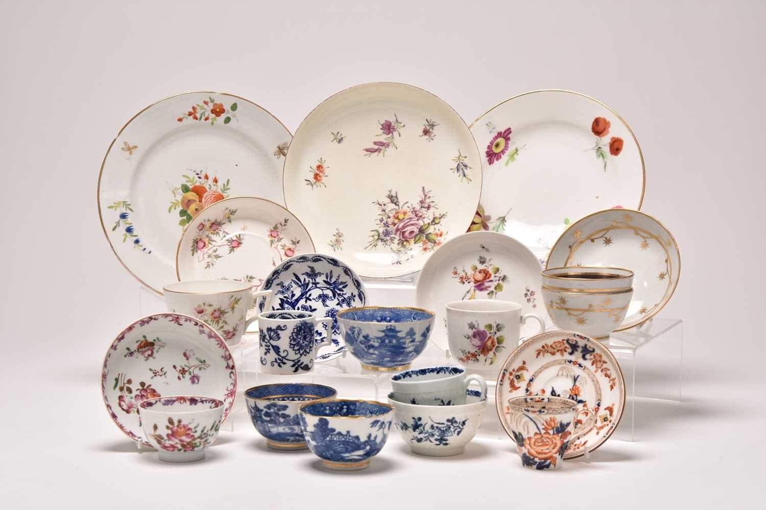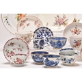 A collection of porcelain, 18th century and later, including a Nymphenburg coffee cup and saucer, circa 1760-70, painted with arrangements of European flowers, impressed marks, saucer 12.5cm diameter; a Chelsea red anchor saucer dish, likewise painted with flowers including a large purple rose, circa 1755, painted mark, 19.5cm diameter; a Worcester feather-moulded floral blue and white coffee cup and matching tea bowl, crescent mark to tea bowl, a Caughley 'Pagoda' fluted tea bowl, together with a further Chinese blue and white tea bowl and early 19th century English tea bowl, a Chinese export famille rose teabowl and saucer, two floral plates, etc (qty) Condition:Chelsea saucer dish with glaze crazing and rubbing to the brown lined rim Worcester feather-mould floral coffee cup with small chip to the exterior rim, the tea bowl however is in good condition.