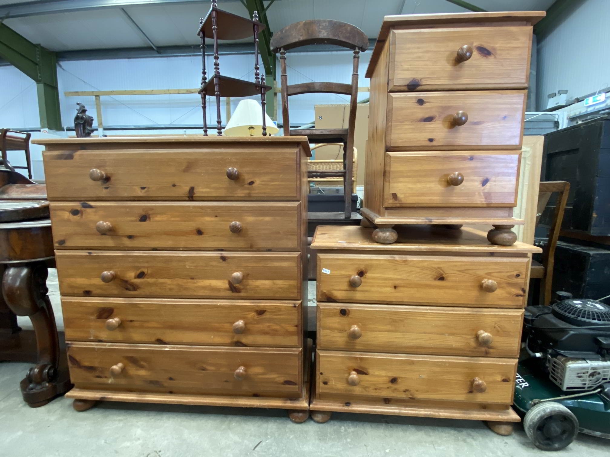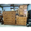 Pine five drawer chest 98H 89W 43D, pine three drawer chest 63H 69W 43D & a pine three drawer bedside chest 65H 43W 43D