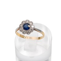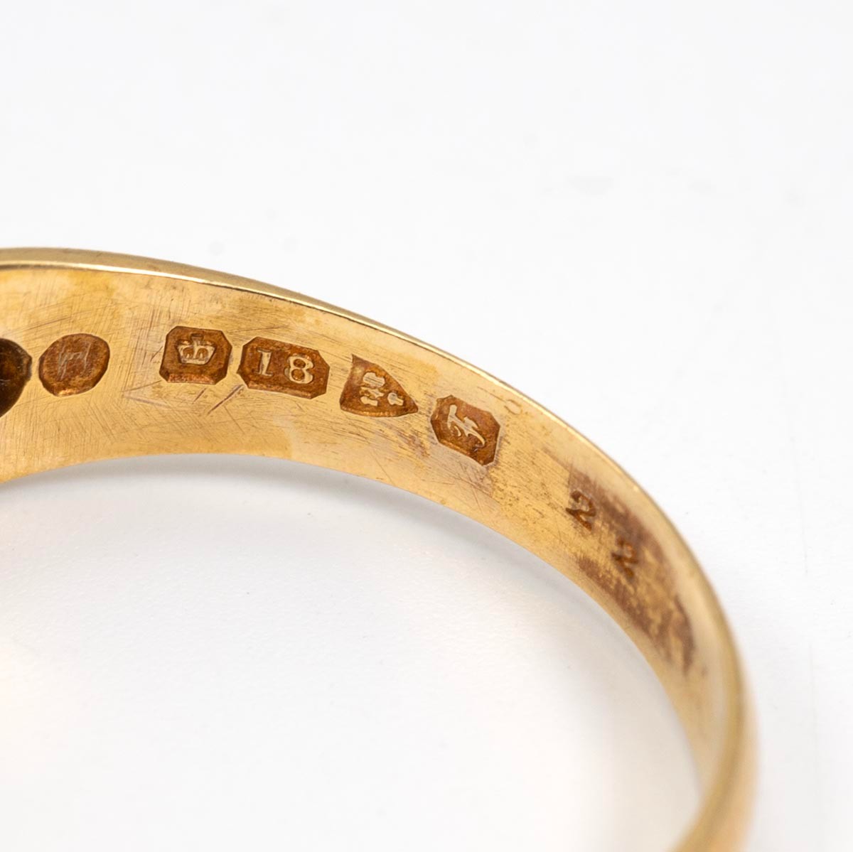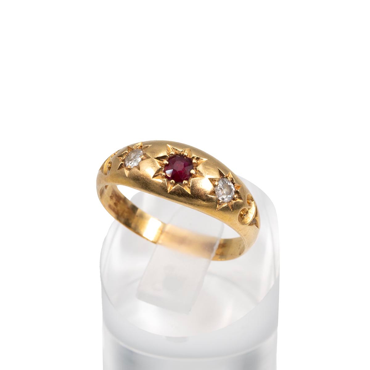 18ct gold gypsy style ring set with a central ruby approx 0.15ct, flanked by two diamonds each, approx 0.10ct, size U, weight 5.5 grams.