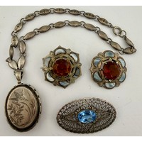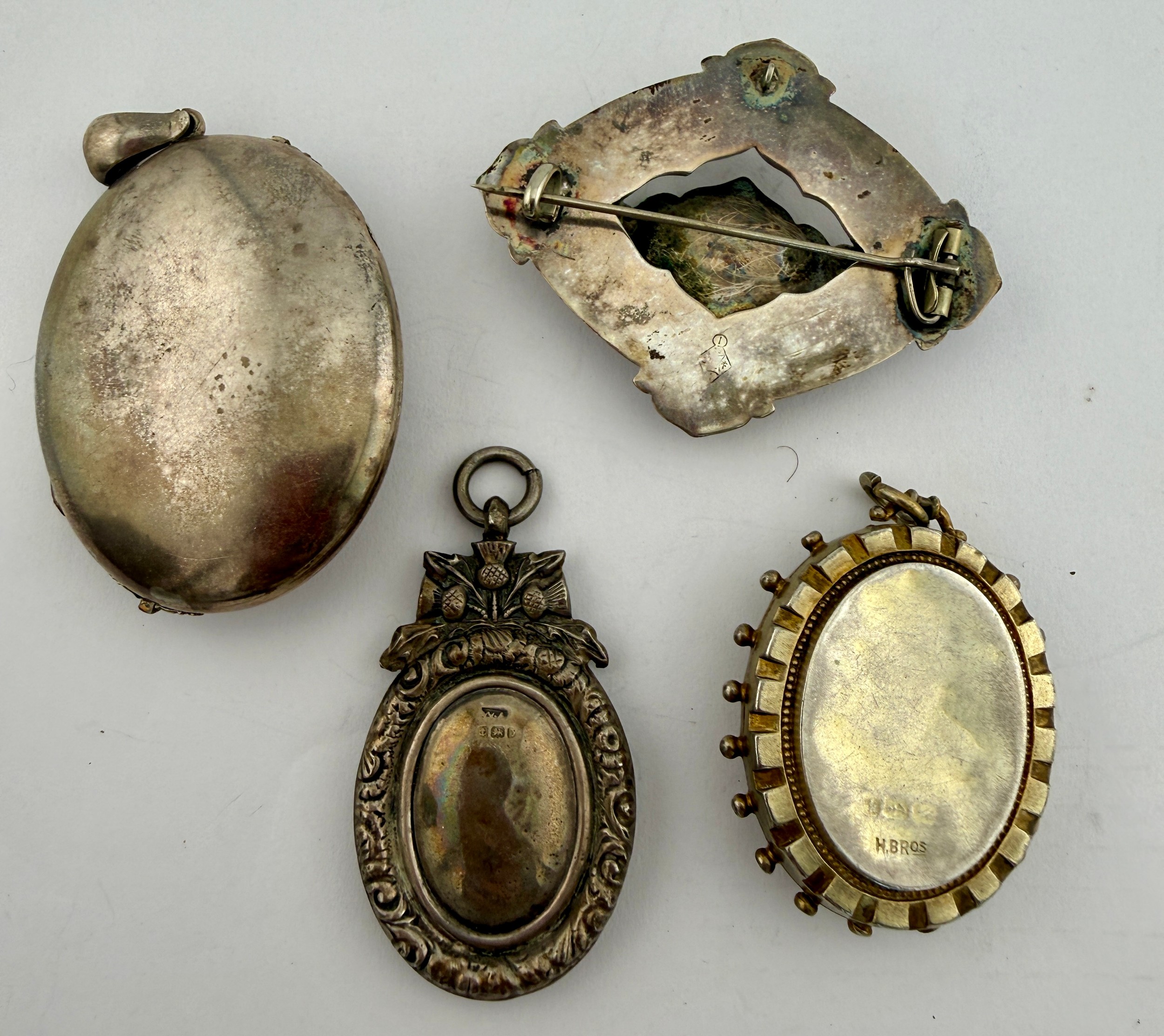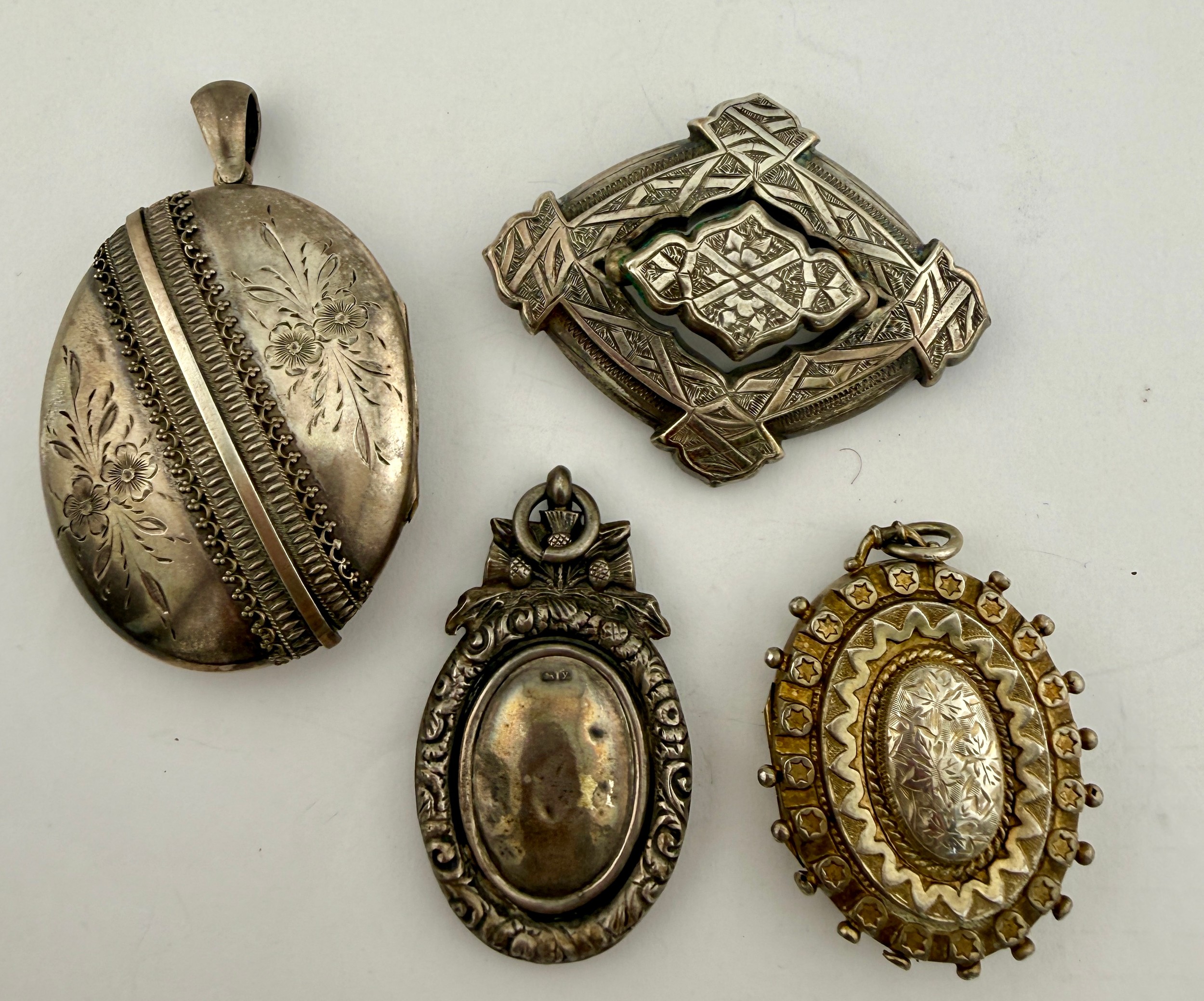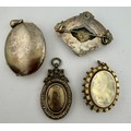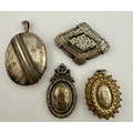 Four hallmarked and sterling silver 19thC lockets, brooch and pendant. Largest locket 5cm x 4cm. Total weight 54.6gm.