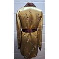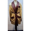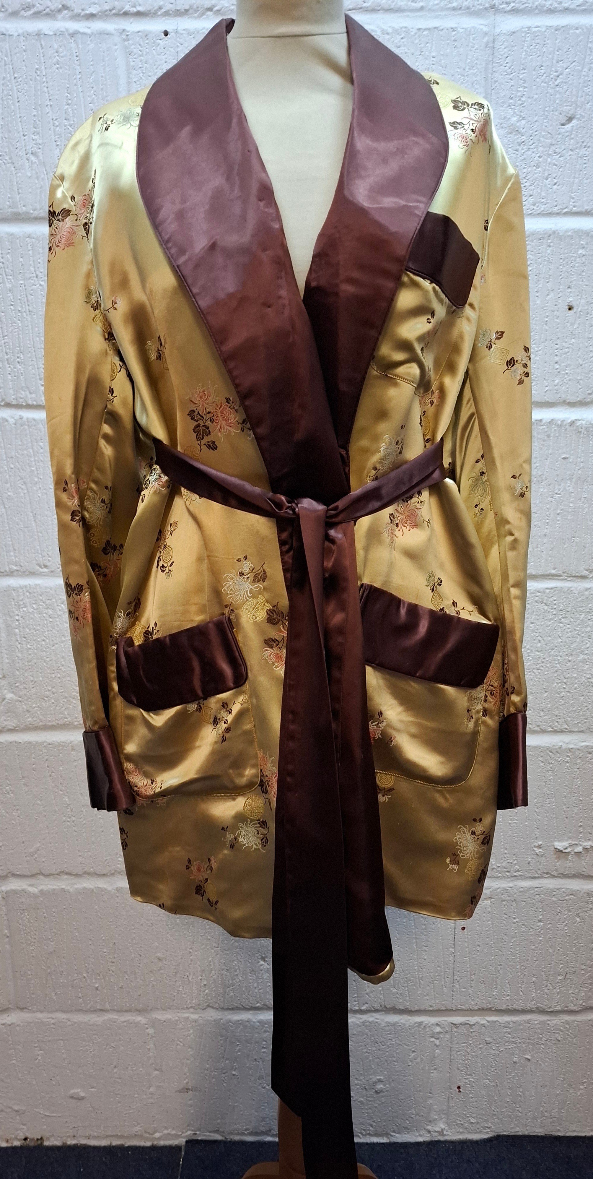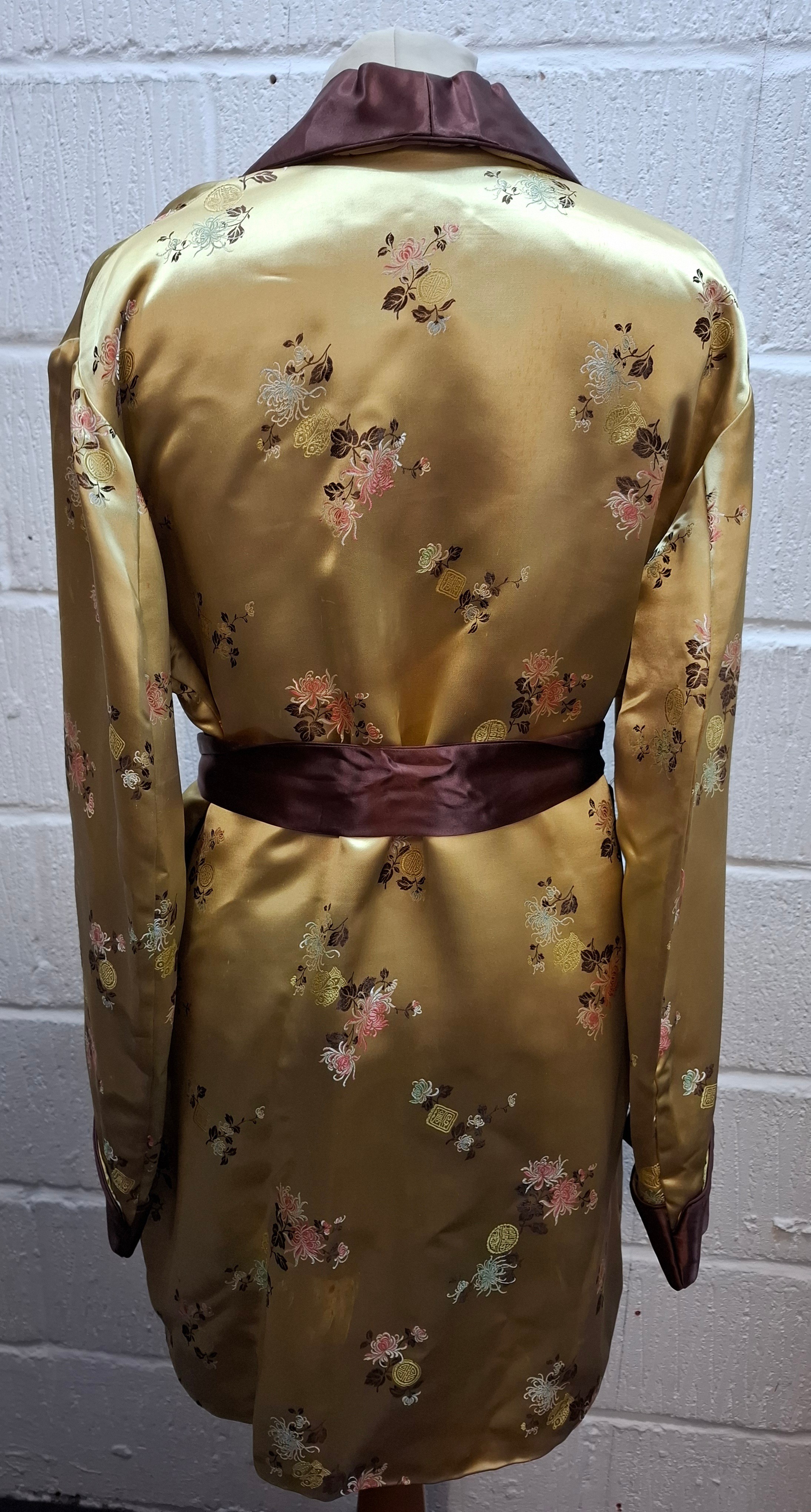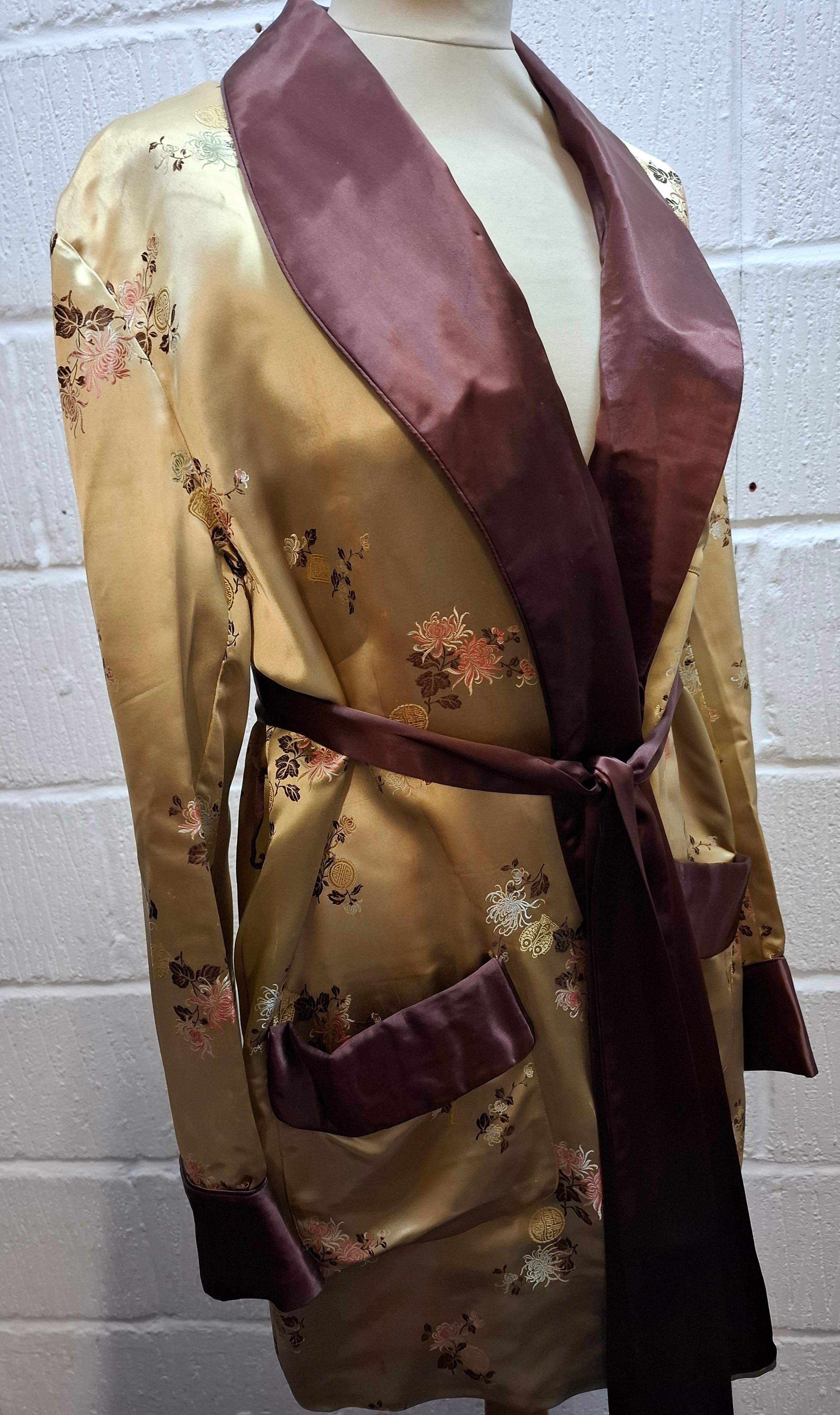 A 1940's Japanese gold coloured satin smoking jacket having machine embroidered images of floral sprays and Japanese symbols with dark brown collar, cuffs and pocket trim, having a matching belt, size 44. Location:Rail