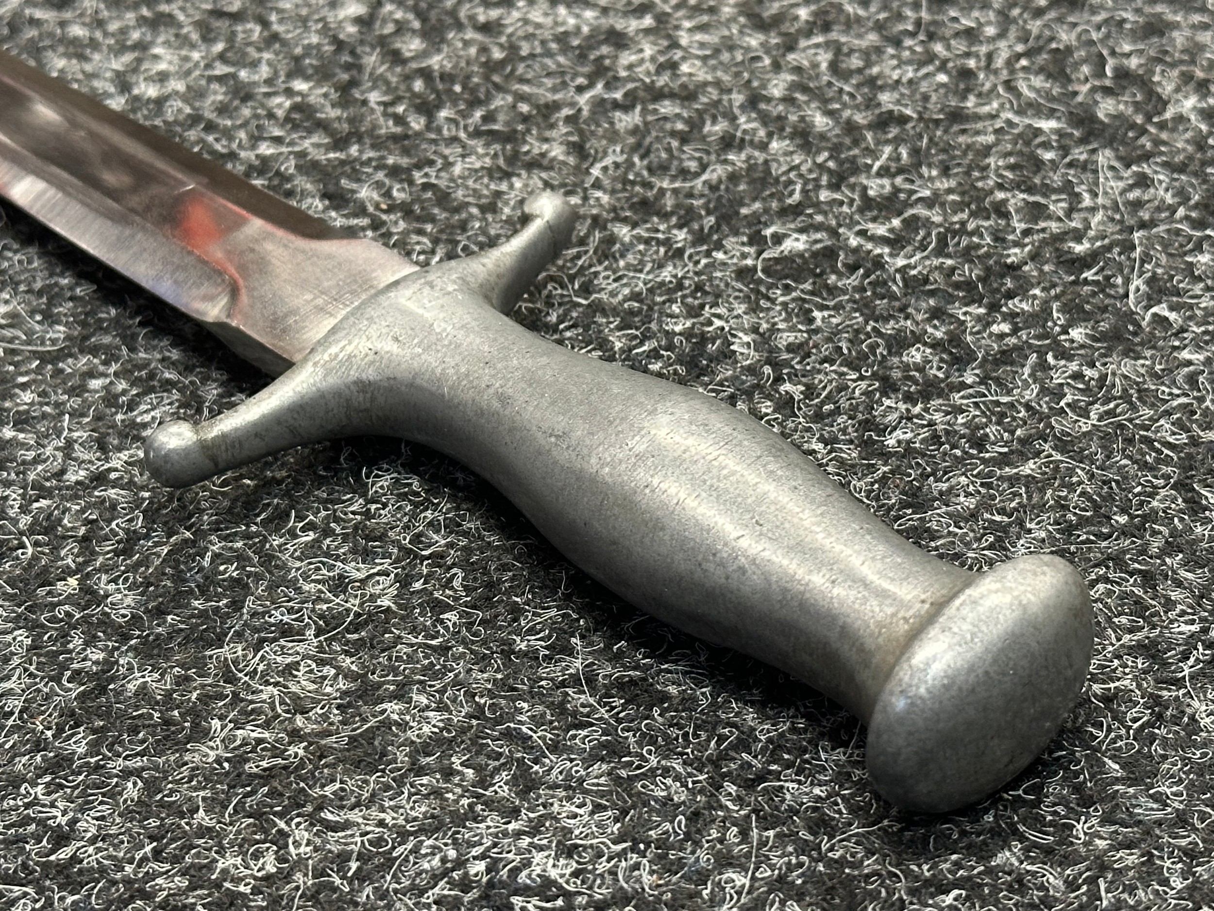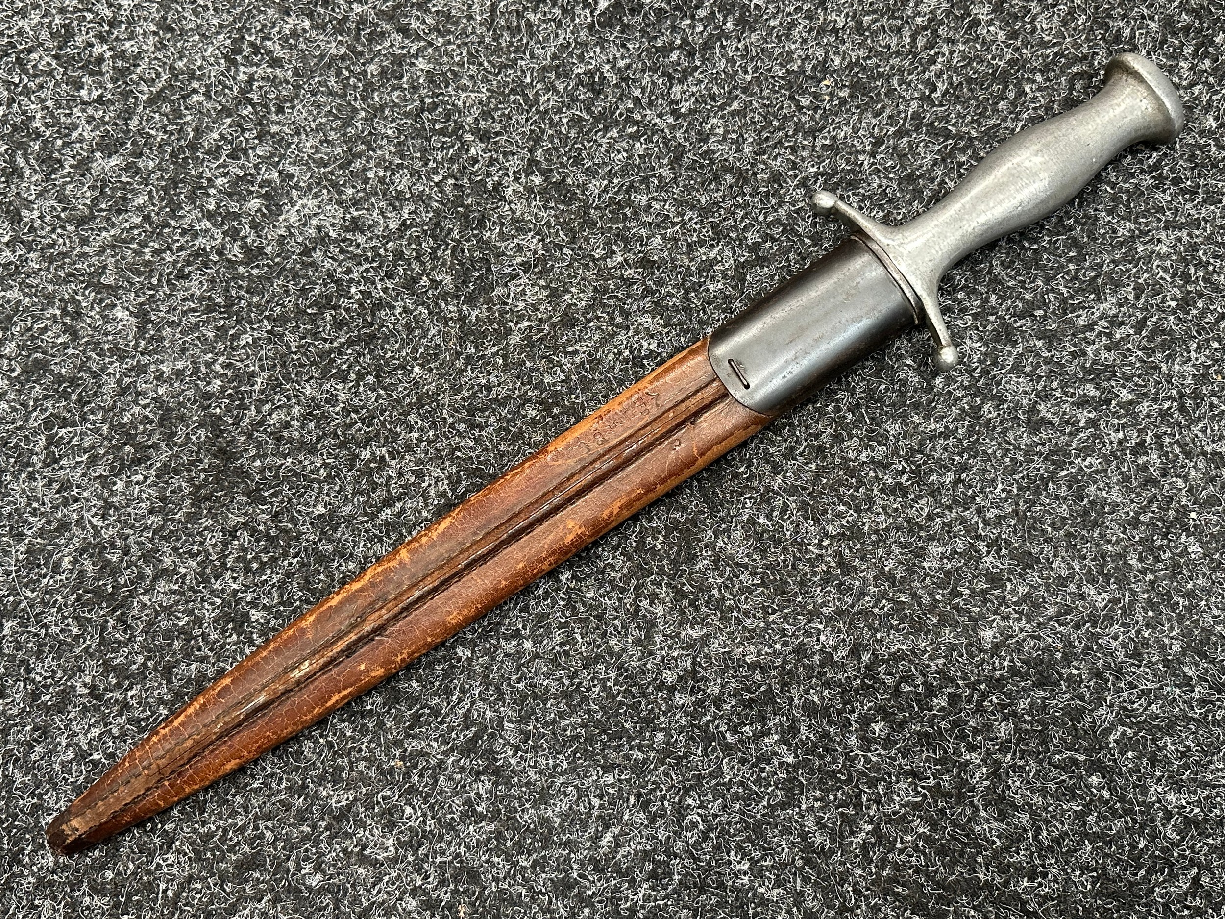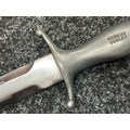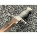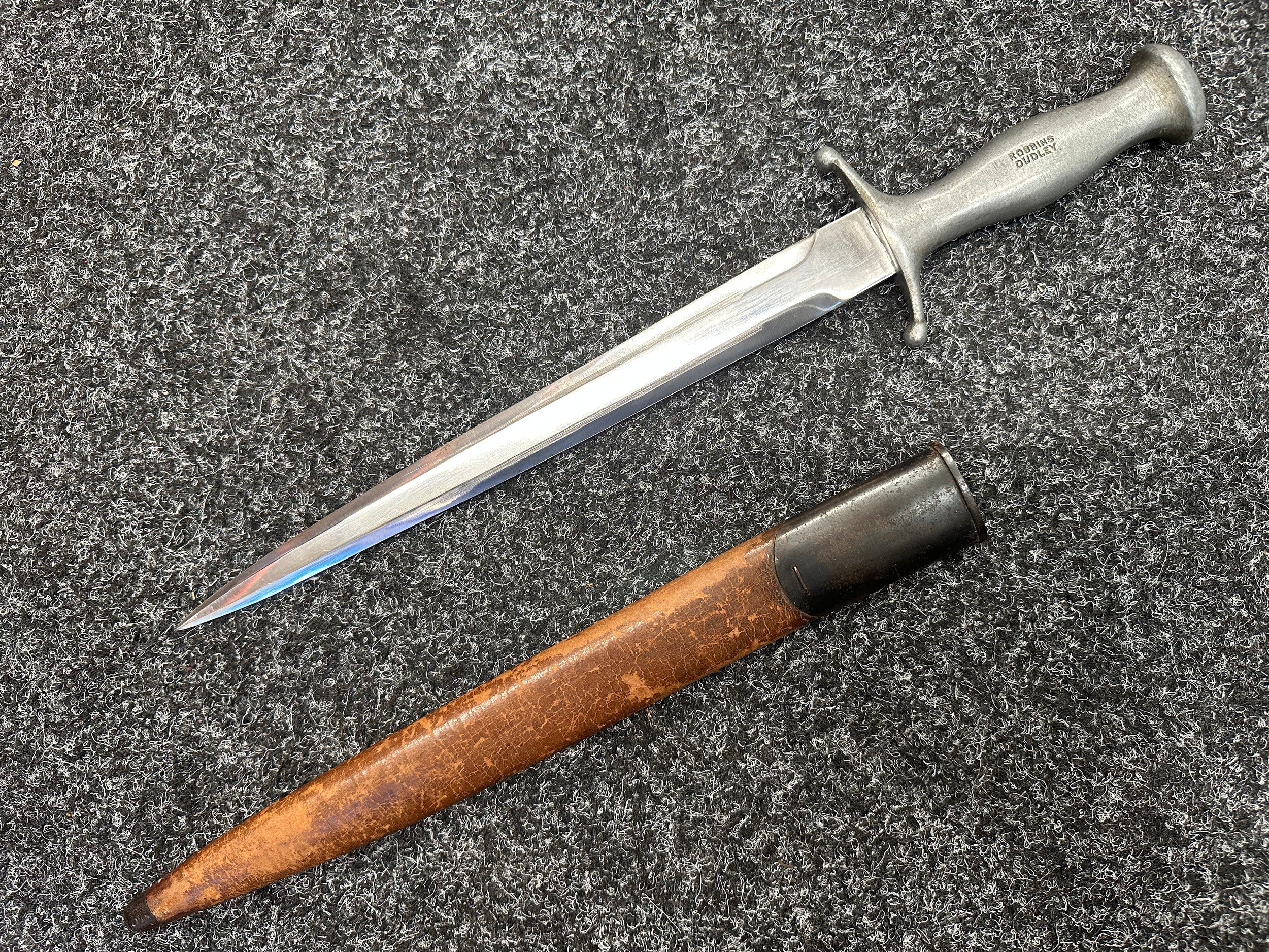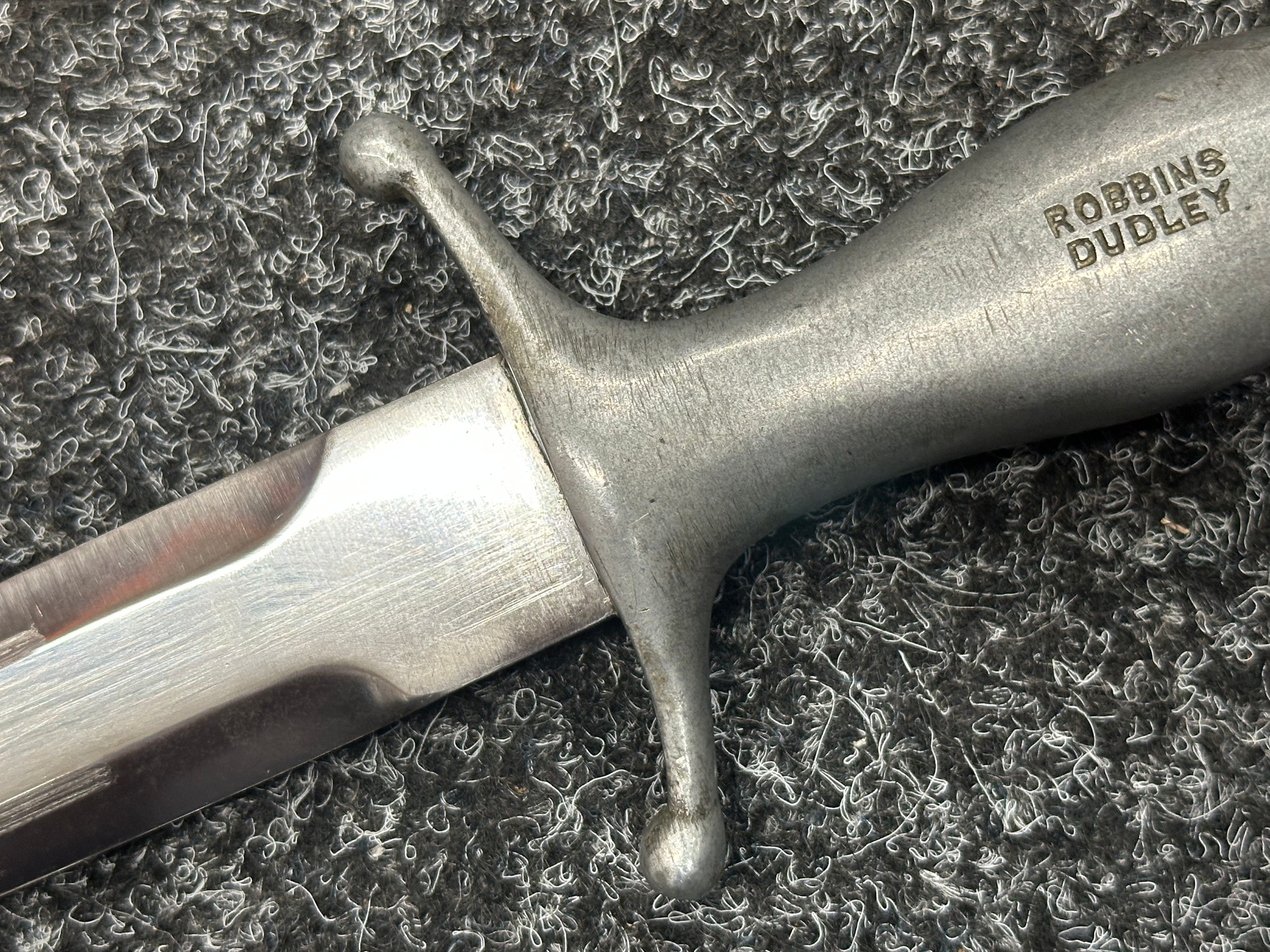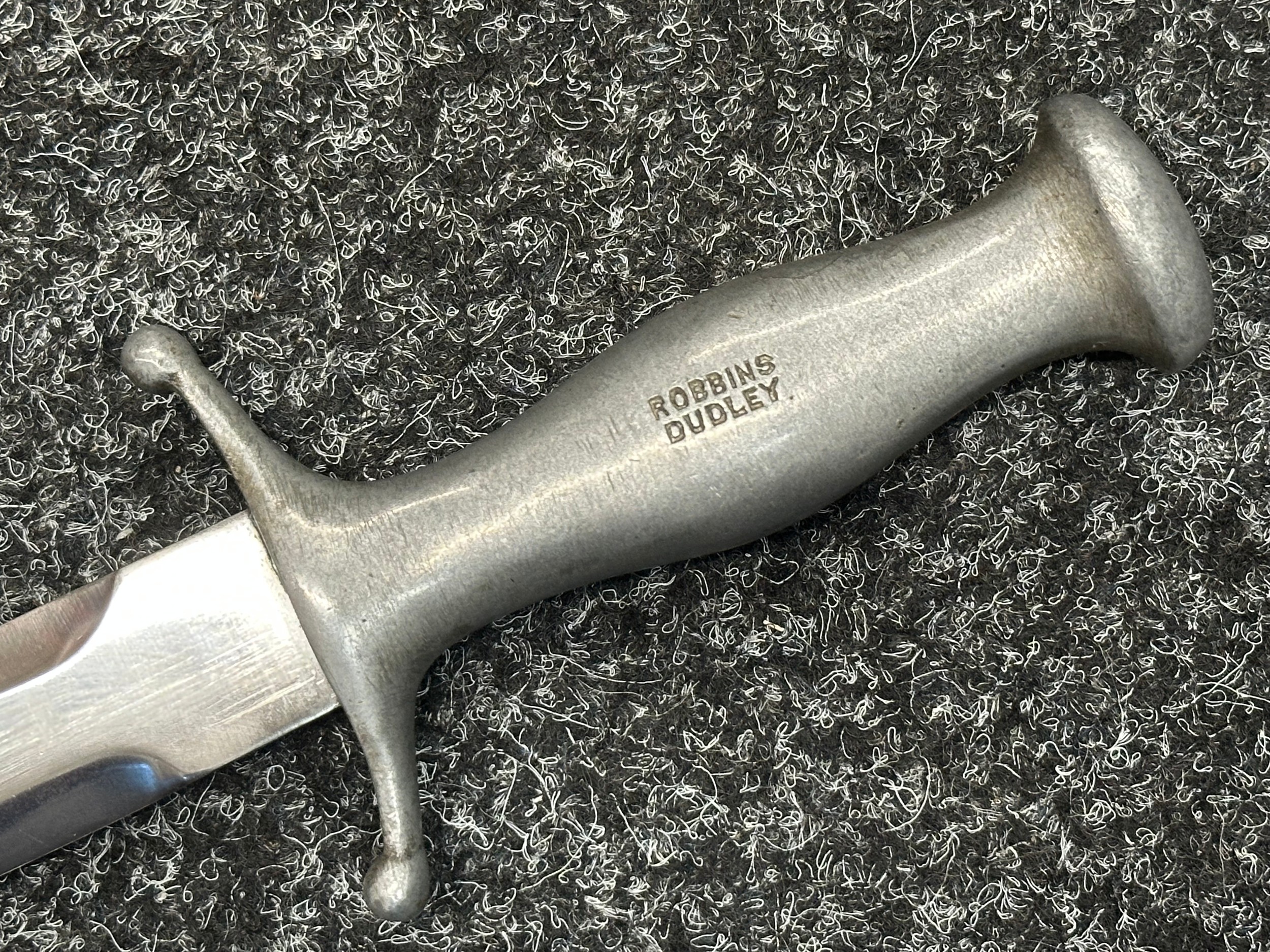 Rare British WW1 Robbins of Dudley Private Purchase Short Sword Fighting Knife. One of the rarest Robbins knives. Double edged blade 290mm in length. Cast alloy grip typical of all Robbins knives impressed with makers name "Robbins Dudley". Overall length 404mm. Complete with 1903 pattern leather scabbard.