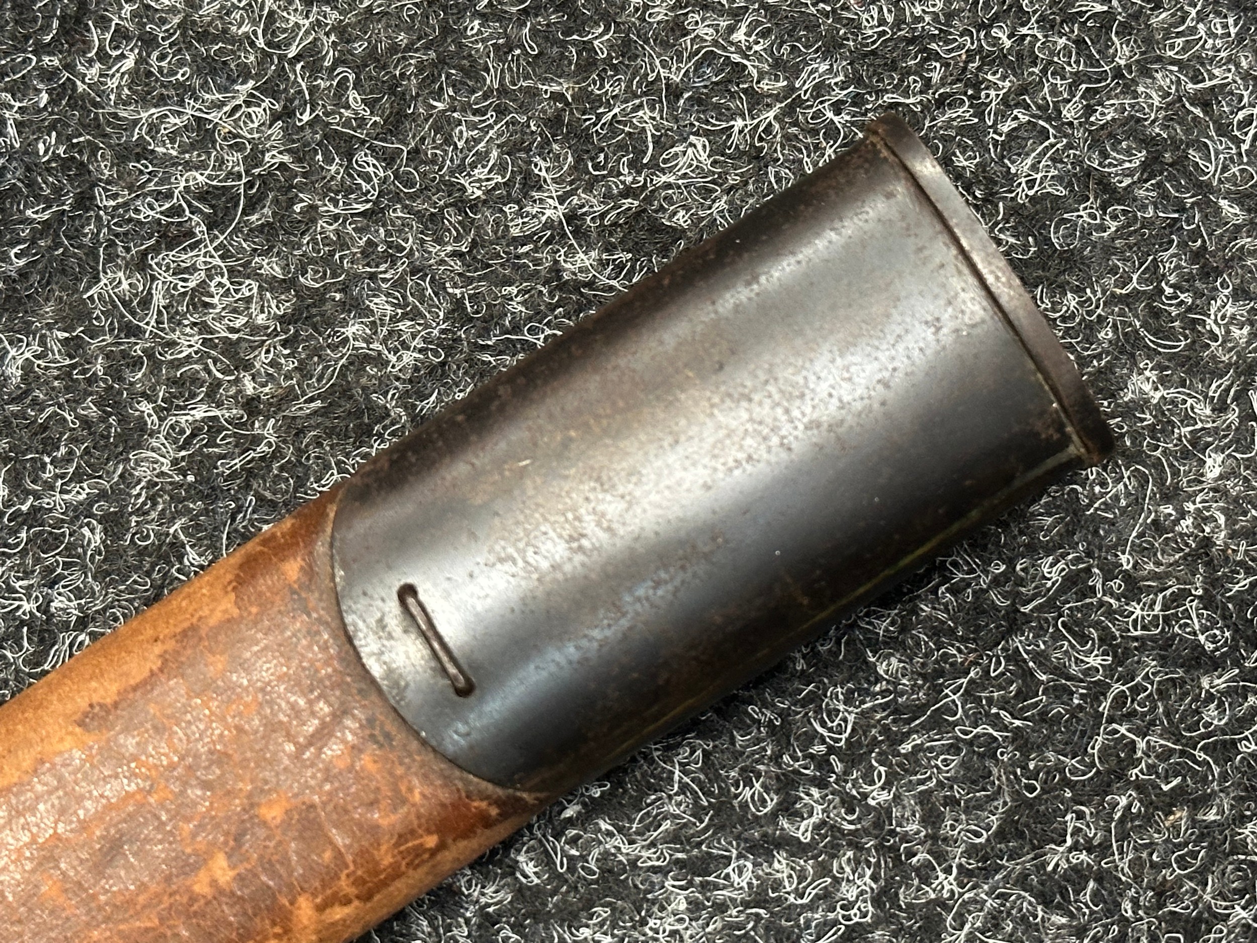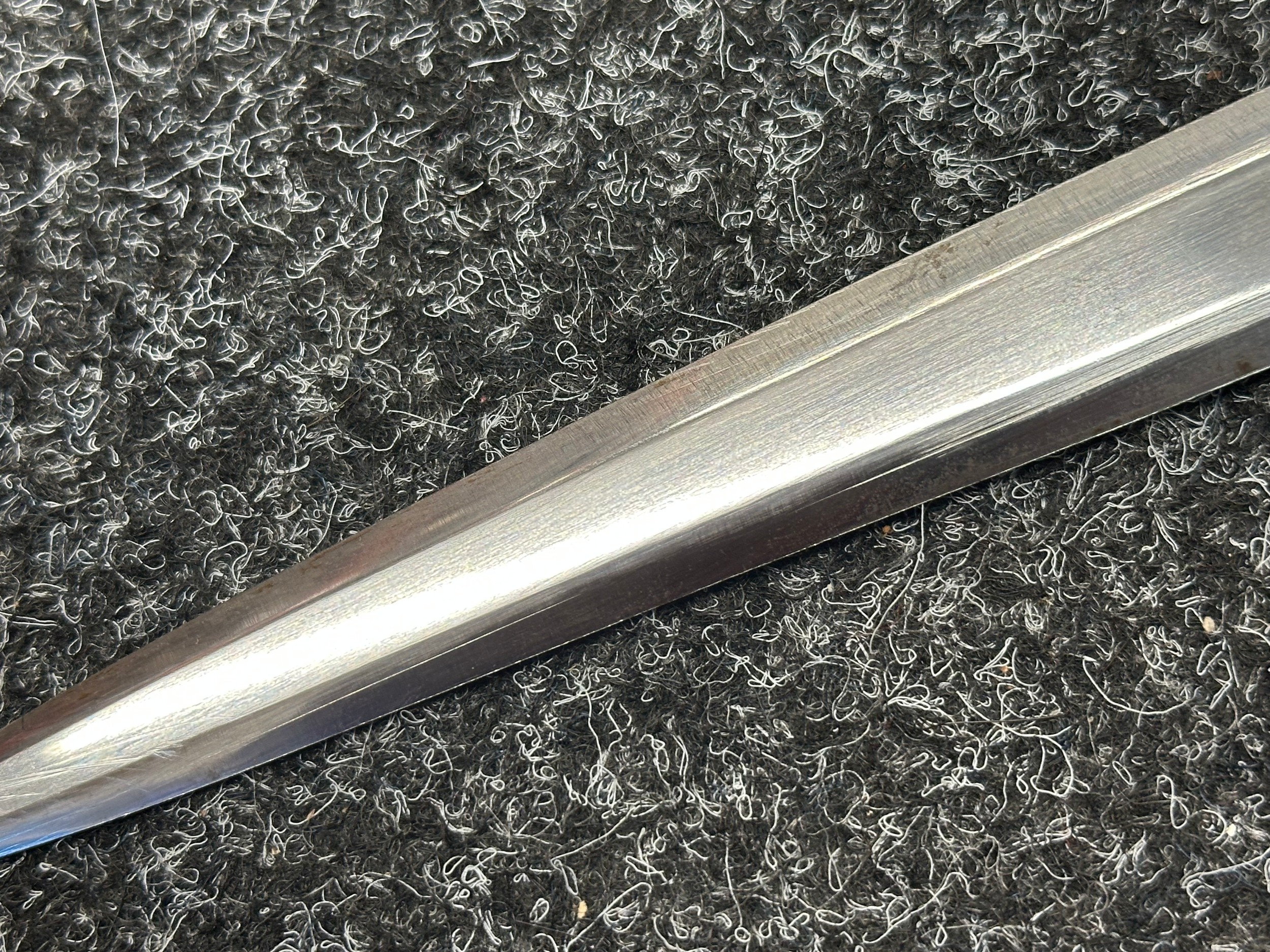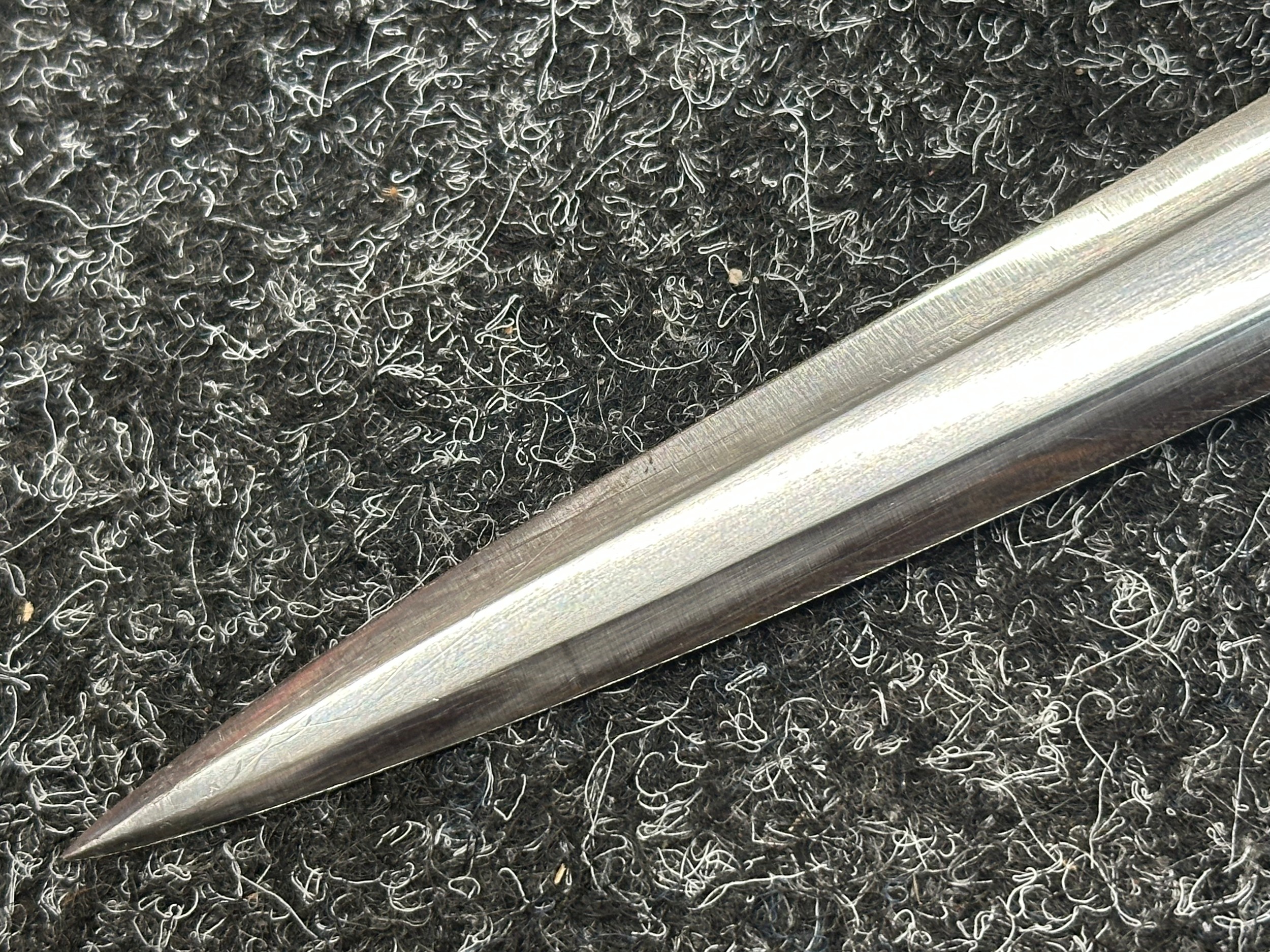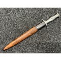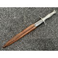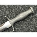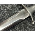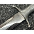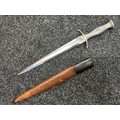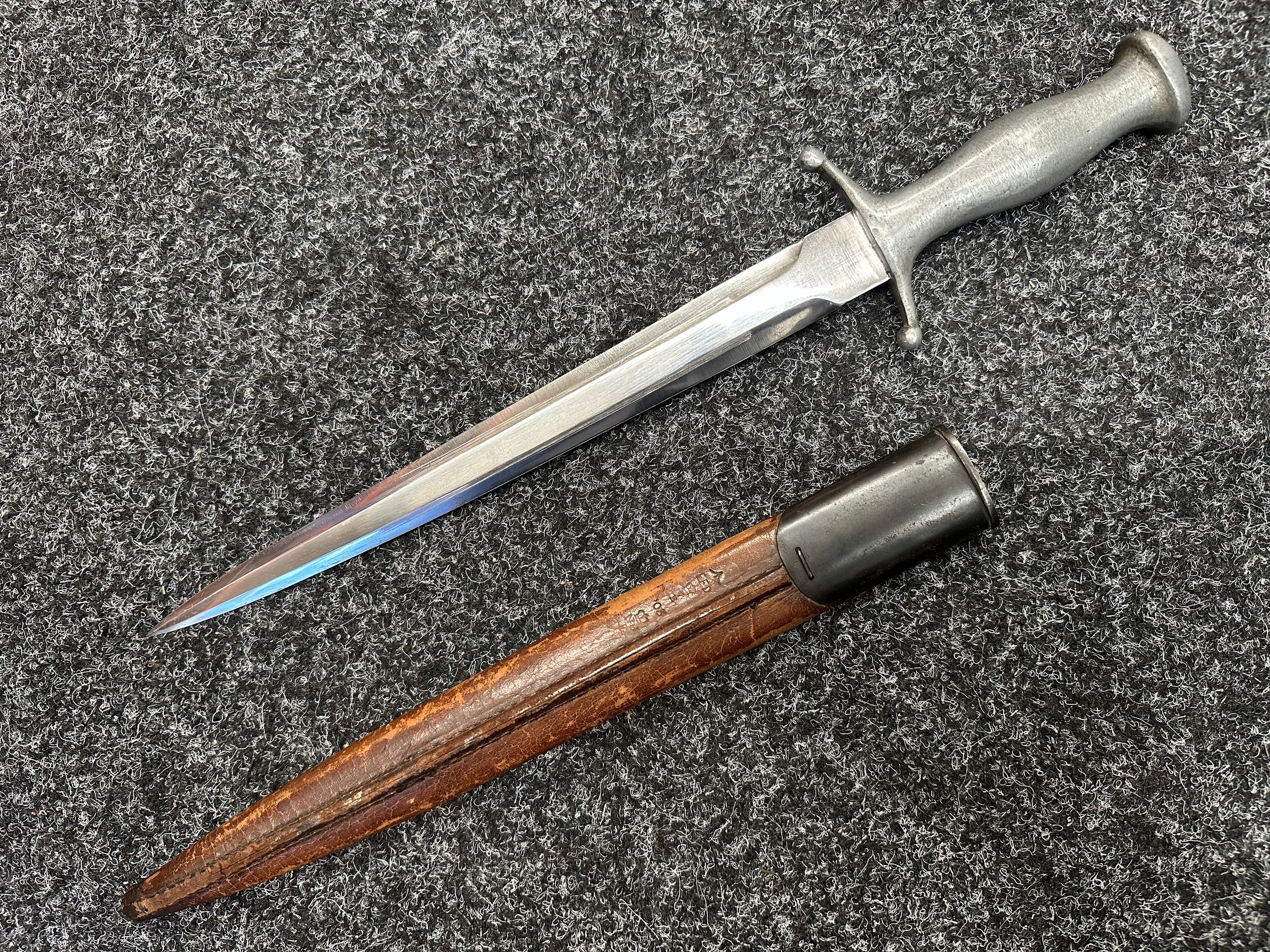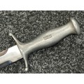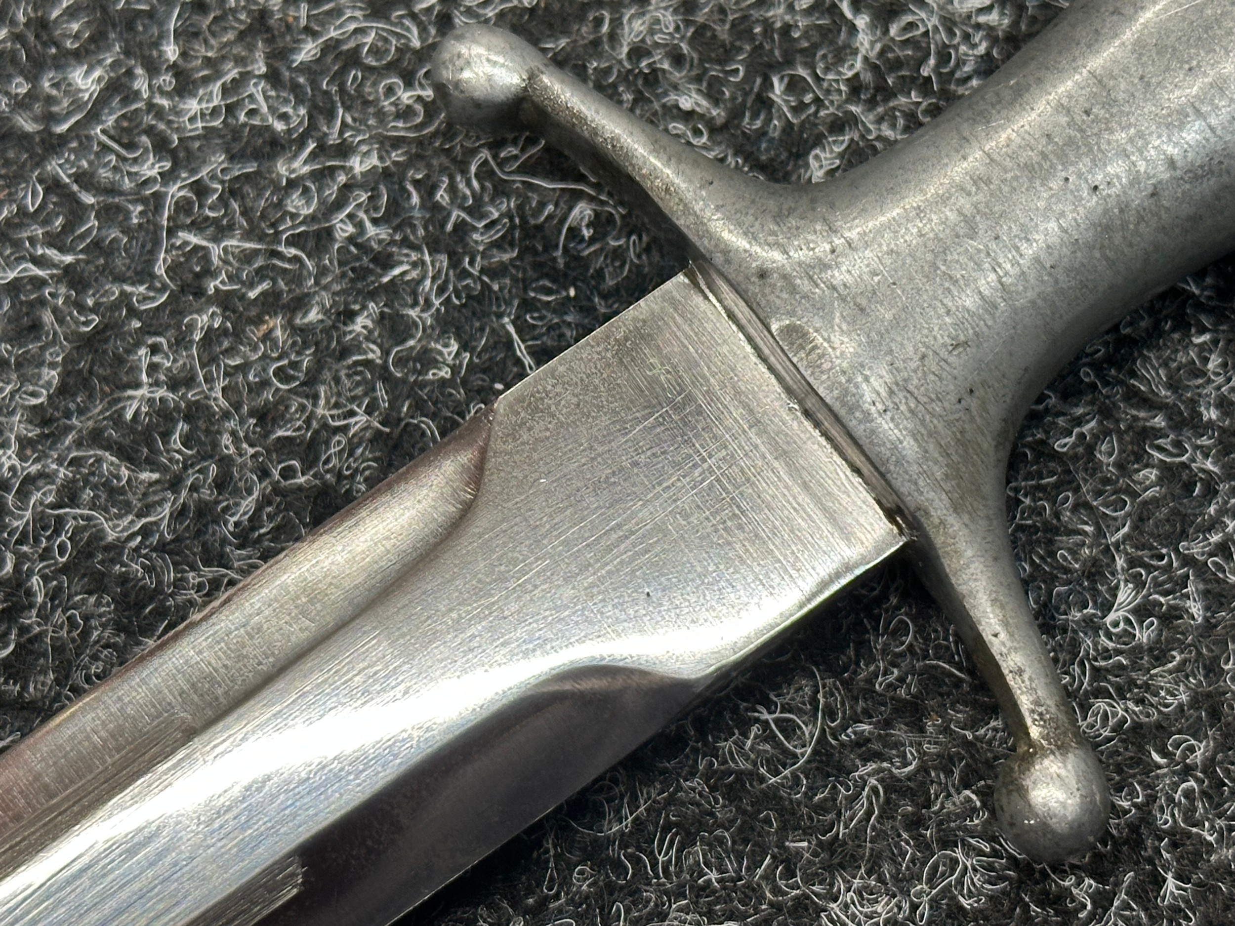 Rare British WW1 Robbins of Dudley Private Purchase Short Sword Fighting Knife. One of the rarest Robbins knives. Double edged blade 290mm in length. Cast alloy grip typical of all Robbins knives impressed with makers name "Robbins Dudley". Overall length 404mm. Complete with 1903 pattern leather scabbard.