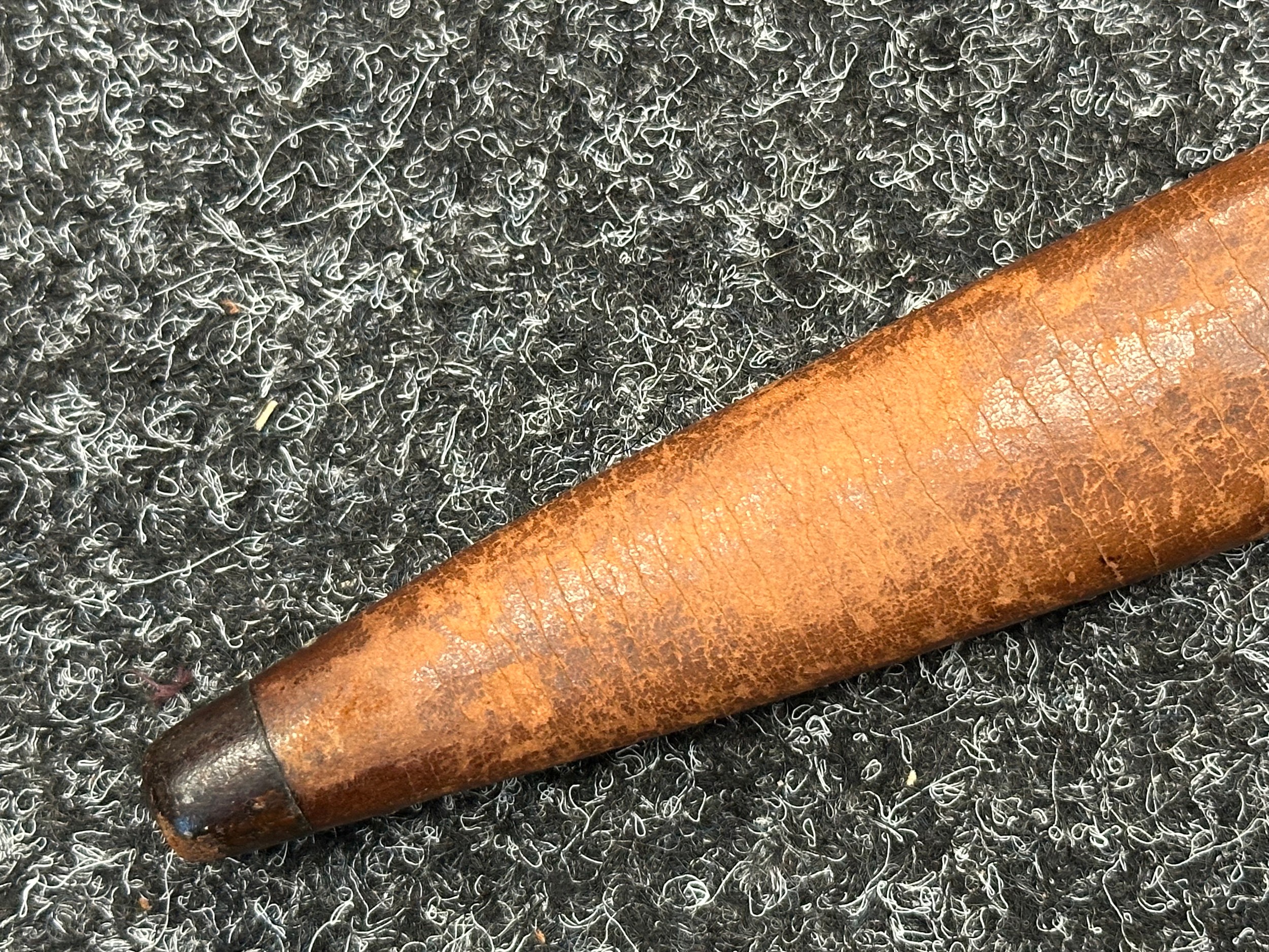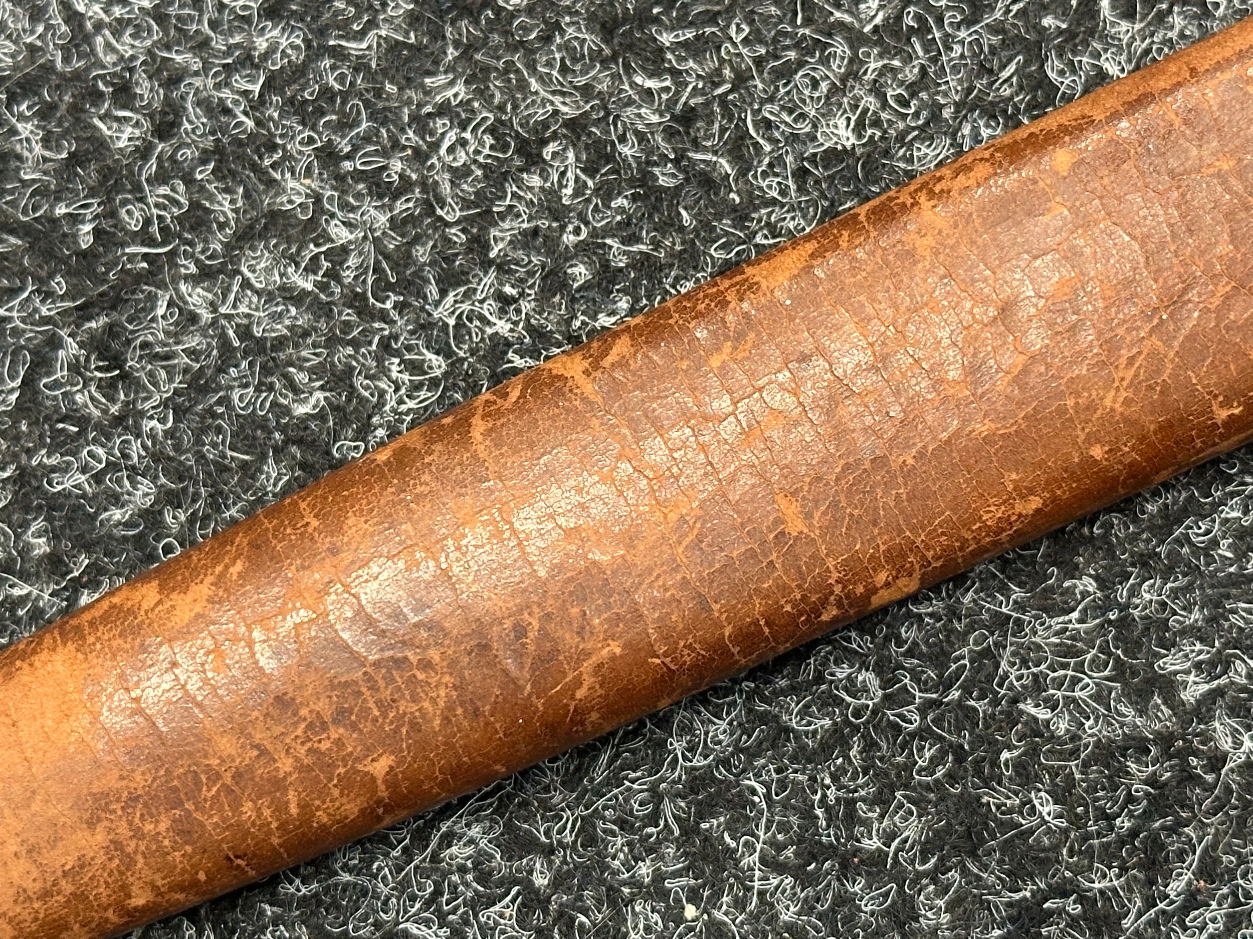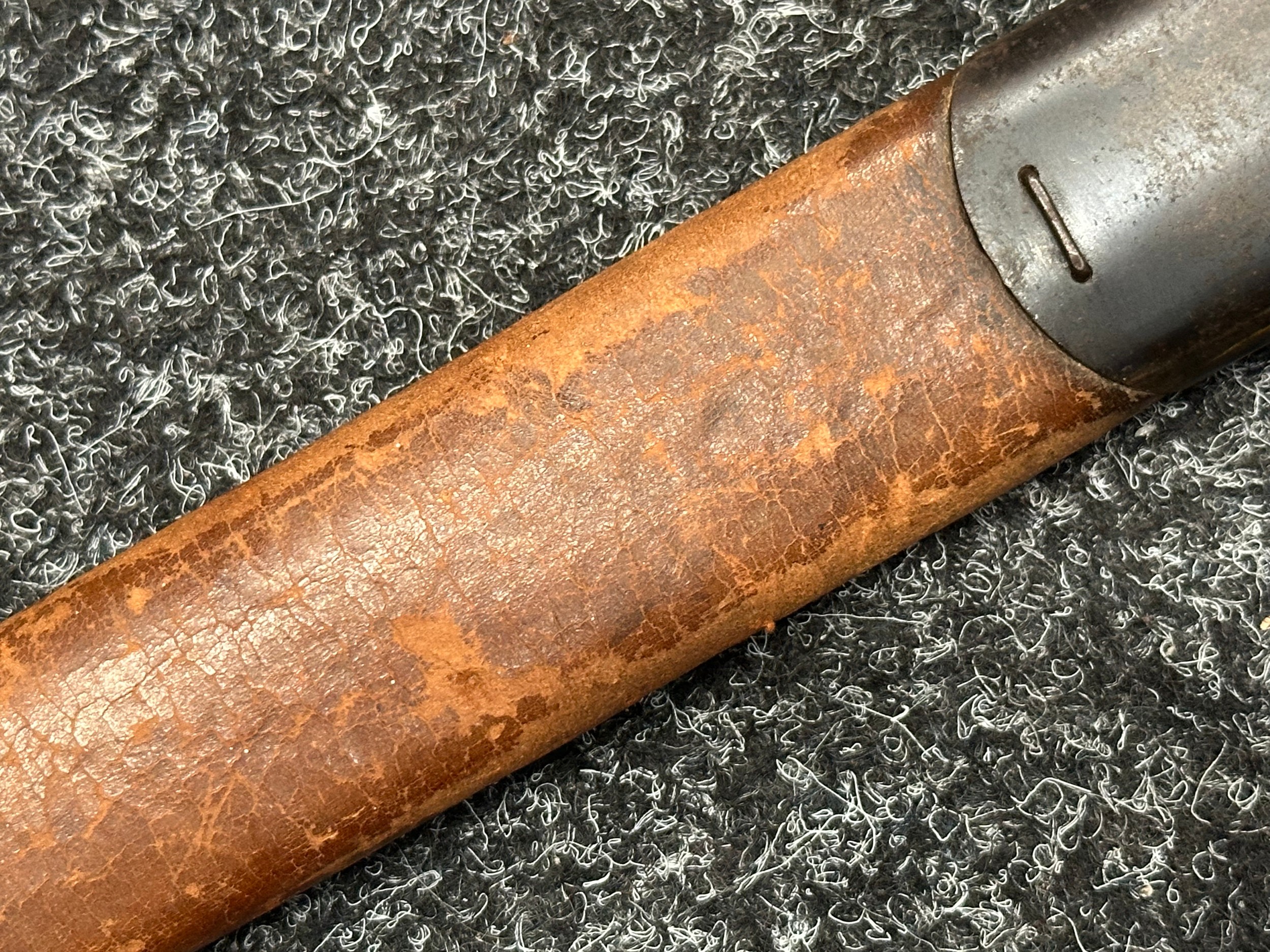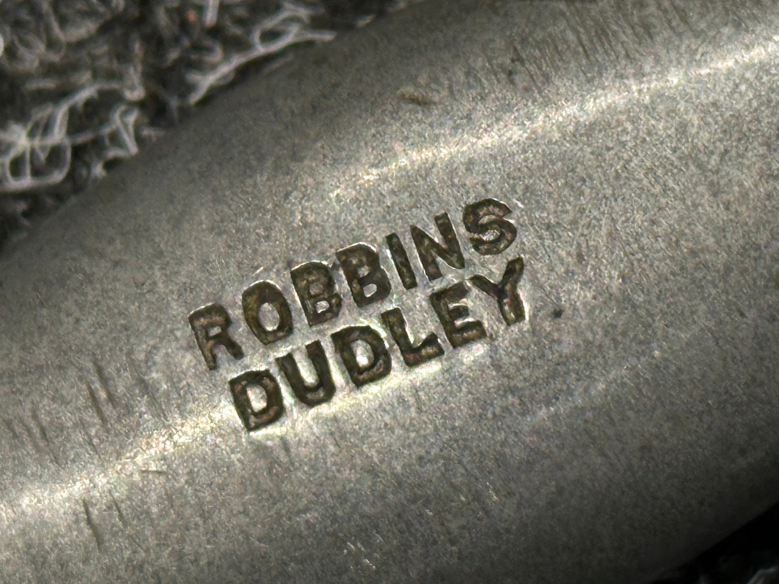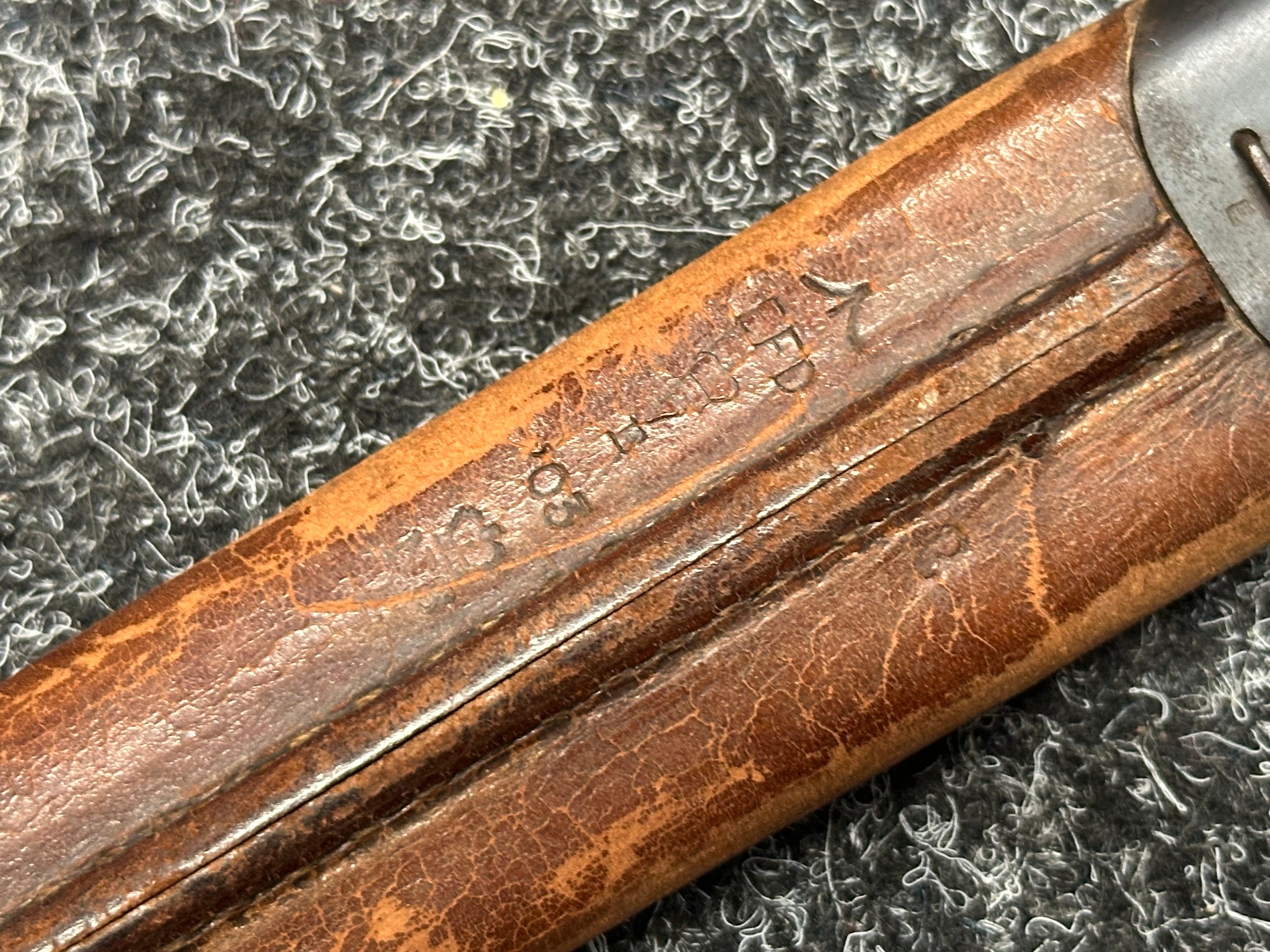 Rare British WW1 Robbins of Dudley Private Purchase Short Sword Fighting Knife. One of the rarest Robbins knives. Double edged blade 290mm in length. Cast alloy grip typical of all Robbins knives impressed with makers name "Robbins Dudley". Overall length 404mm. Complete with 1903 pattern leather scabbard.