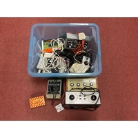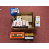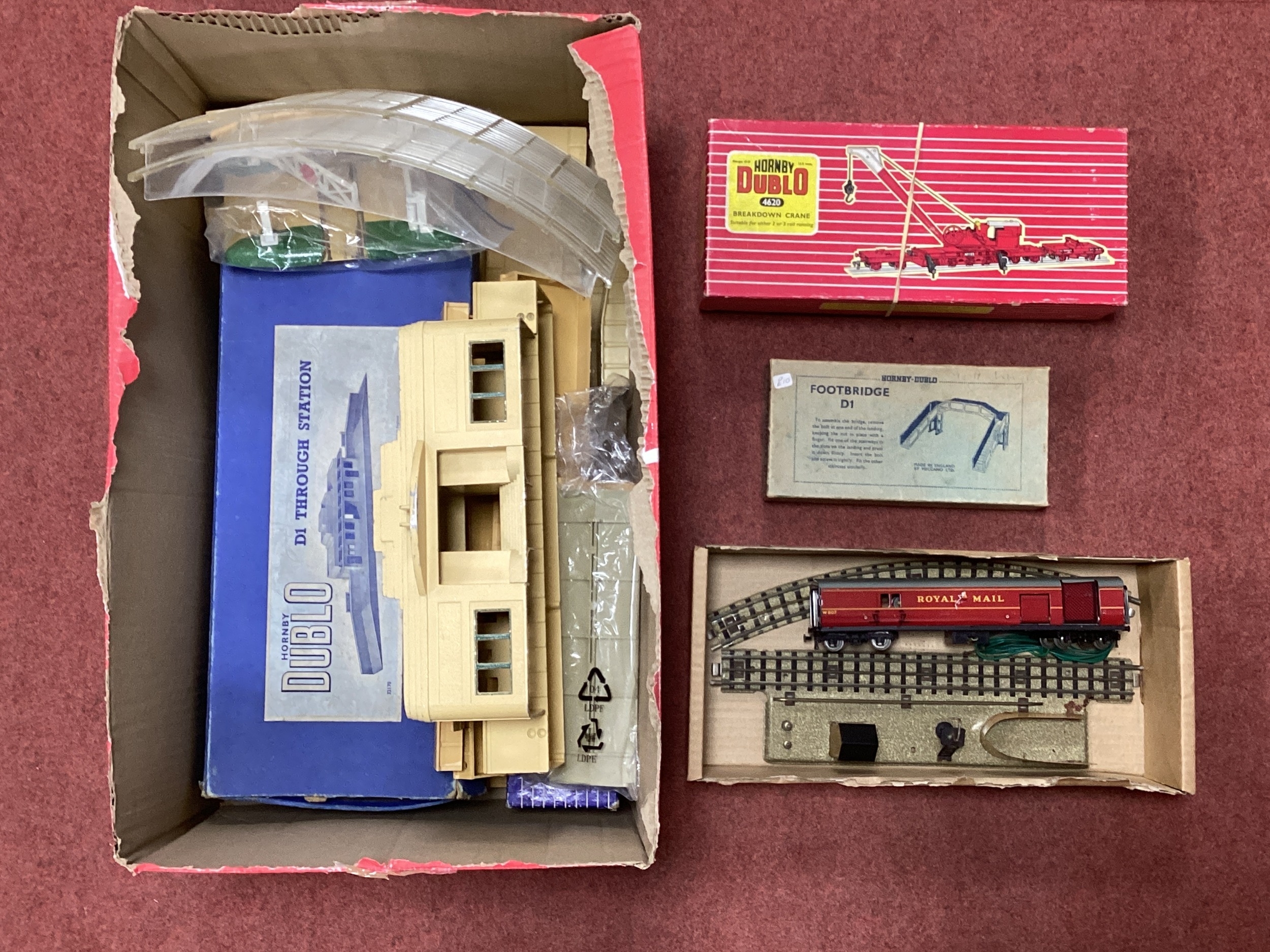 A Box of Hornby-Dublo 'OO' Gauge, including a boxed "Through Station" set, and another unboxed "Through Station", platform sections, a boxed signal cabin, a boxed breakdown crane set, and a three-rail mail coach set.