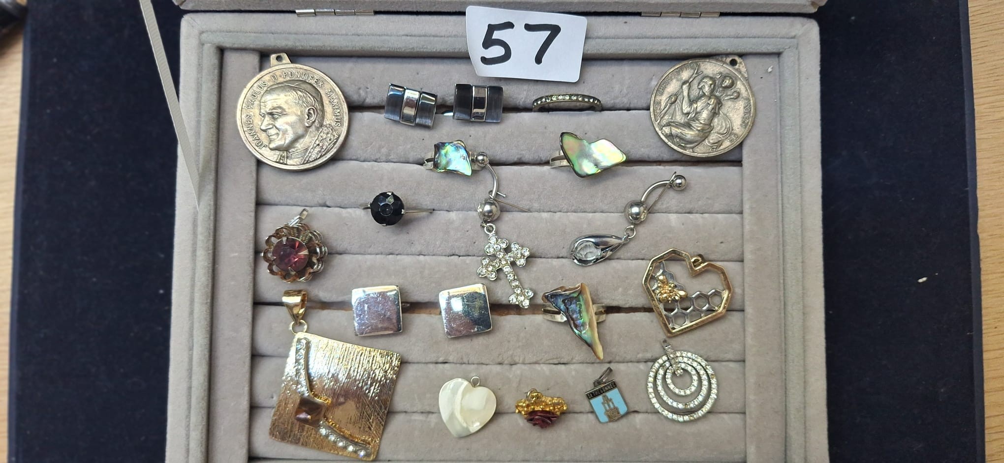 Tray of Medallions, Pendants, Rings and Belly Bar Silver Stones and Abalone