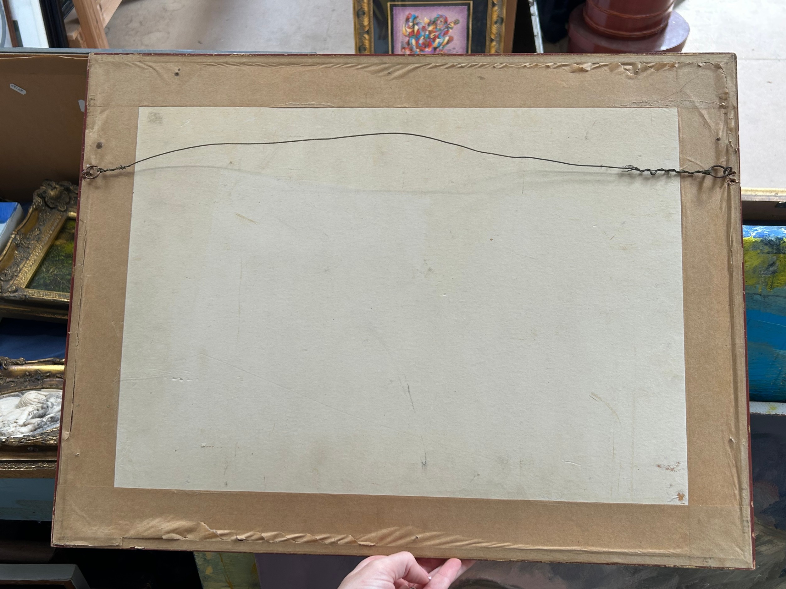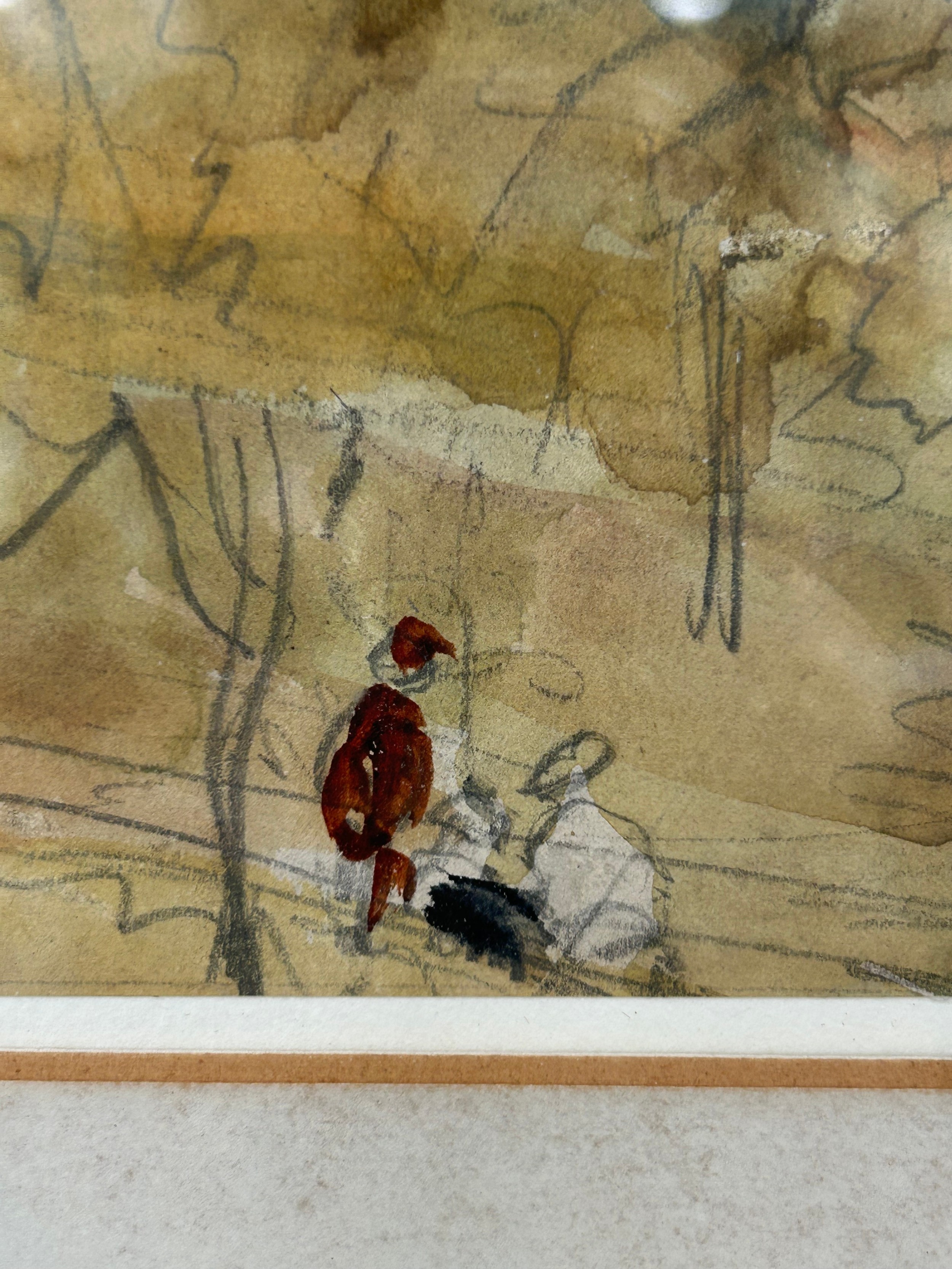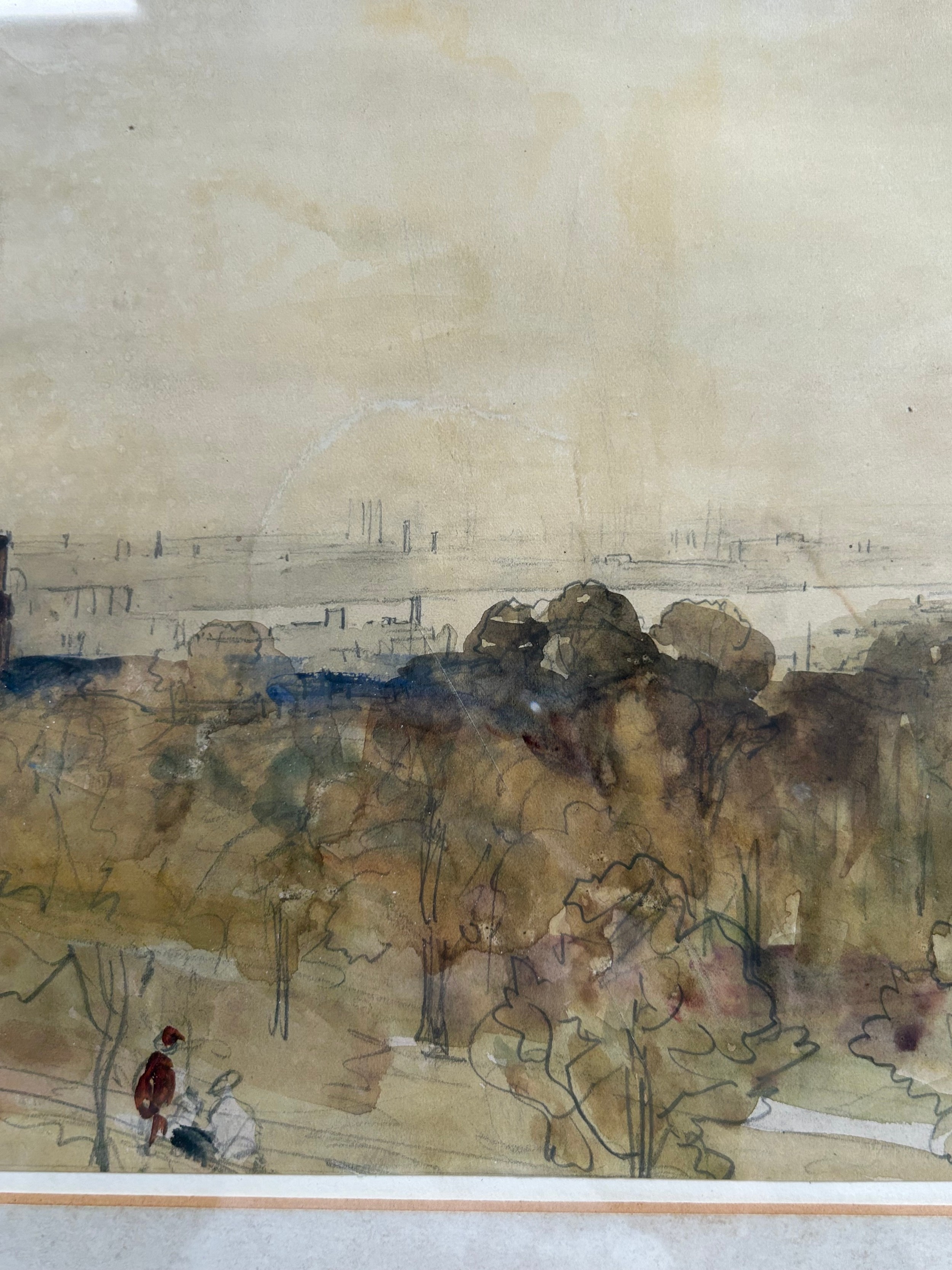 Some discolouration, minor foxing, a couple of creases and rippling, scratch marks. There is a hald circular whit mark just left of centre, and another running upwards from the tallest chimney,