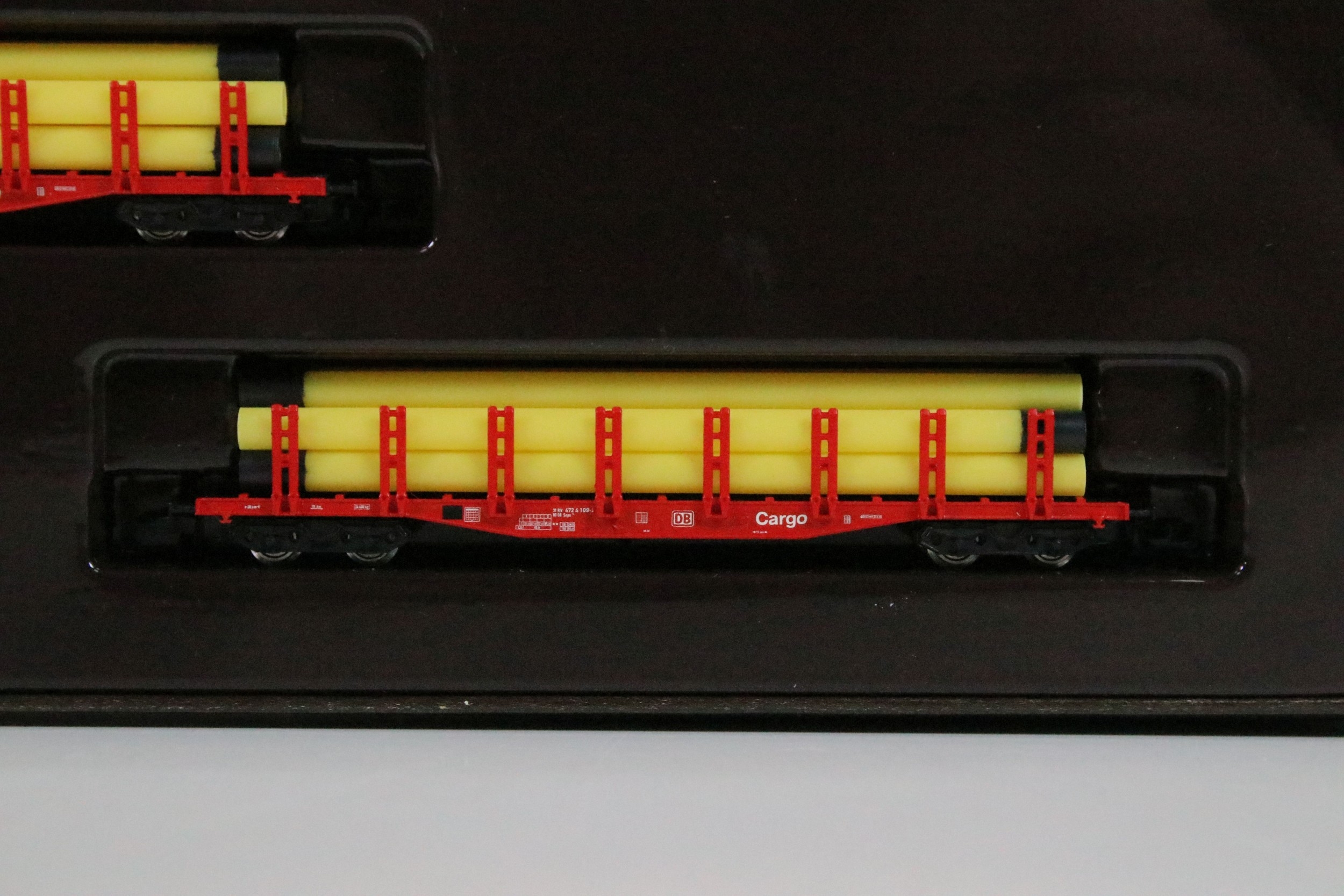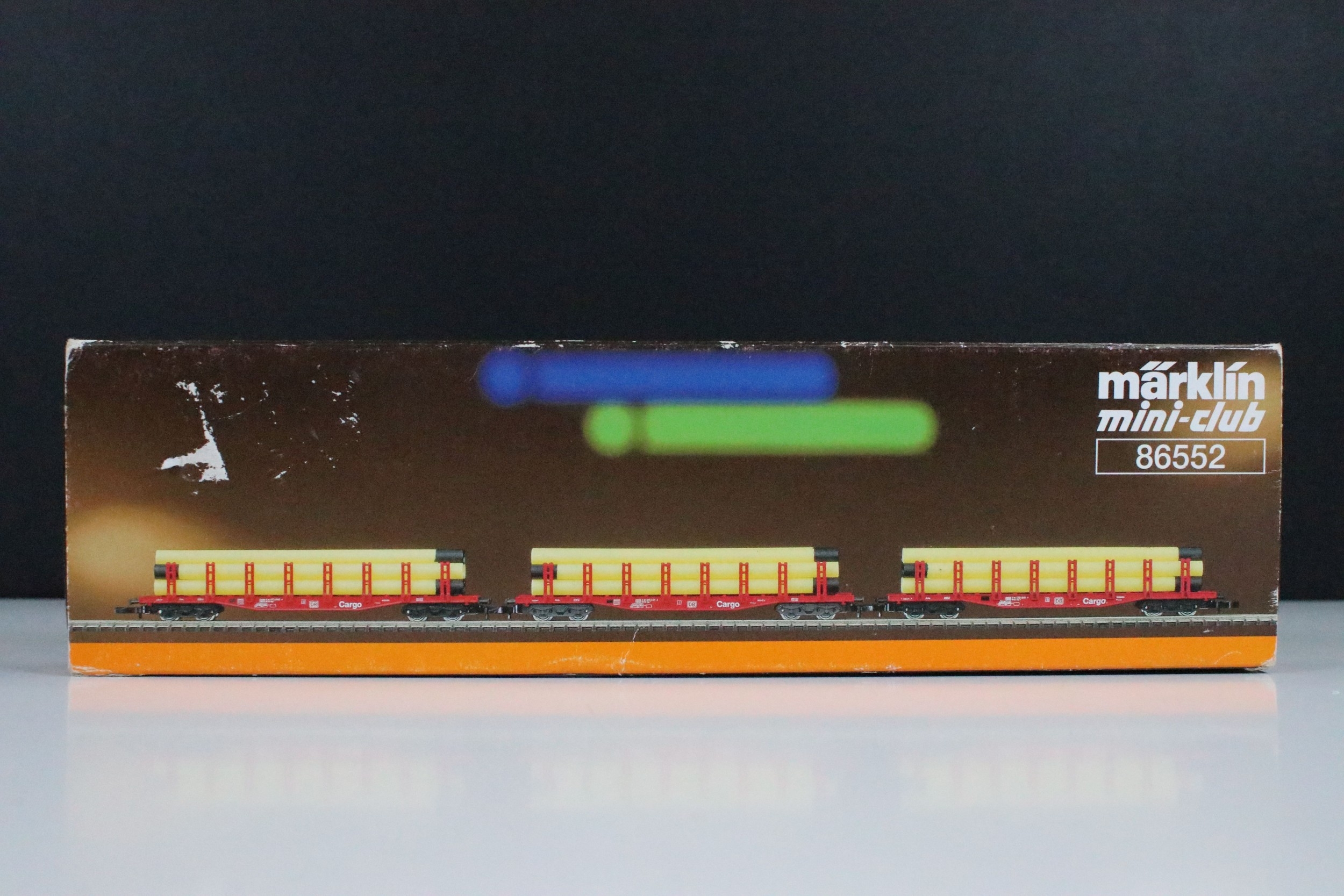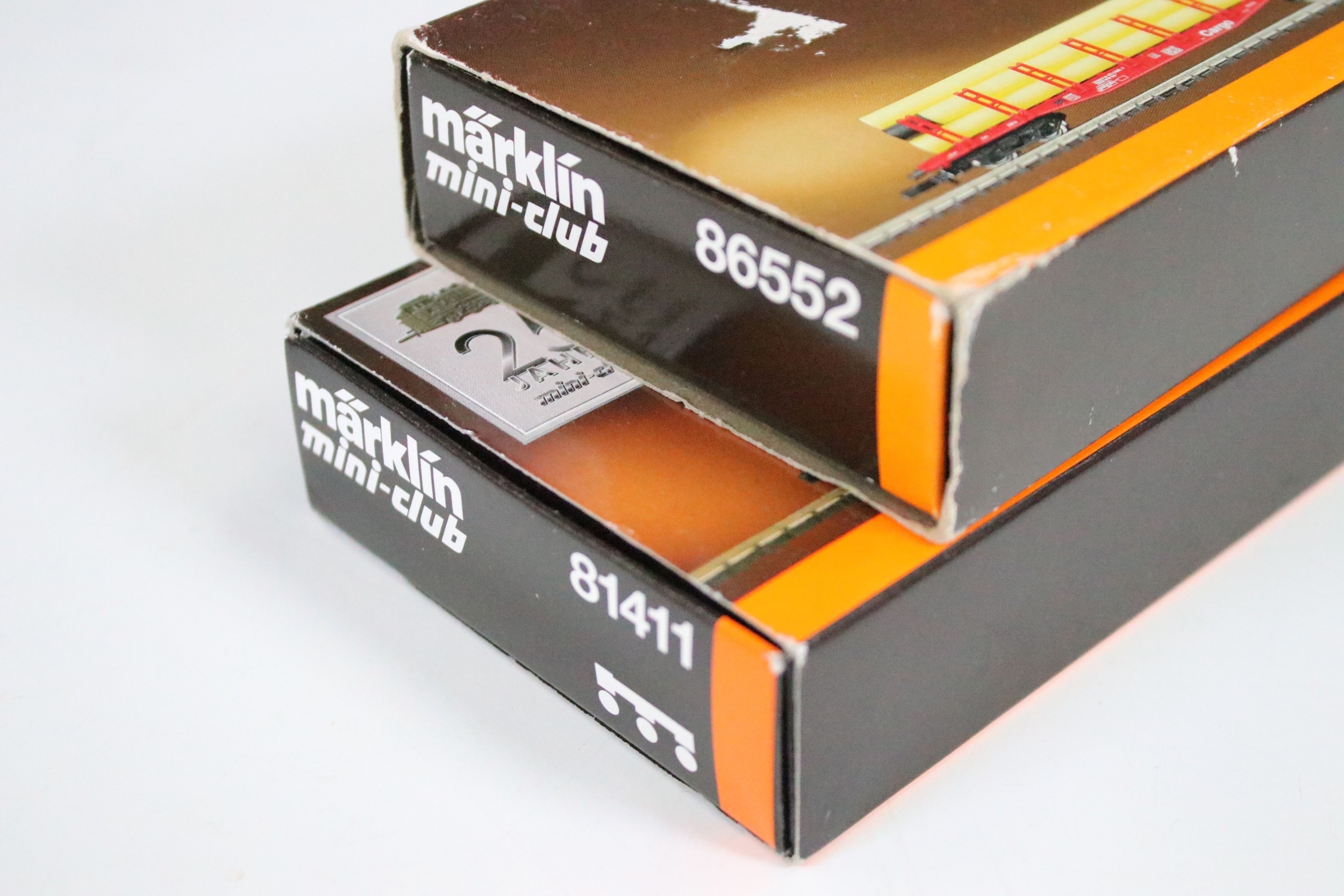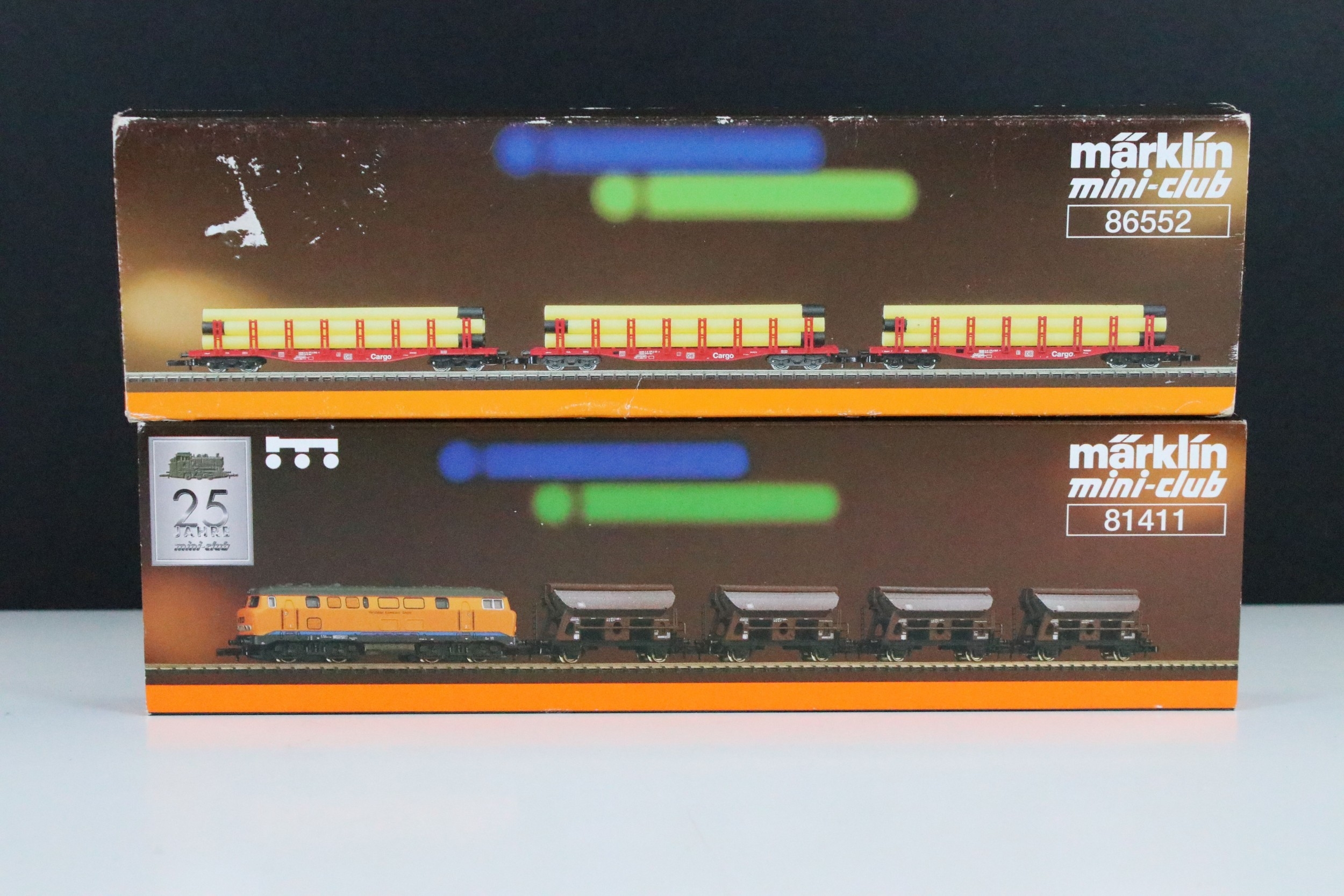 Two boxed Marklin Mini Club Z gauge train packs including 81411 Hopper Wagon Train Pack and 86552 DB Cargo Stake Trucks With Pipe Load Train Pack, boxes showing some light wear