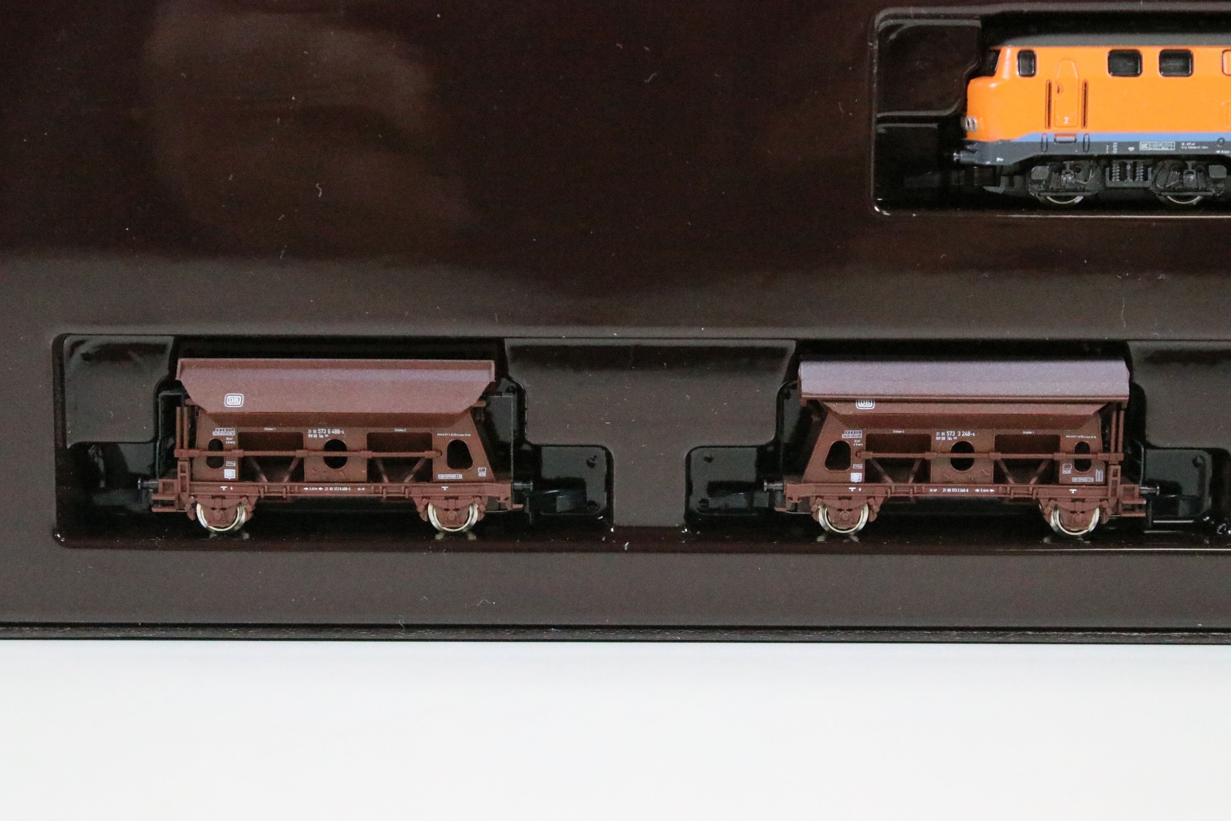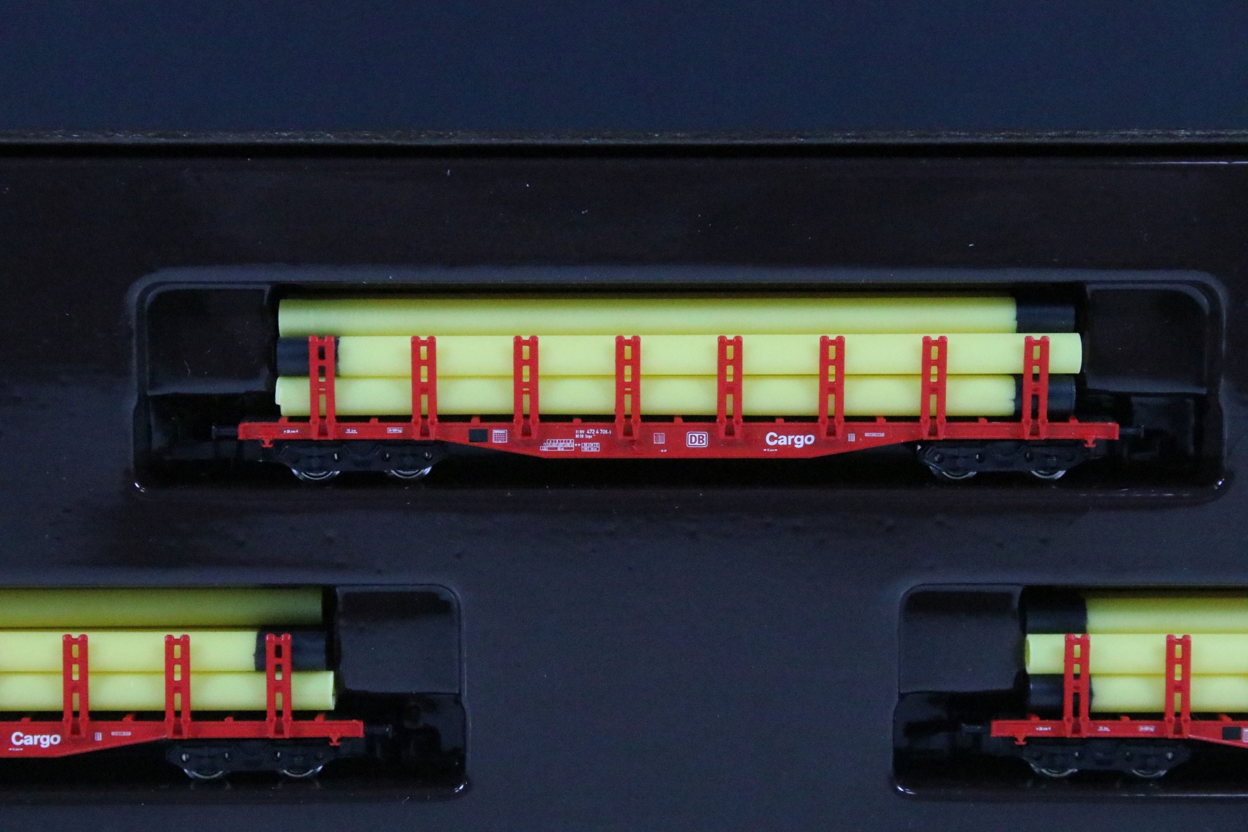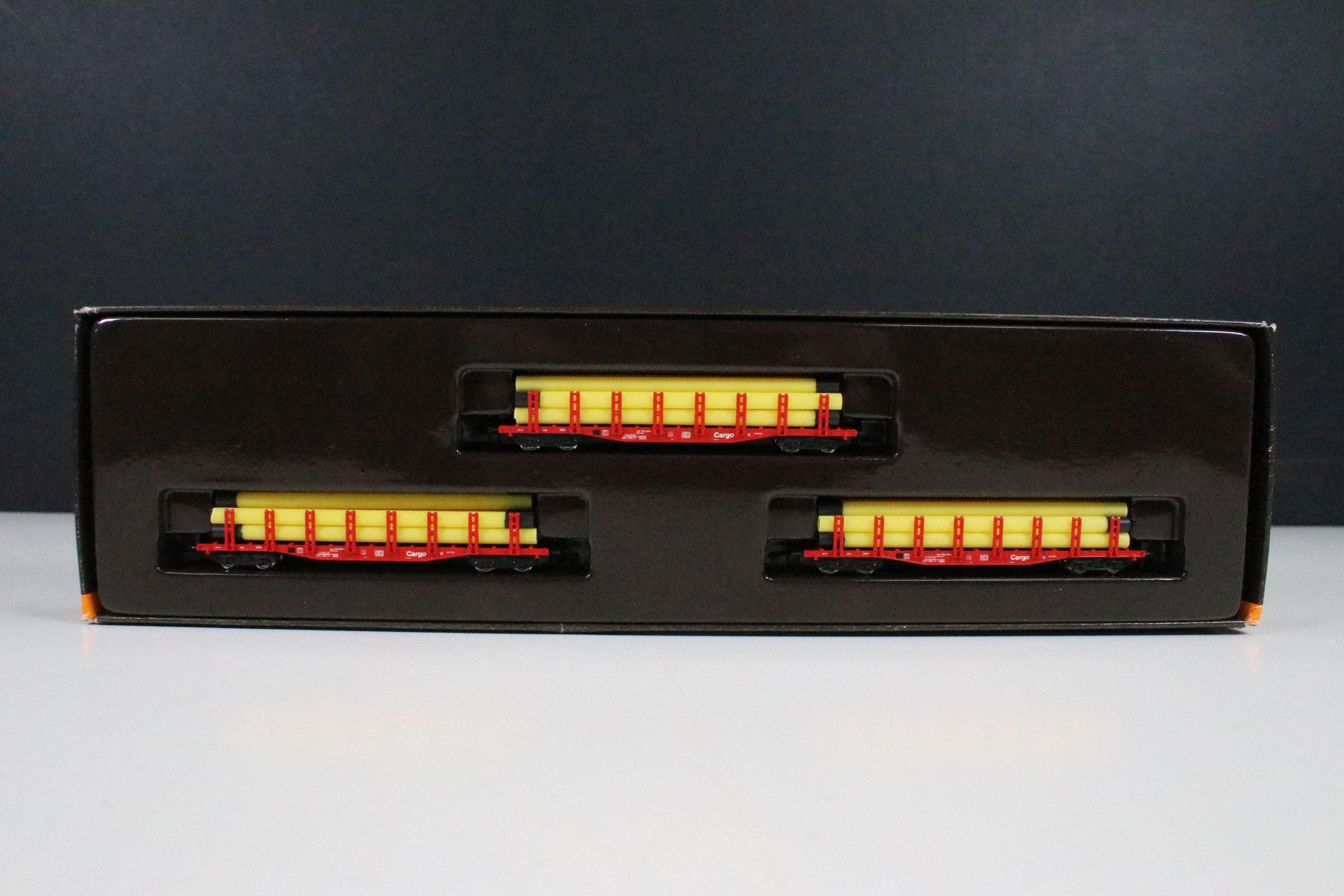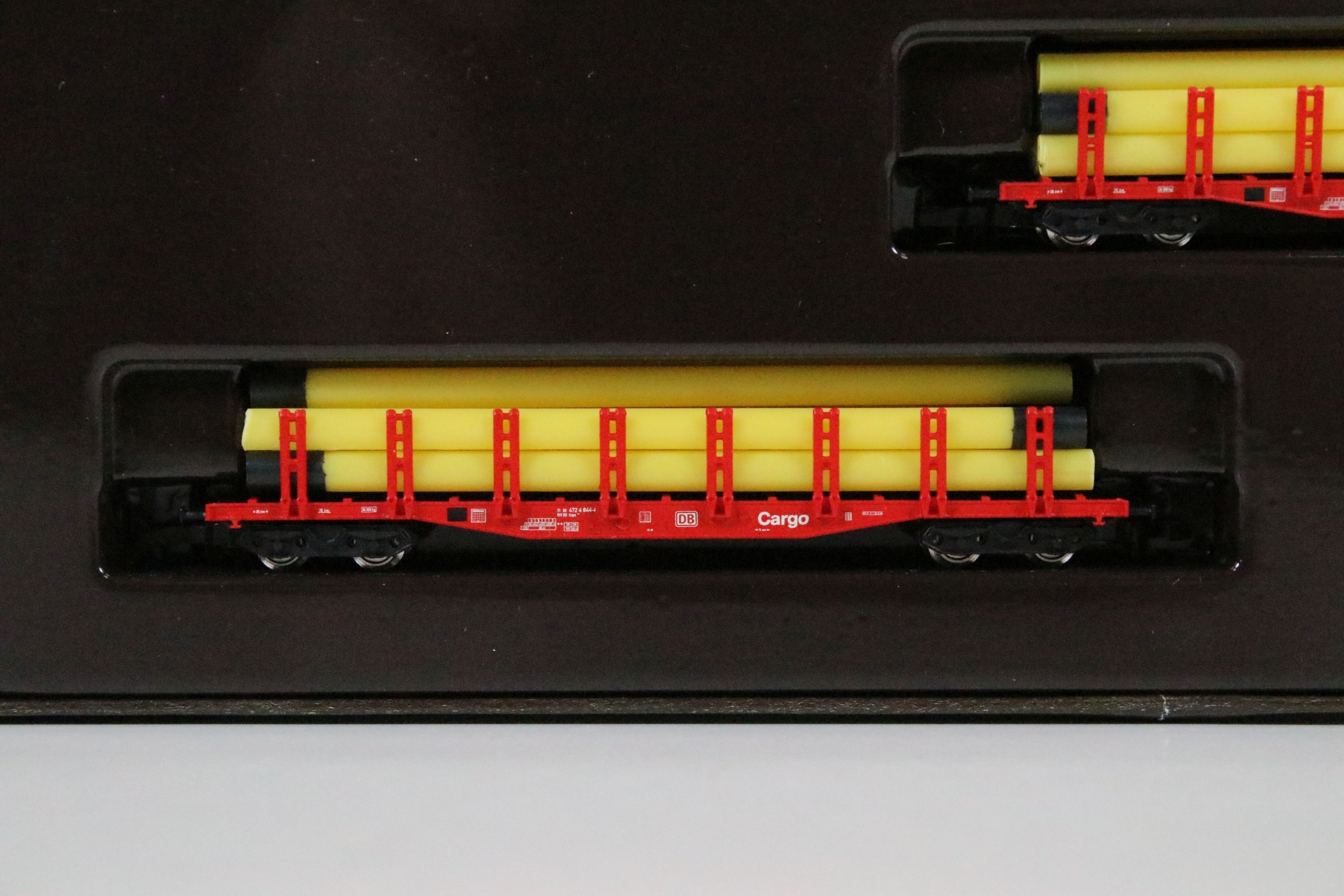 Two boxed Marklin Mini Club Z gauge train packs including 81411 Hopper Wagon Train Pack and 86552 DB Cargo Stake Trucks With Pipe Load Train Pack, boxes showing some light wear