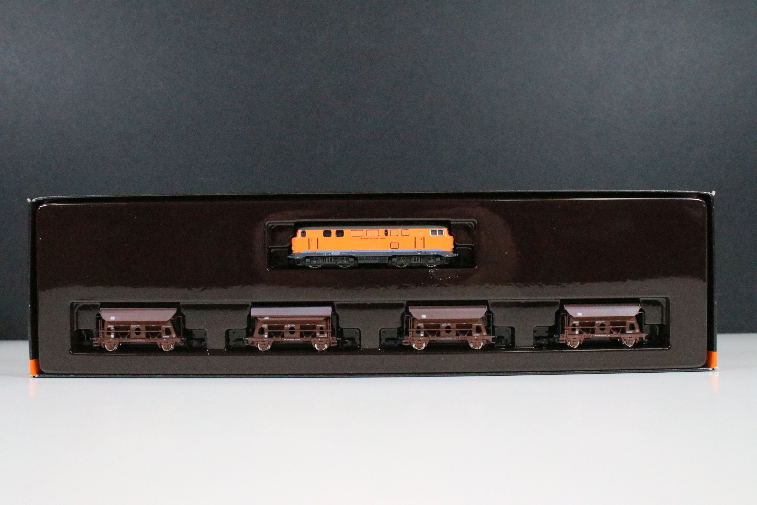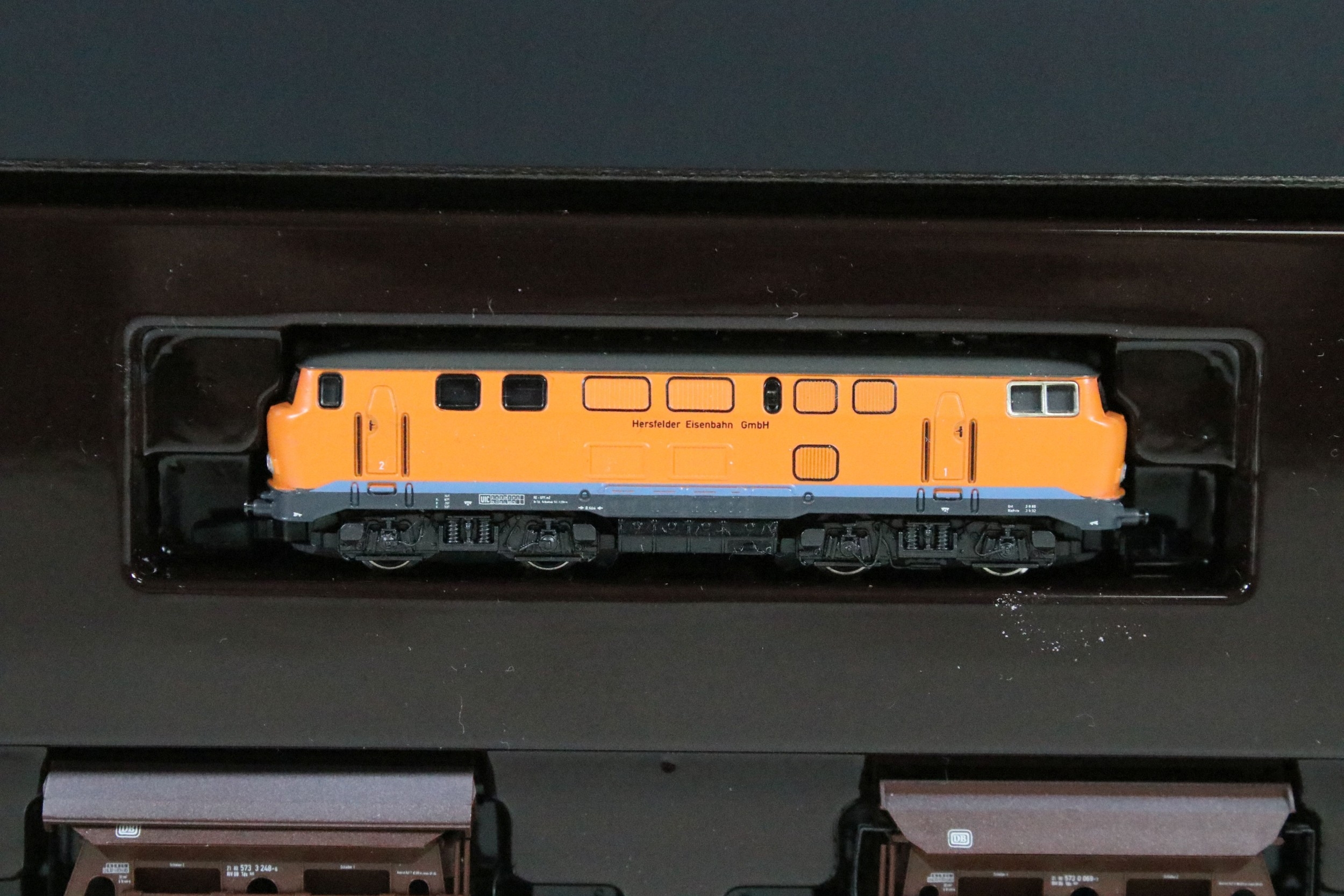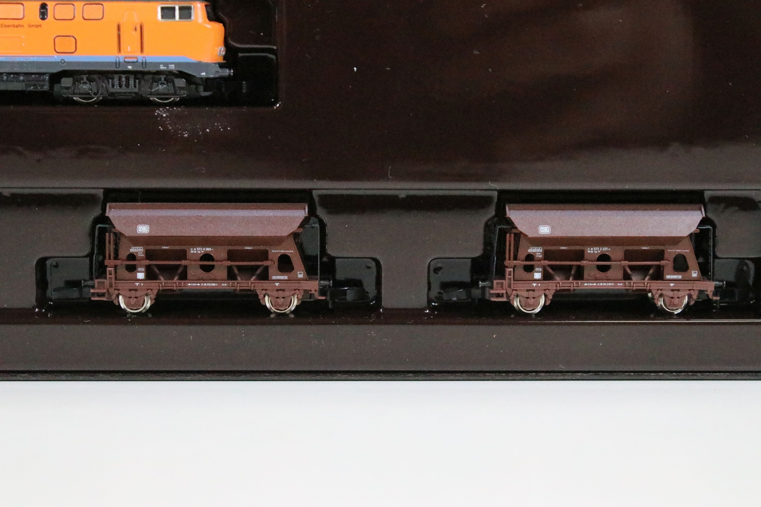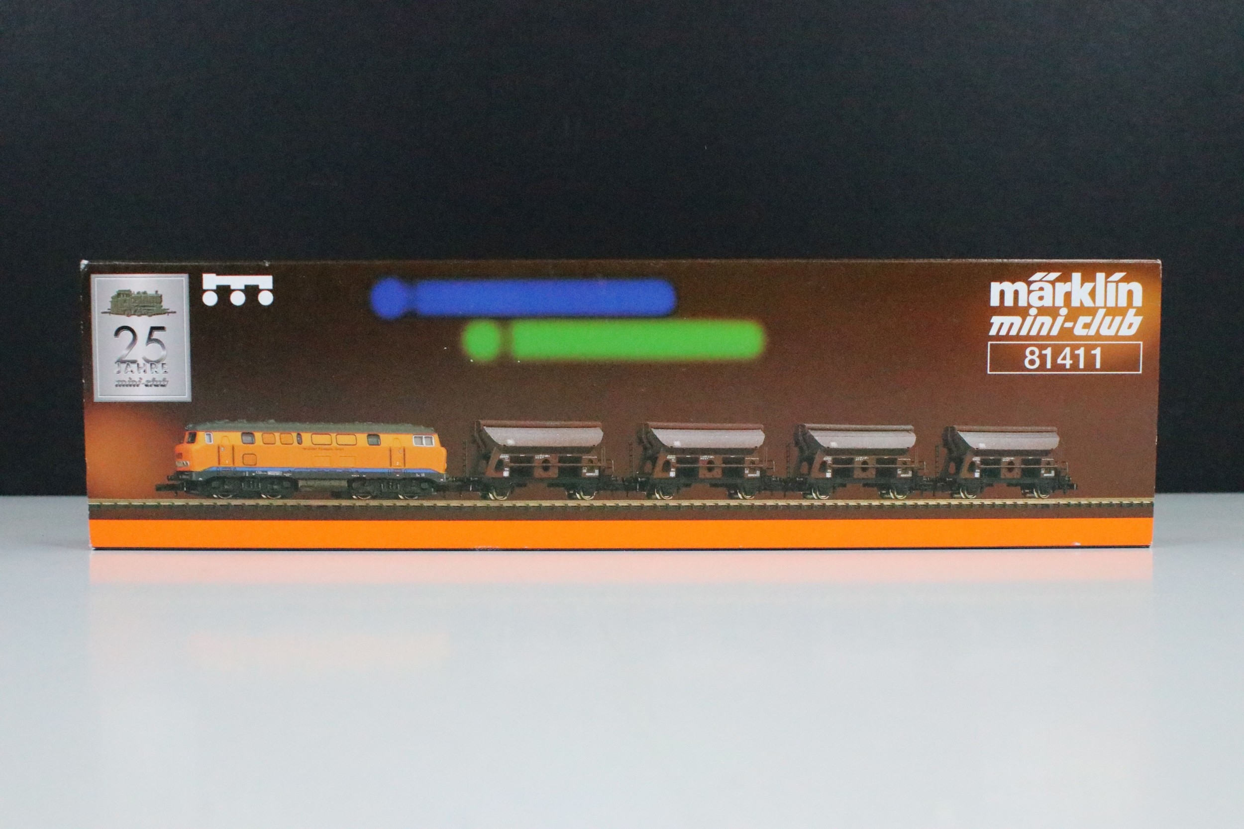 Two boxed Marklin Mini Club Z gauge train packs including 81411 Hopper Wagon Train Pack and 86552 DB Cargo Stake Trucks With Pipe Load Train Pack, boxes showing some light wear