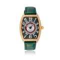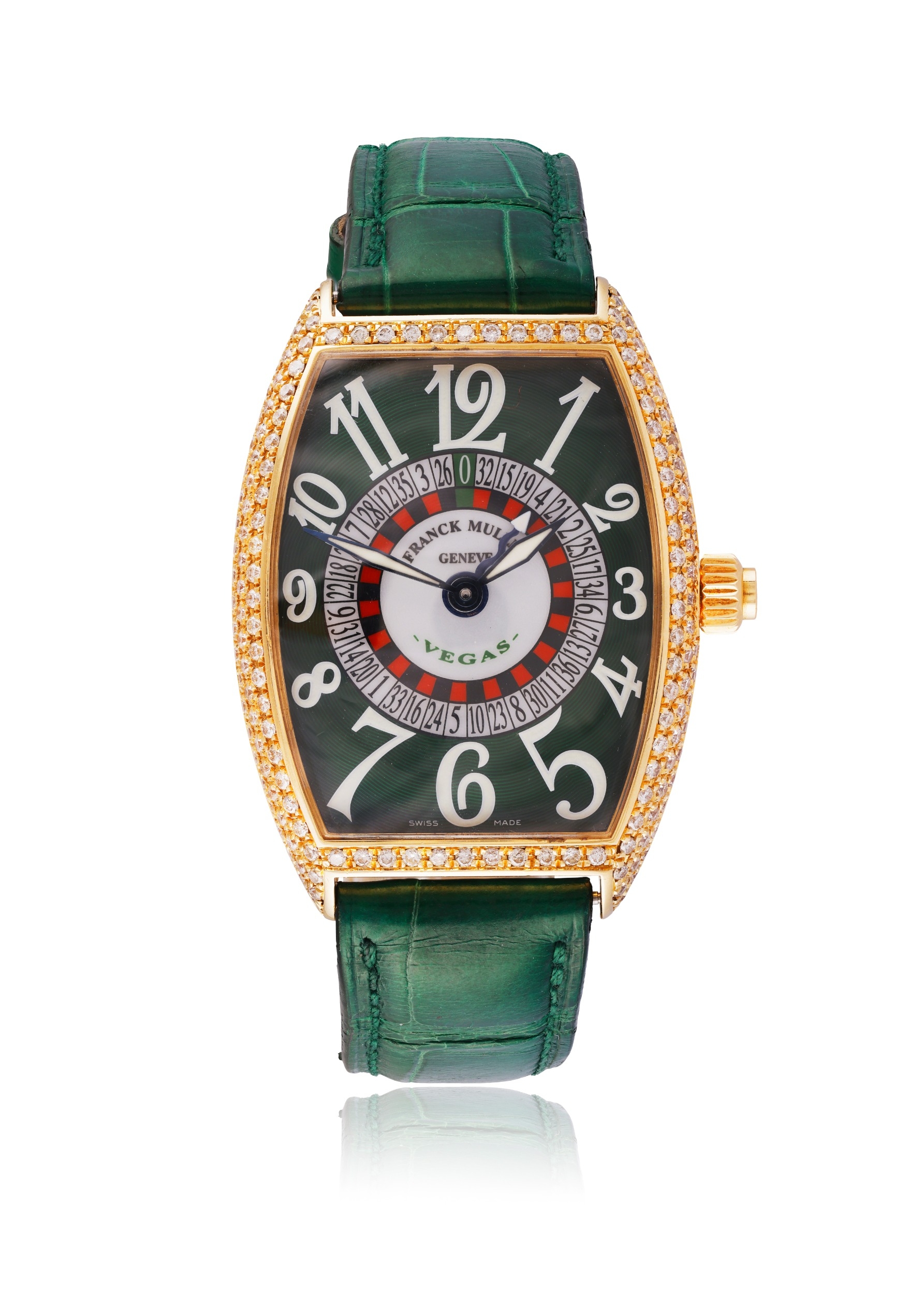 Bracelet/Strap: Green leather Franck Muller strap with original 18K yellow gold and diamond-set Franck Muller pin buckle