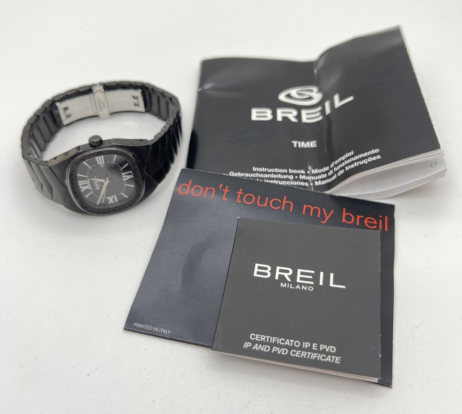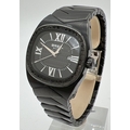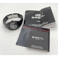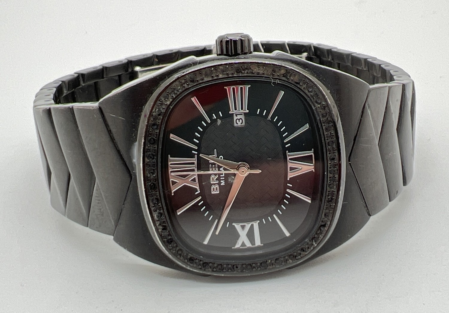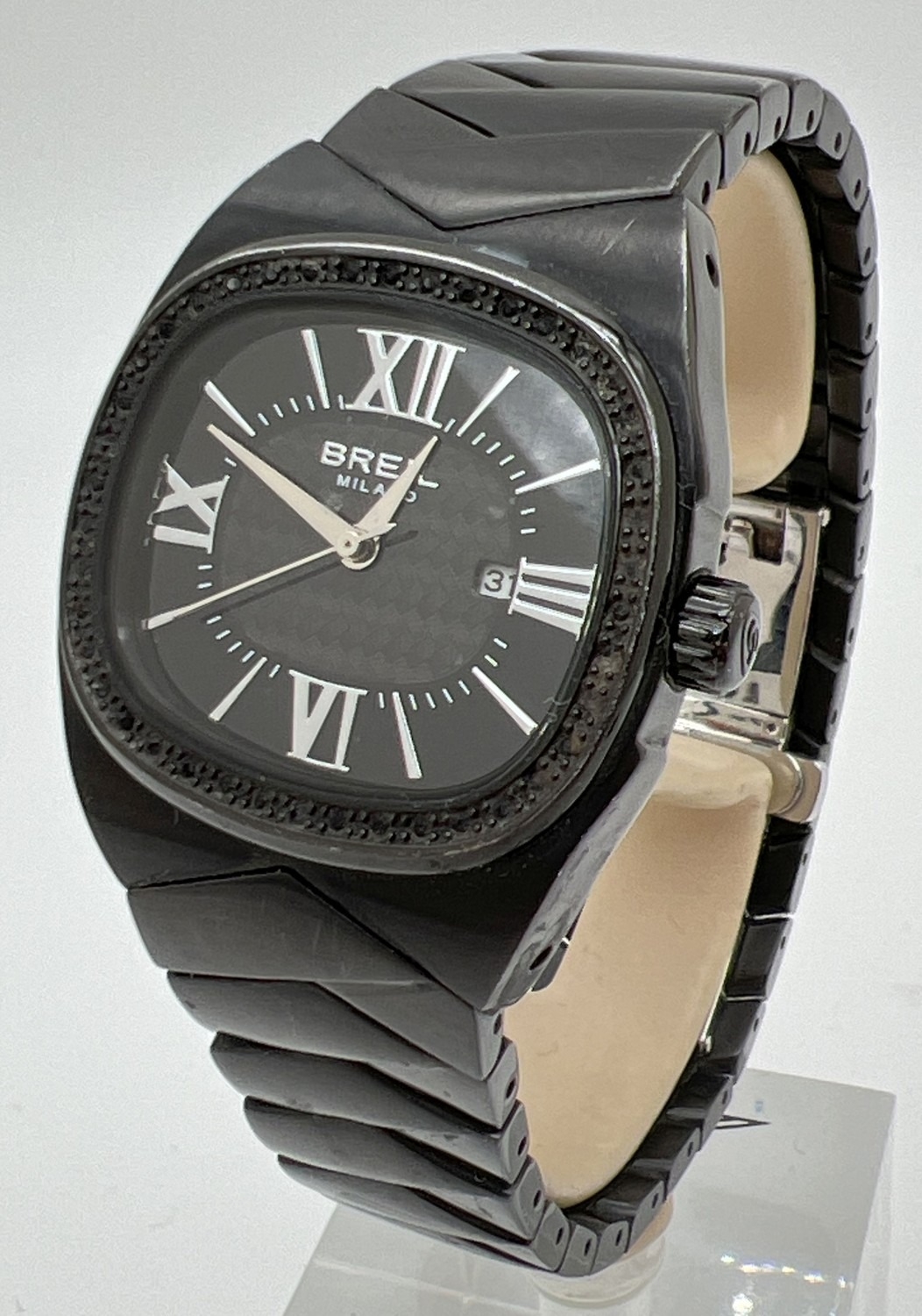 A Women's BW0289 wristwatch by Breil. Black stainless steel case and strap. Illusion stone set case with black face and silver tone hour markers and hands. Black weave design to centre of face. Seconds and date function. In working order with instruction booklet.