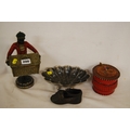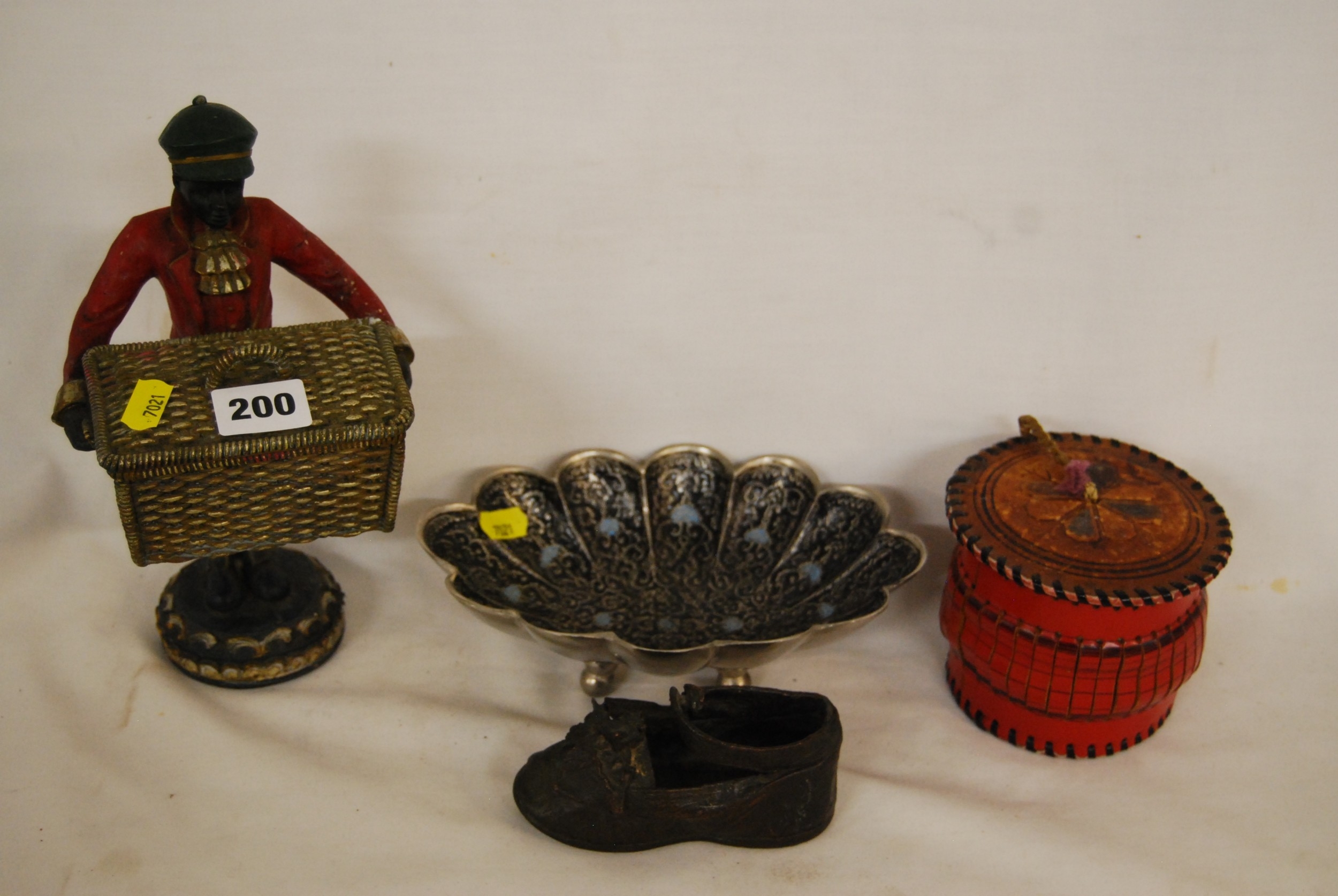 FIGURE OF PORTER CARRYING A BASKET, METAL DISH, LEATHER BOX AND METAL SHOE