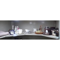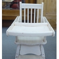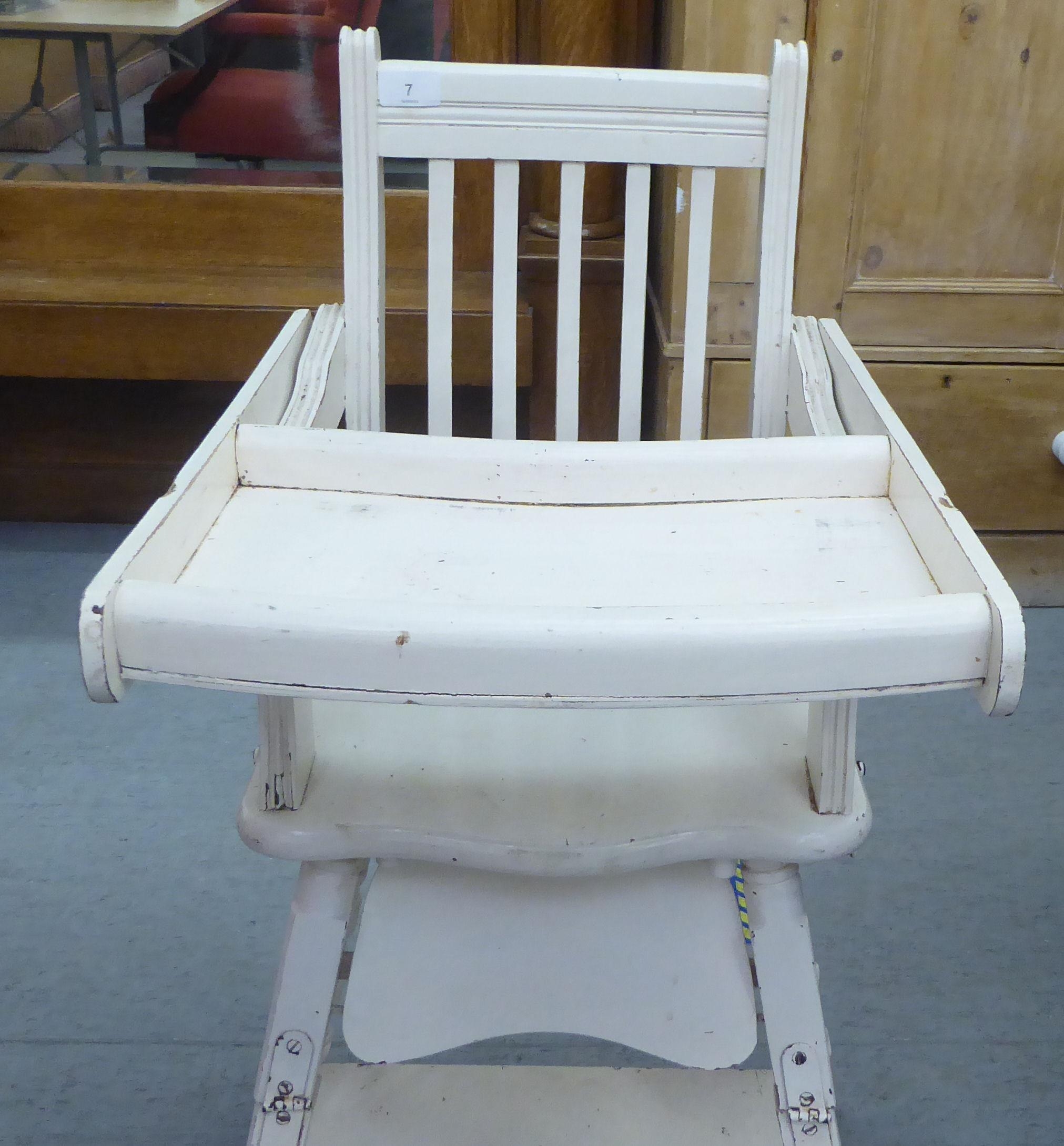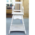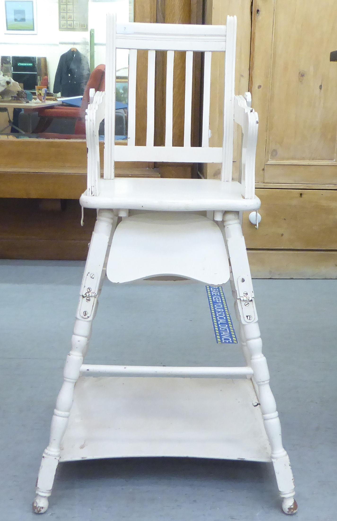 An Edwardian and later painted wooden highchair, the rising tray action top on turned legs, united by a platform undershelf