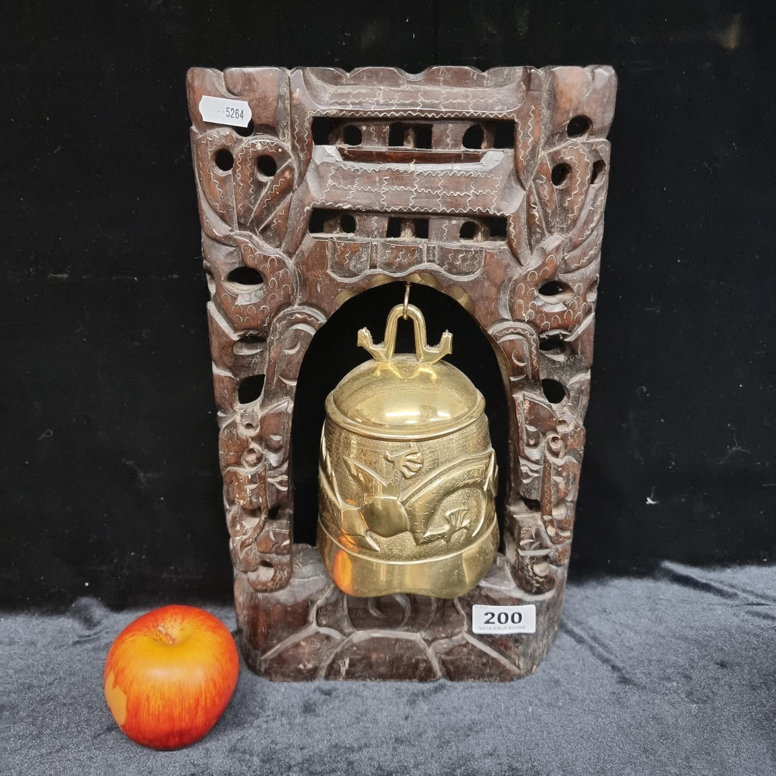 A vintage Chinese brass metal dragon bell with an inlayed silver rosewood frame hanger, intricately carved lovely piece. Mm: 38cm x 22cm.