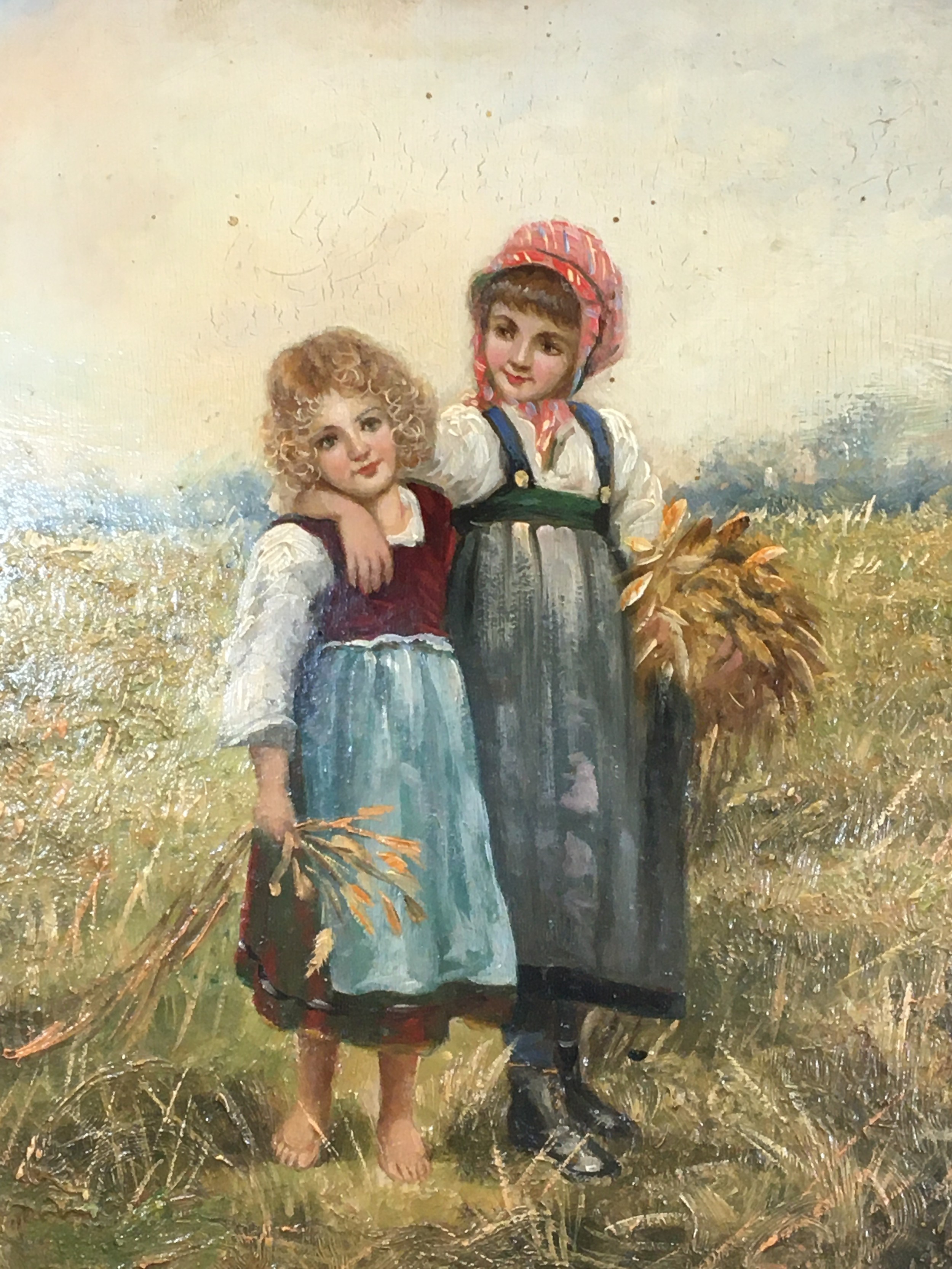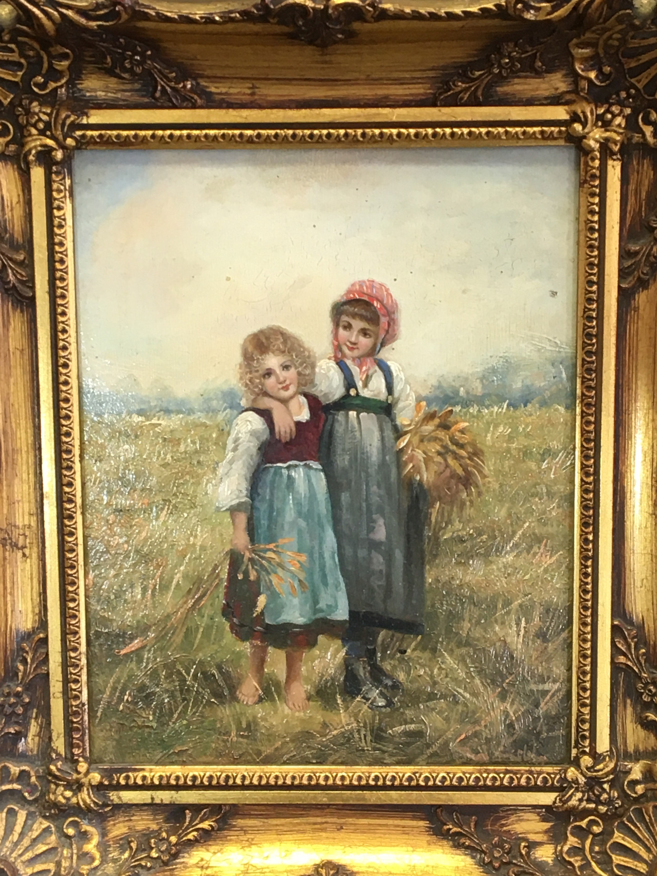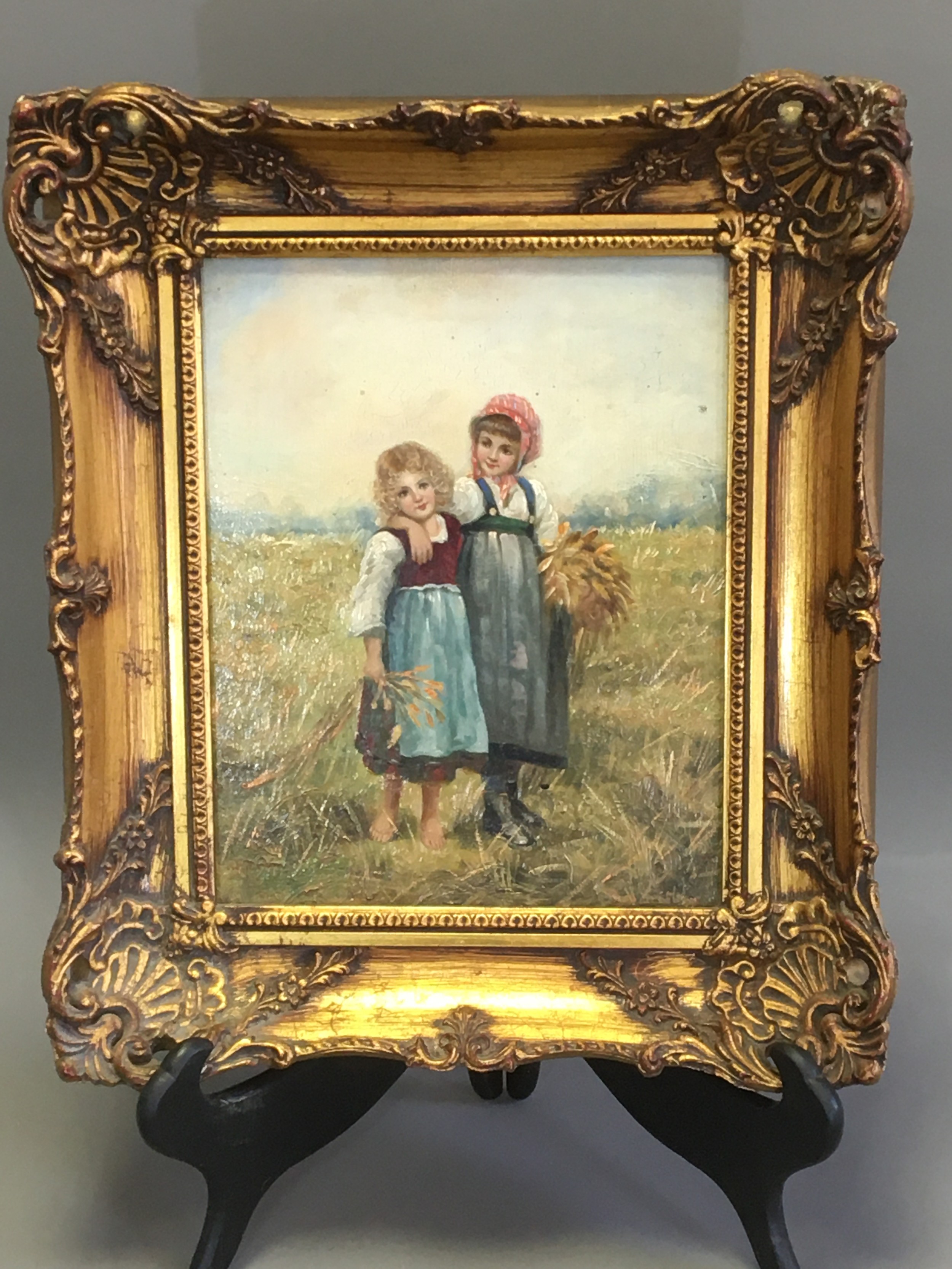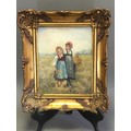 Early 20th Century Oil on Panel "Loving Sisters" indistinctly signed lower R/H. Gilt Framed (Later). H 36cm x W 31cm