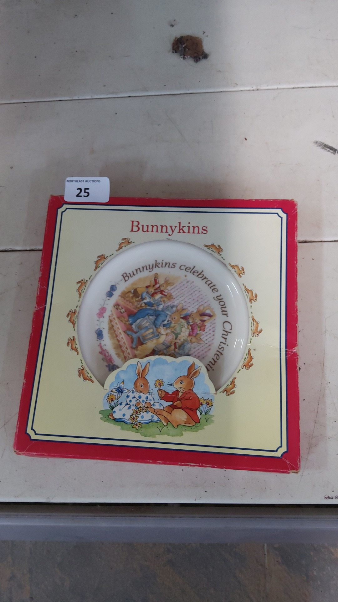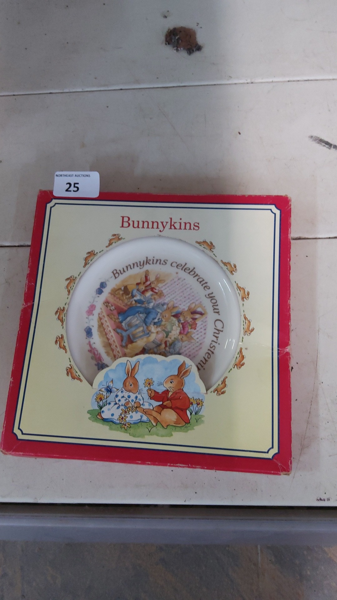 A boxed Royal Doulton Bunnykins child’s plate, decorated with rabbits and the caption “Bunnykins celebrate your Christening”.