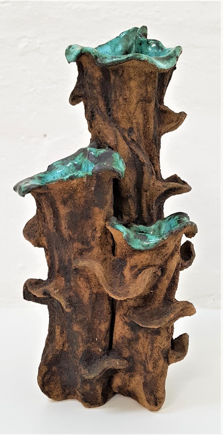with three brown bark sections with blue interiors stems, the base with impressed mark, 25cm high