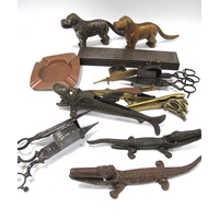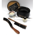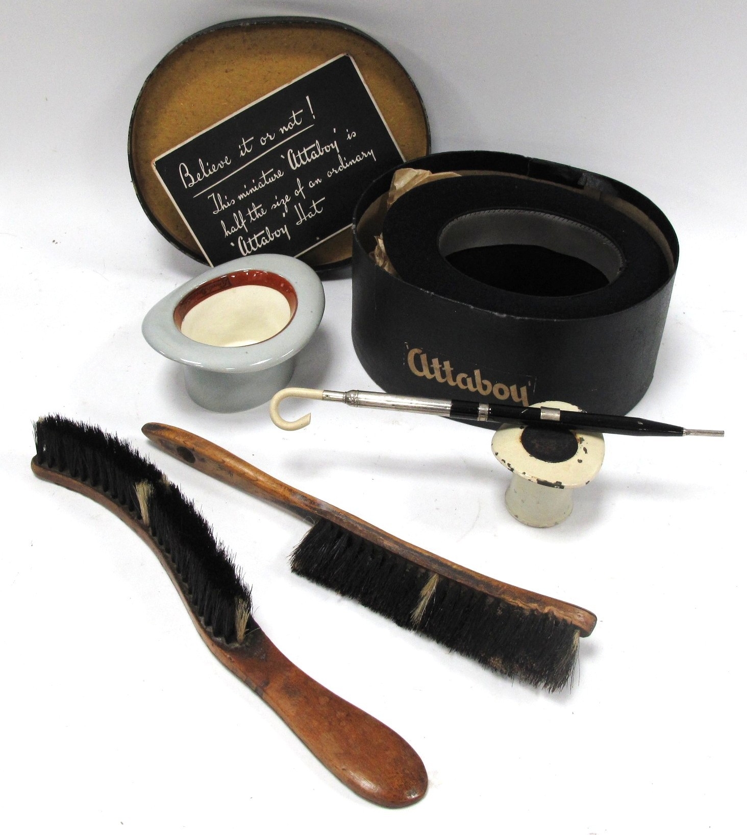 Attaboy Half Size Model of an Attaboy Hat, in box, pottery hat posy. Writing pen/inkwell as a top hat and brolly. Two advertising hat brushes.