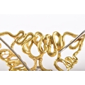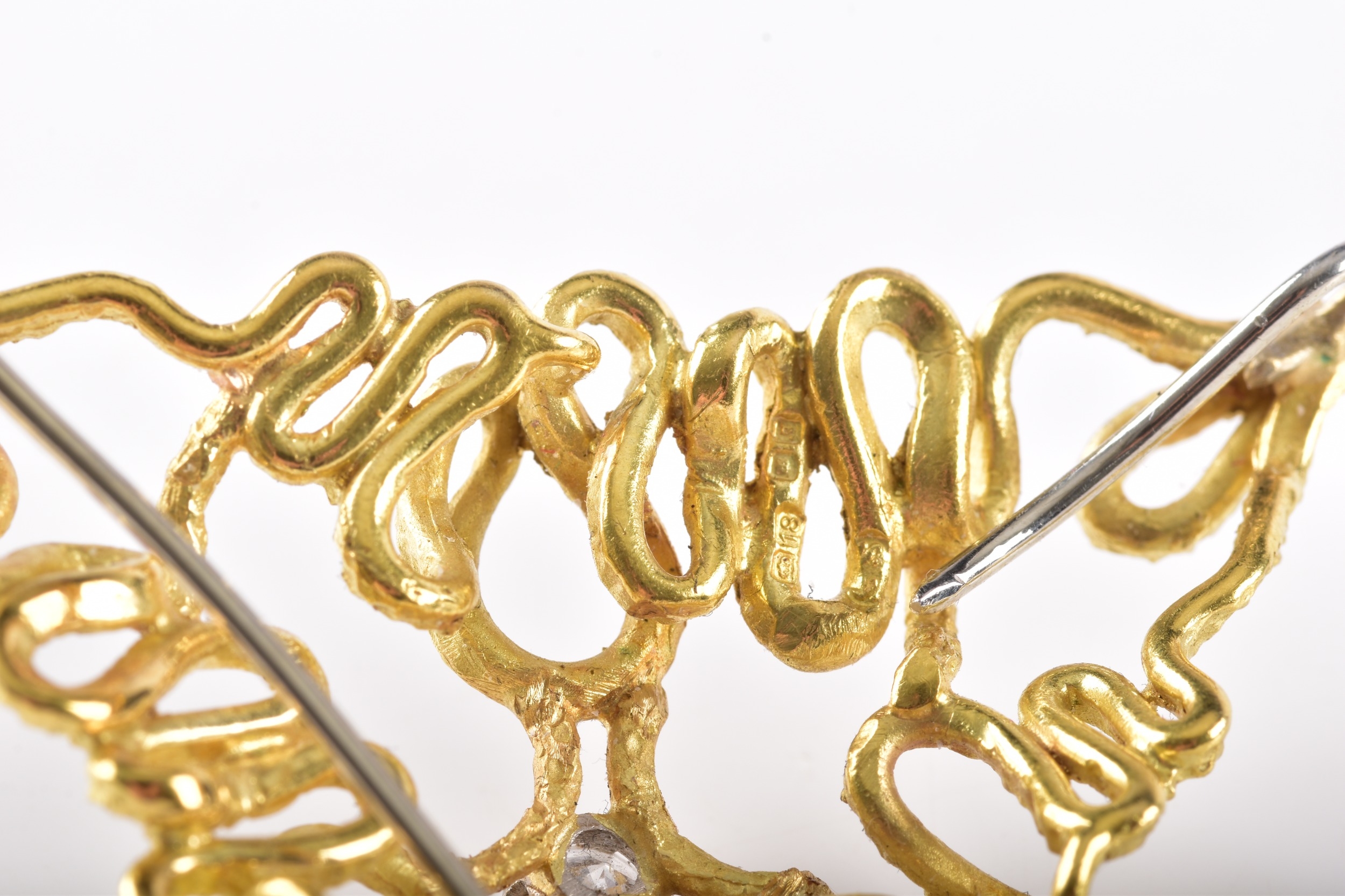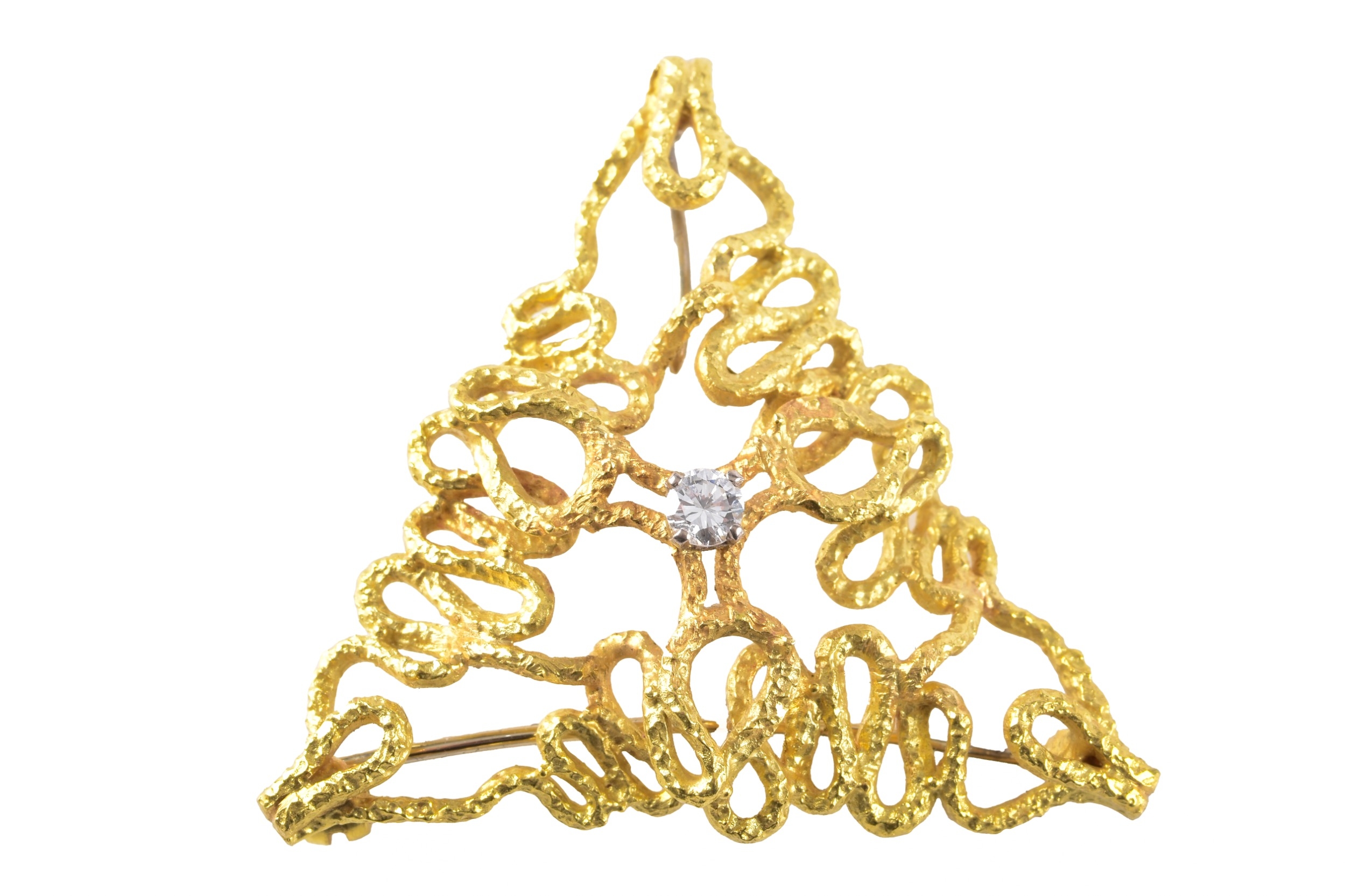 An 18ct gold brooch of triangular openwork design, formed of textured scrolling wirework, centred with a single round brilliant cut diamond with an approximate weight of 0.20 carats, with pin and safety clasp fitting, hallmarked for London 1973, 4.4 cm width.