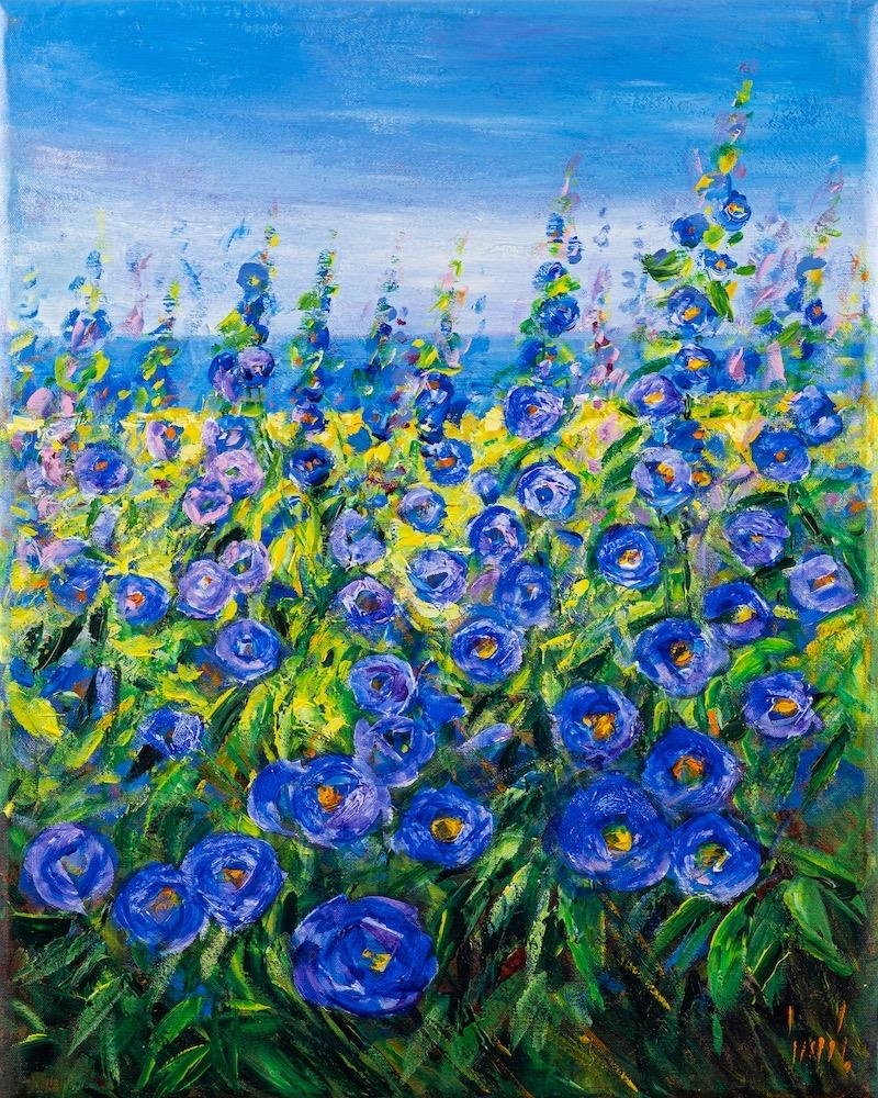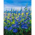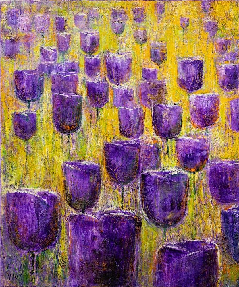 Carl Scanes [British, b. 1964] Purple Tulips 2, 2004/ Delphiums 3, 2003 each signed and inscribed to reverse oils on canvas 61 x 51cm and 51 x 41cm respectively, (2, unframed)