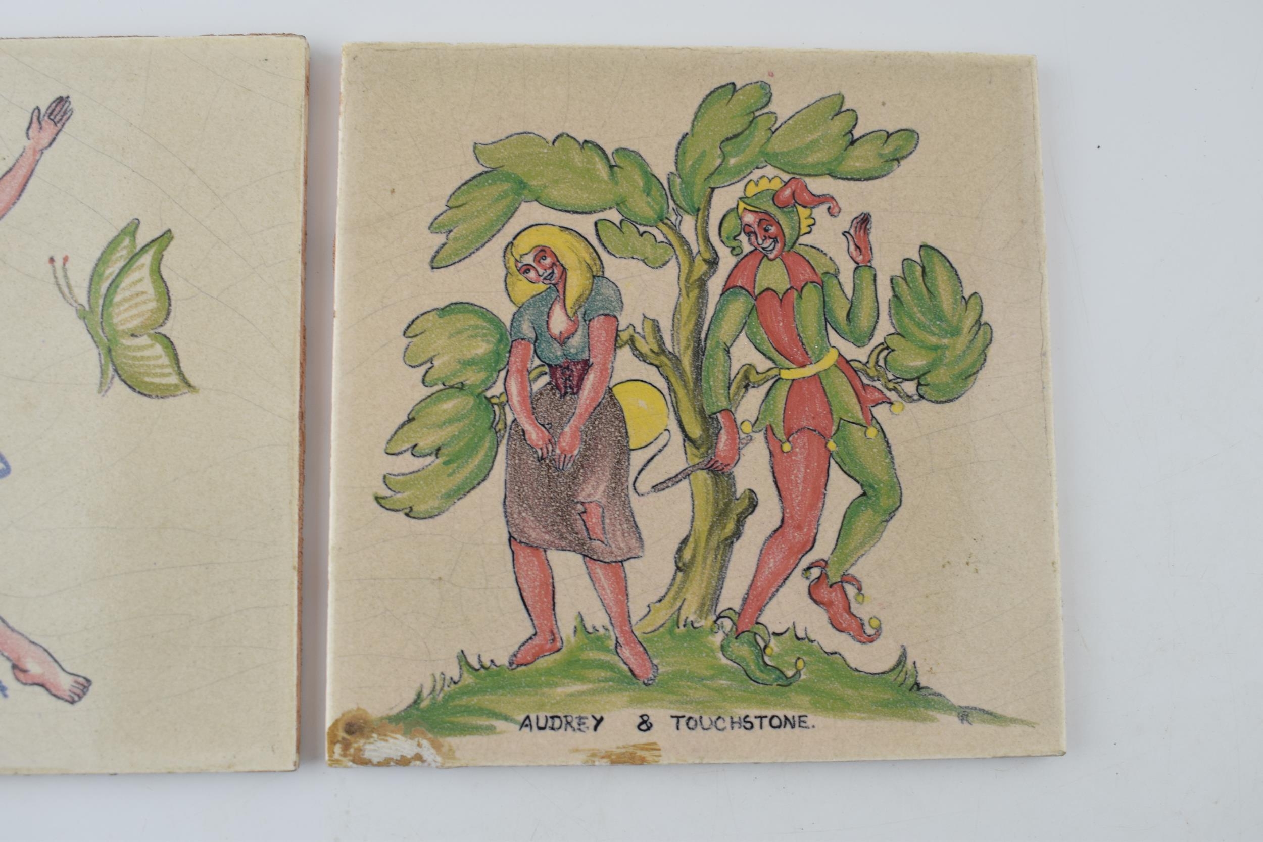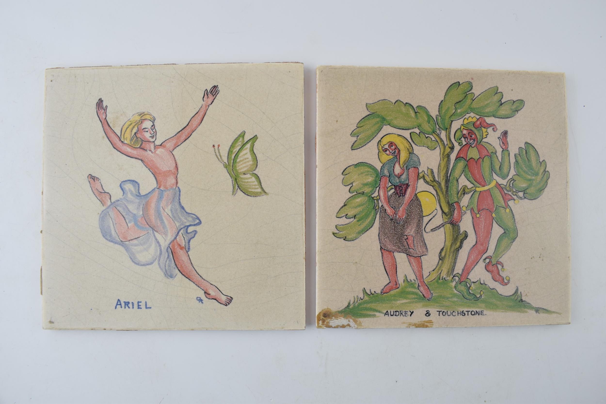 Two 6" Pilkington hand-painted Shakespeare Characture tiles, Ariel and Audrey & Touchstone. (2)