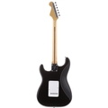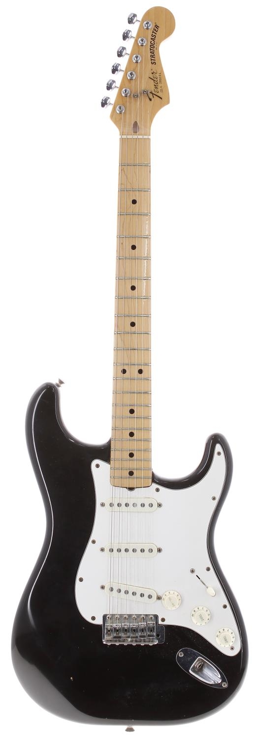 1982 Fender Dan Smith Stratocaster electric guitar, made in USA; Body: black finish, light dings and surface scratches otherwise acceptable for age; Neck: maple; Fretboard: maple; Frets: mild wear; Electrics: working; Hardware: good; Case: 1970s Fender orange lined hard case; Weight: 4.19kg; Overall condition: good for age